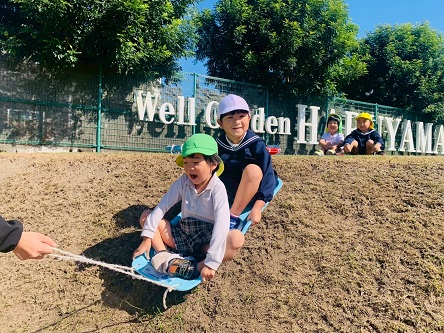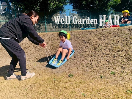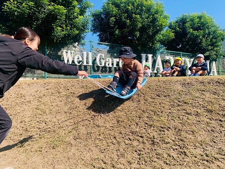芝生広場で草そりとキックバイクを行いました! かなりの急斜面でしたが、「楽しい~!」と笑顔いっぱいの子どもたち♪ バランスを取りながら上手に滑ることができましたよ☆ その後はキックバイクで坂を下りました! 両足を上げて一気に下ったり、足でブレーキを掛けながら下ったりするなど子どもたち自身で下り方に違いが見られましたよ! 最後まで元気いっぱいのとらグループさんでした♪