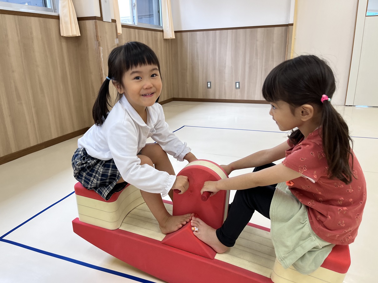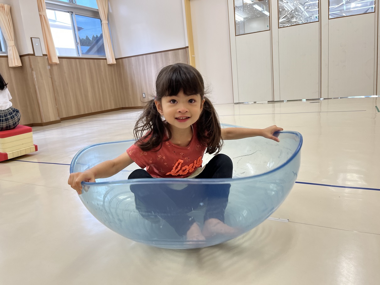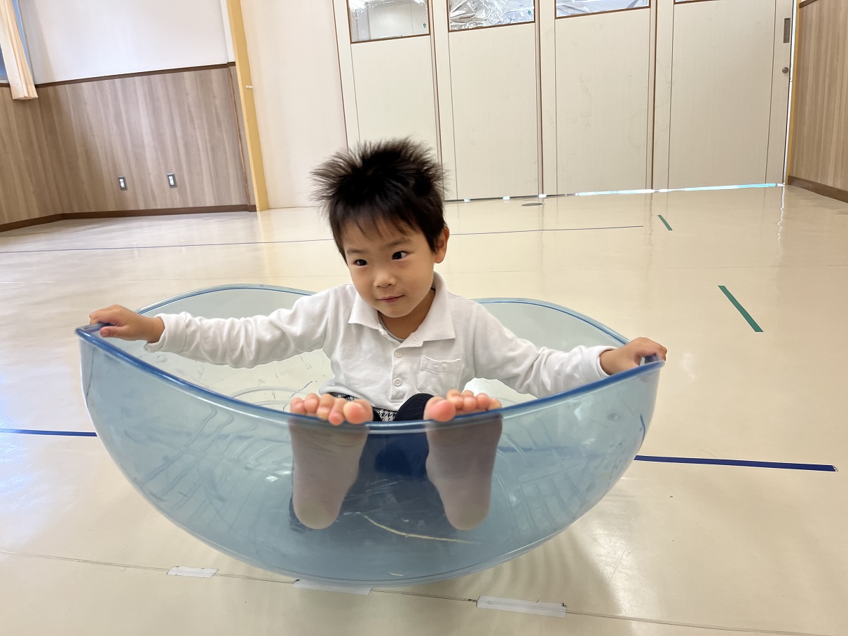 揺れ遊びで半球体やシーソーに乗って遊びました。 半球体では、自分で前後左右に揺らすことができるようになってきている子どもたち! 「見て!お船みたい!」と言いながら揺らしたり、「先生、回して!」と半球体を回してほしいことをリクエストしたりする様子もありました。 シーソーでは、お友だちとタイミングを合わせて揺らすことができ、笑顔いっぱいのとら①グループさんでした☆