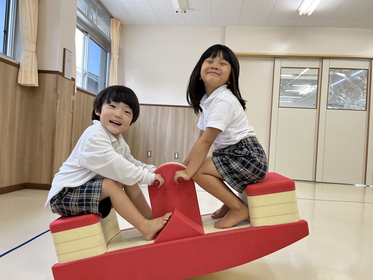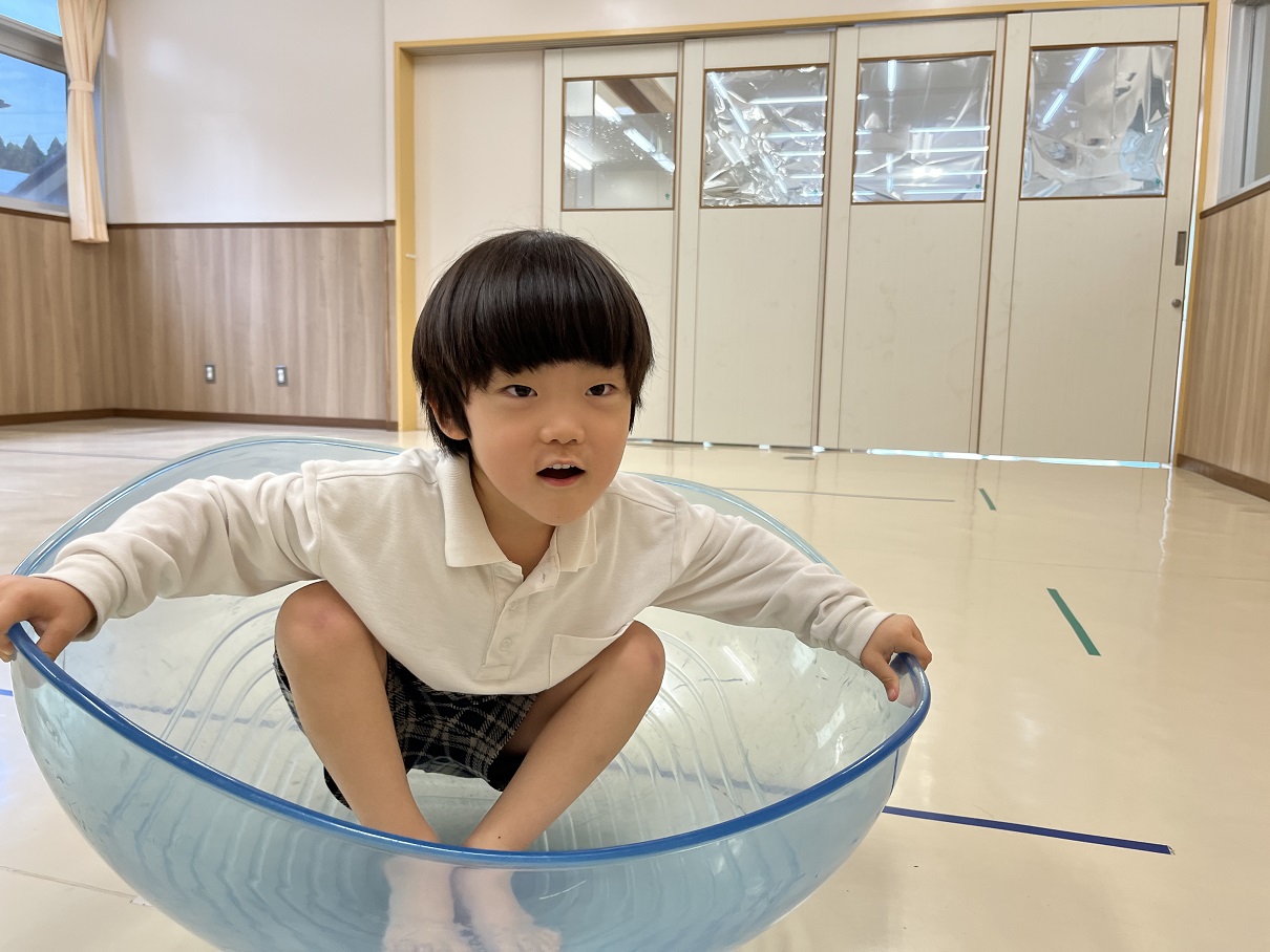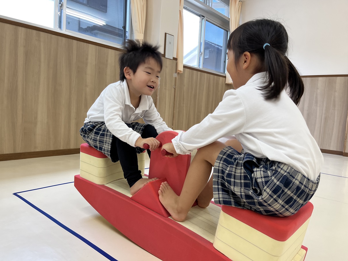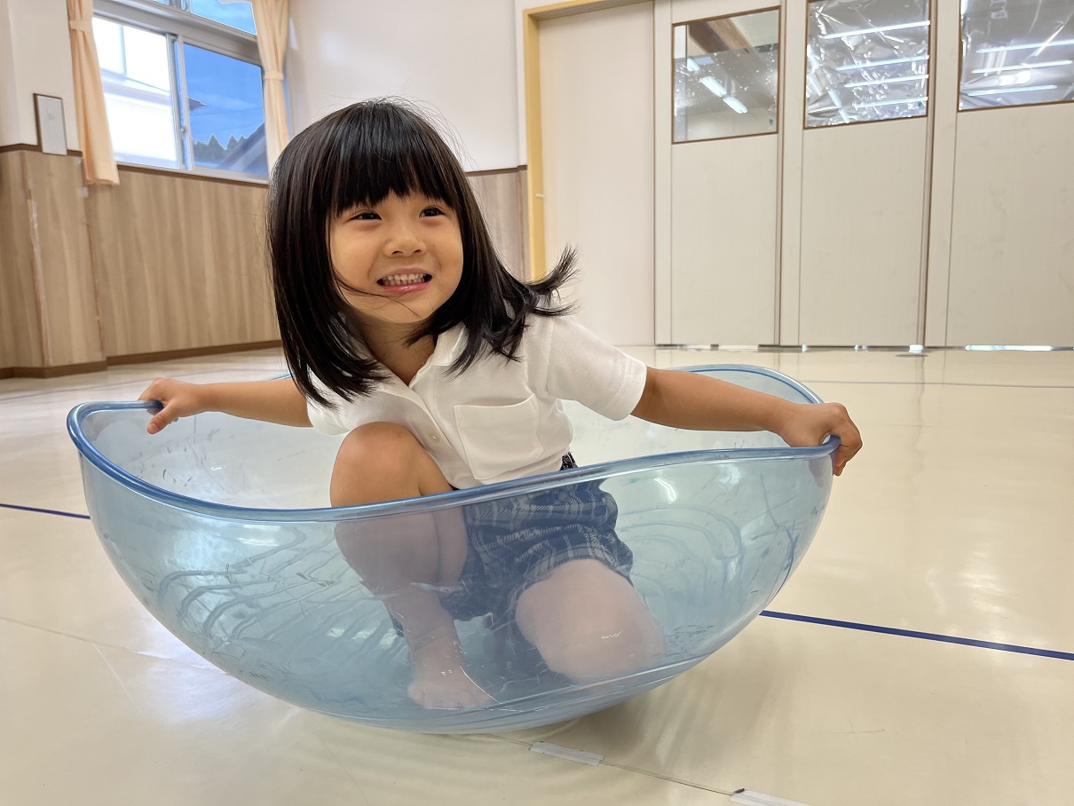 揺れ遊びで半球体やシーソーに乗って遊びました。 半球体では、自分で前後左右に揺らすことができるようになってきている子どもたち! 「見て!お船みたい!」と言いながら揺らしたり、「先生、回して!」と半球体を回してほしいことをリクエストしたりする様子もありました。 シーソーでは、お友だちとタイミングを合わせて揺らすことができ、笑顔いっぱいのとら①グループさんでした☆