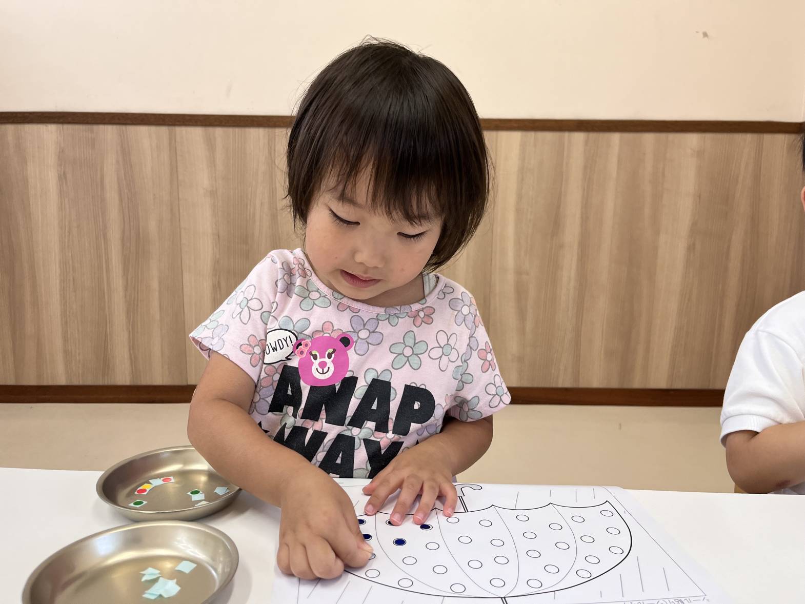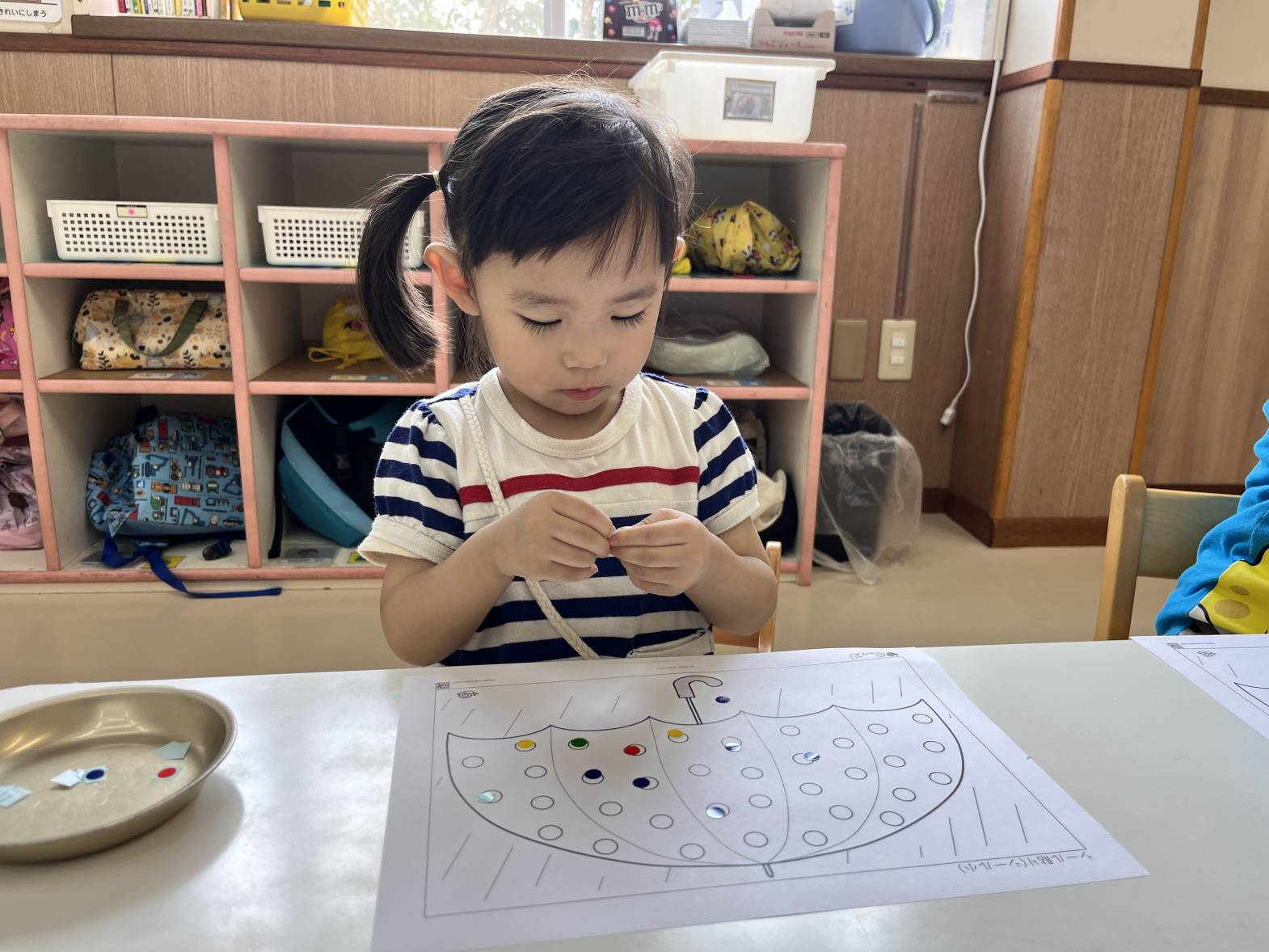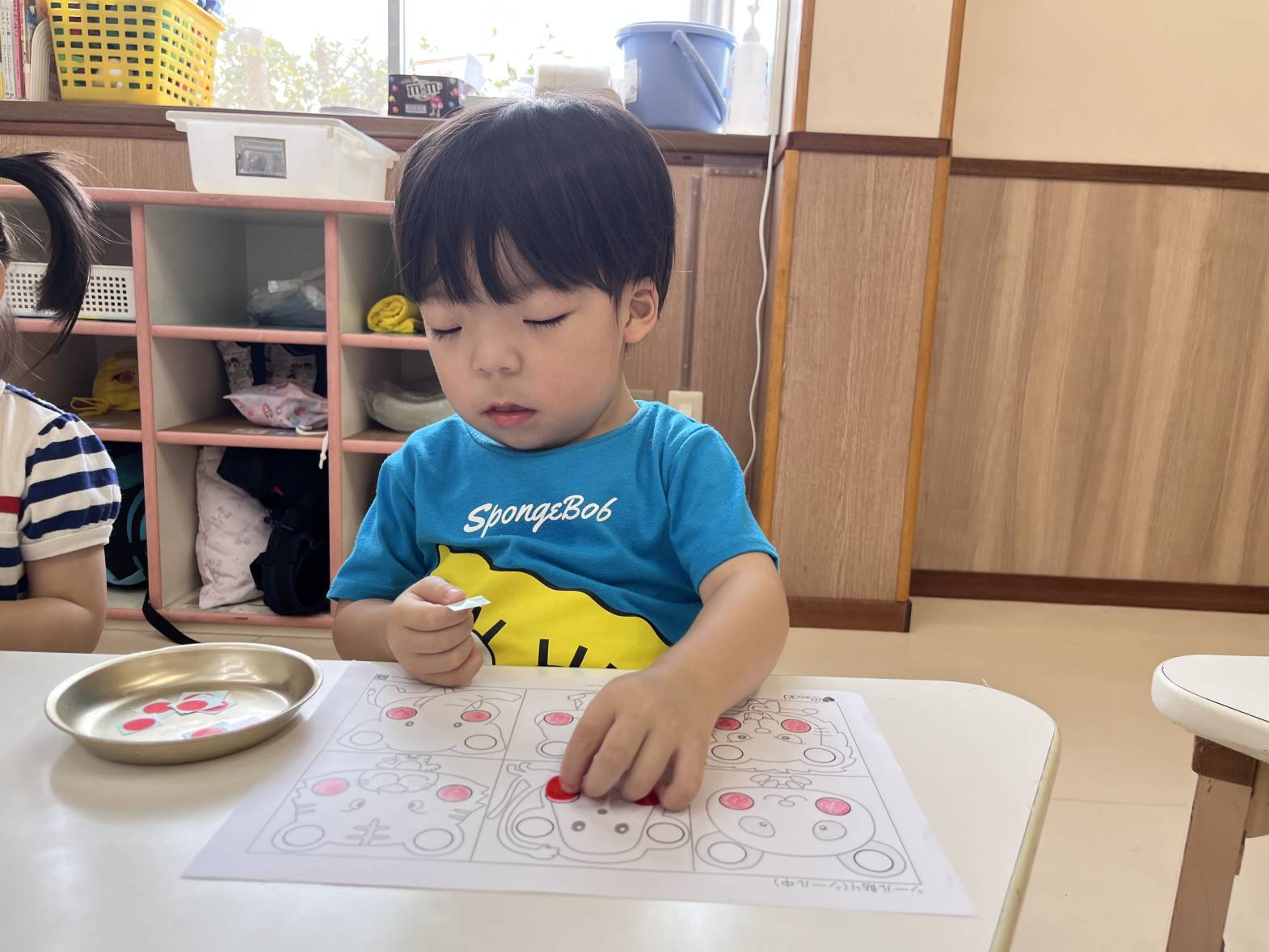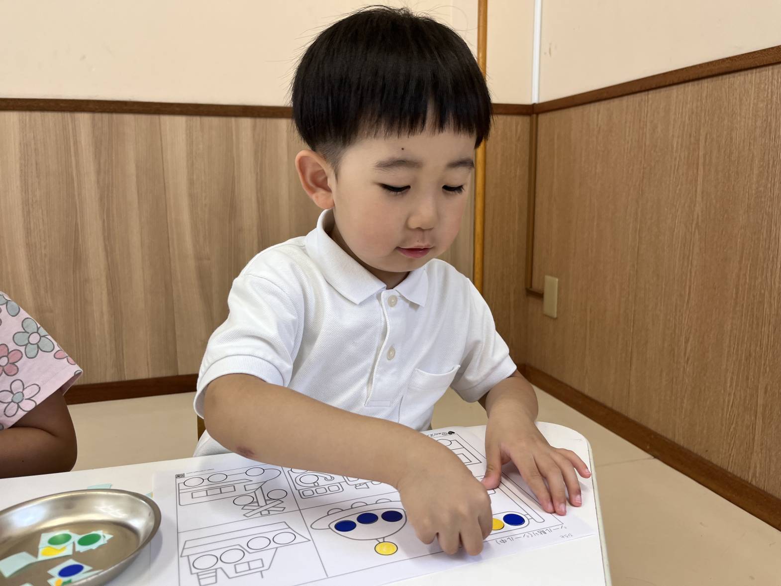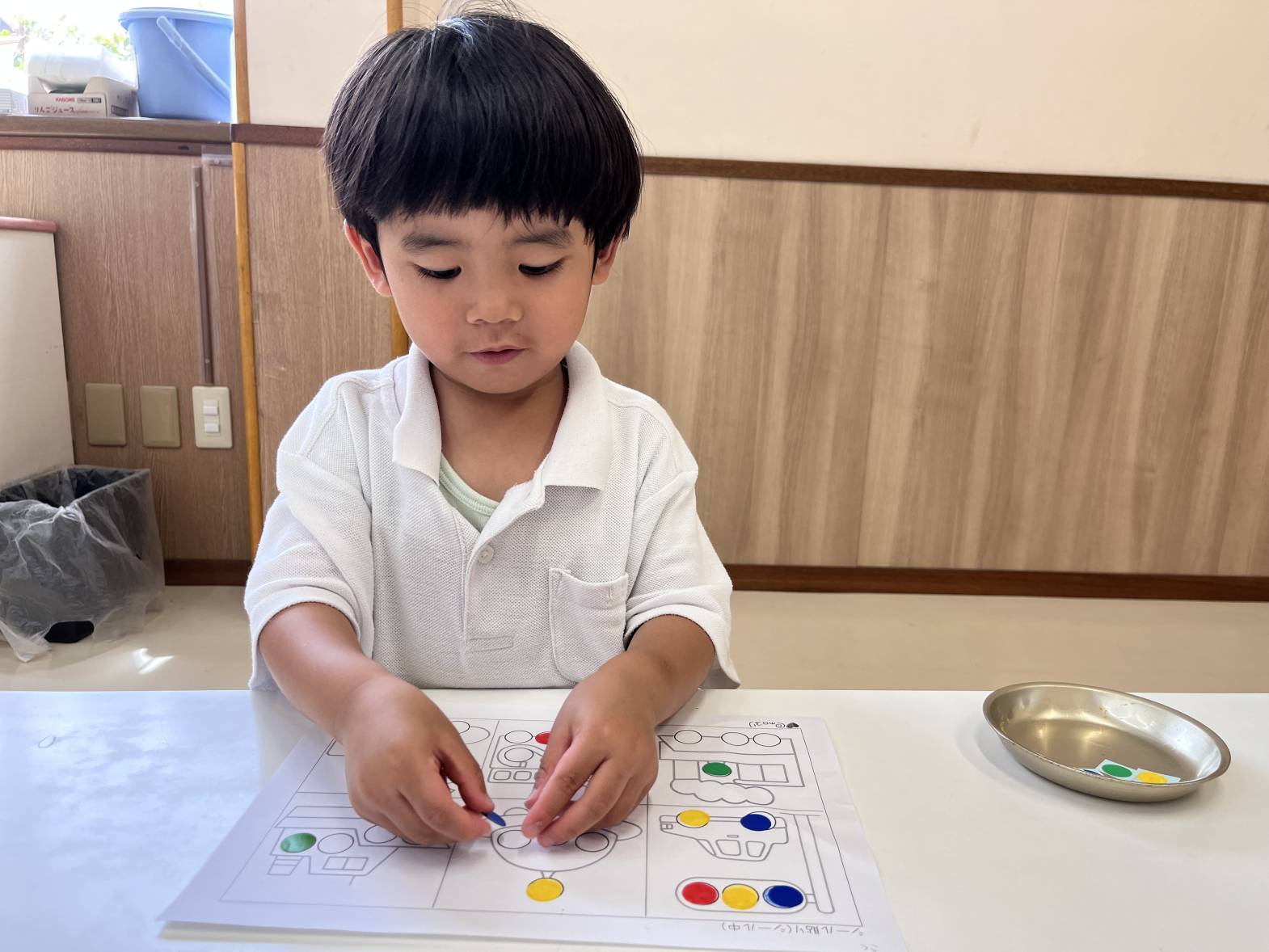 いぬ・くまグループでは、シール貼りを行いました。 指先を使って、台紙からシールを剥がしていくことができました! 用紙の色と同じ色の場所に、シールを貼ったり、好きな場所に好きな色のシールを貼ったりしていきます。 「赤色だよ!」、「これは、青!」、「船だね。」等、子どもたちで教え合いながら取り組む姿が見られました! 小さなシールにも挑戦し、満足そうな表情を浮かべる子どもたちでした!