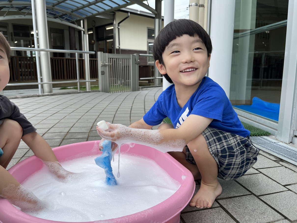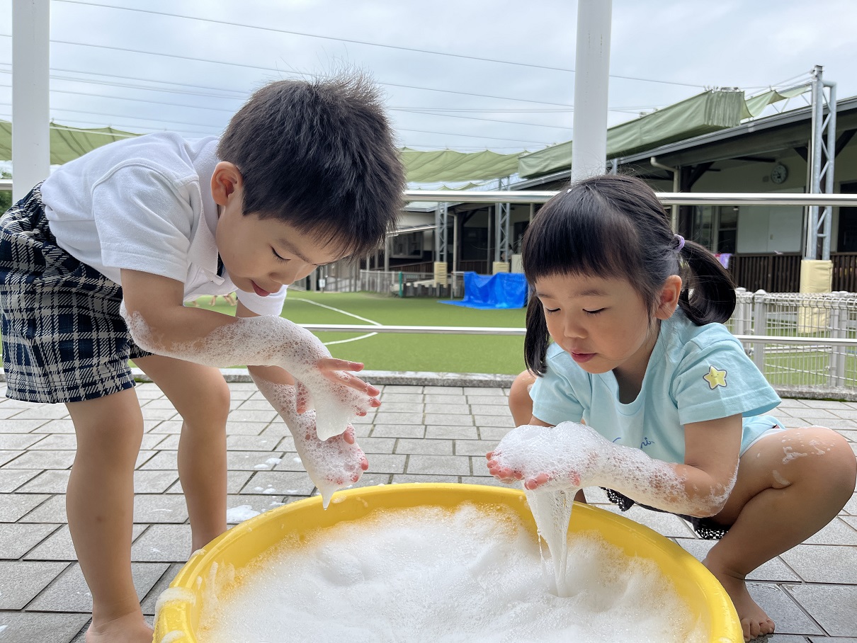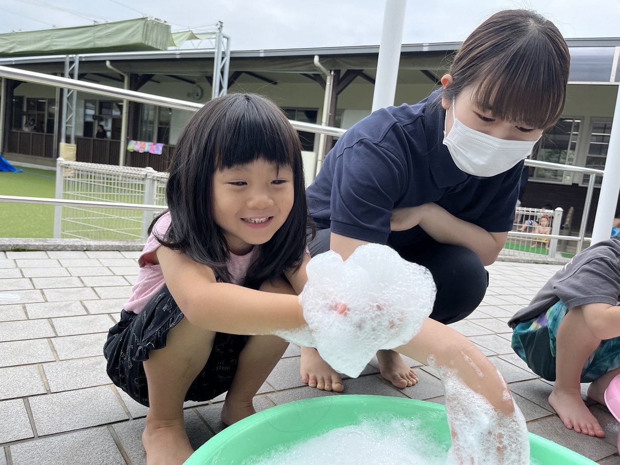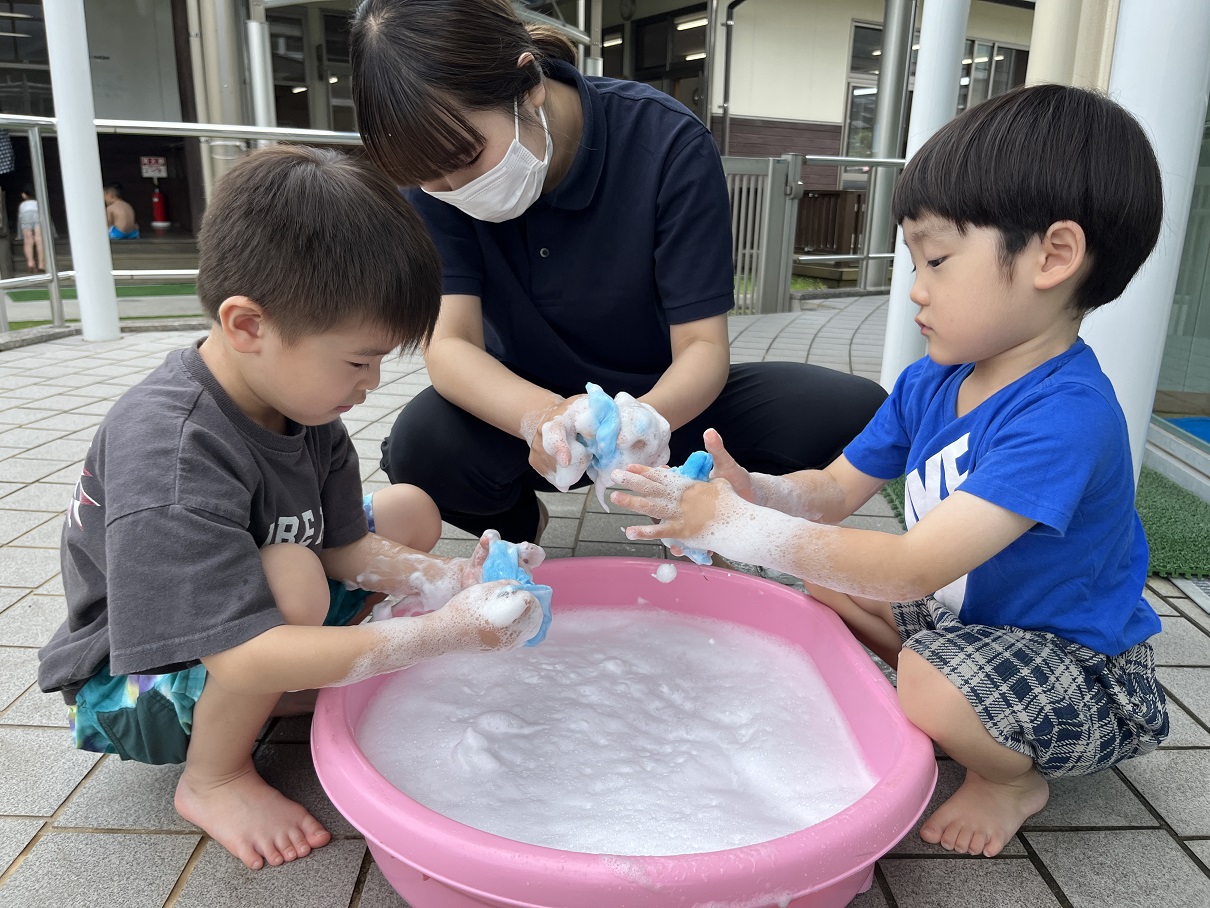 泡遊びを行いました。 ボディーソープを入れた桶にシャワーをかけると、どんどん泡立っていく様子に興味津々の子どもたち! 「フワフワ~!」、「クリームみたい♪」と感じたことを表現していました。 優しく触れたり、息を吹きかけたり・・・ 「じゃーん!ソフトクリームのできあがり!」と友だちと見立てて遊ぶ姿も見られました。 ネットを使って、固形石鹸を泡立てることにも挑戦しました! 「今度はどんな活動かな♪」、「プールにはいるの楽しみ♪」と次の活動に期待するとらグループさんでした!