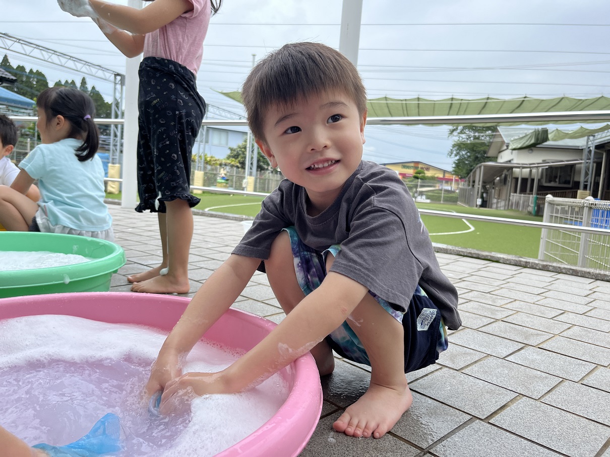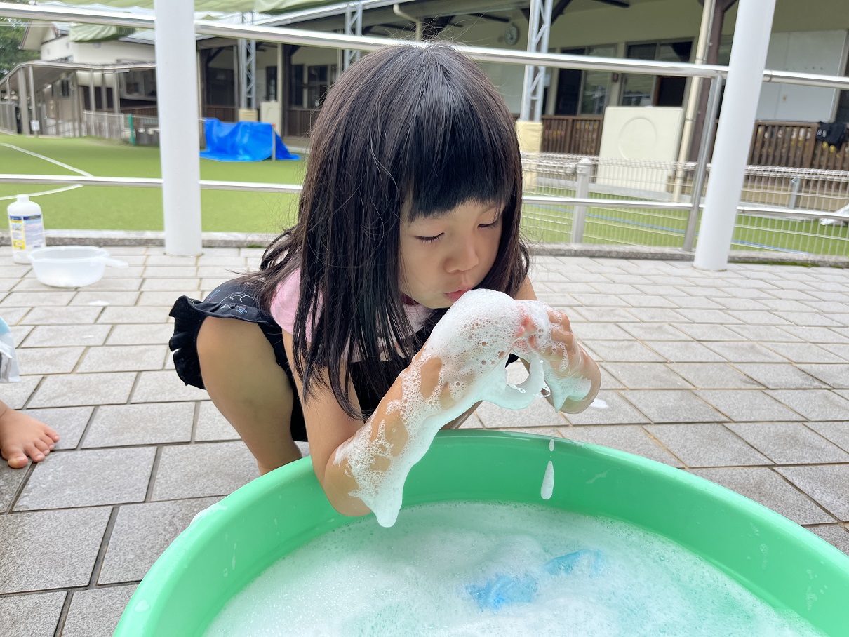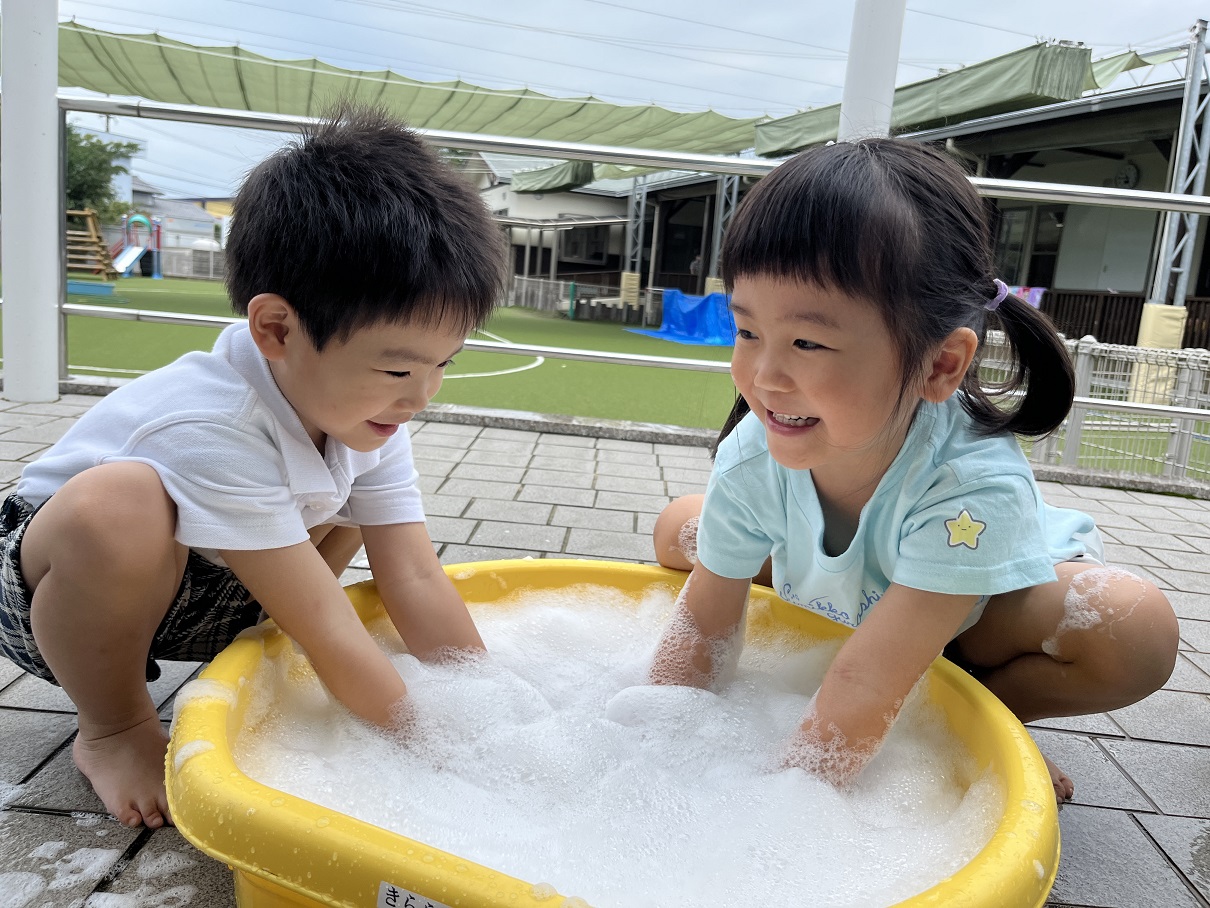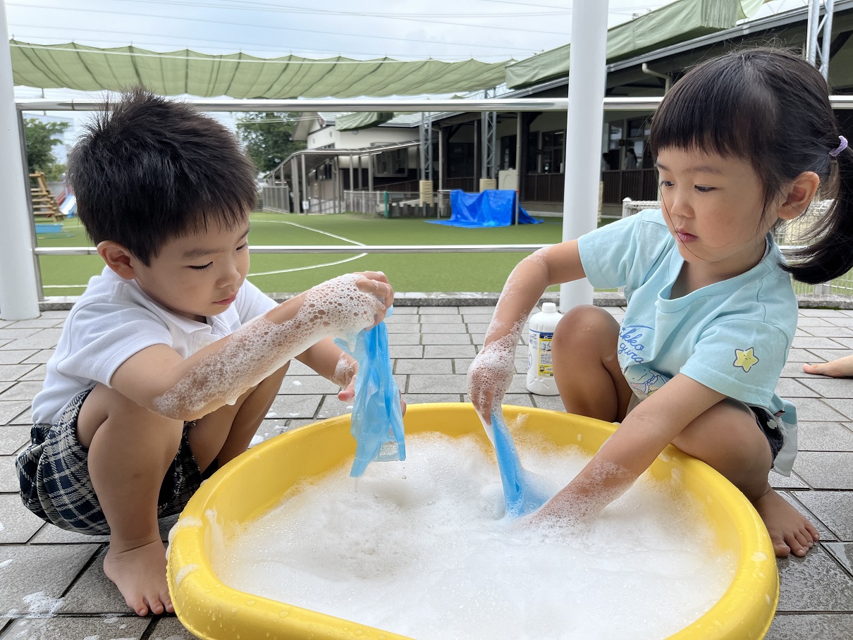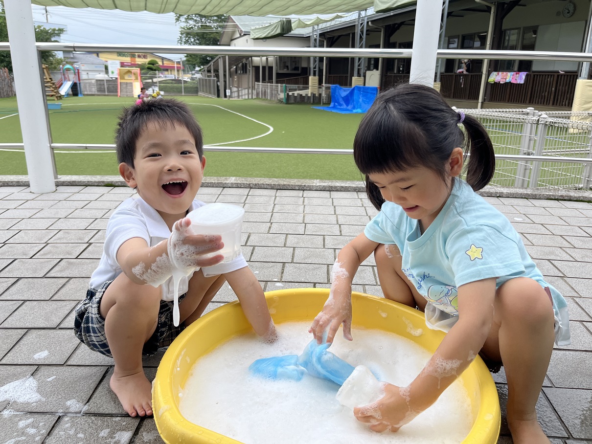 泡遊びを行いました。 ボディーソープを入れた桶にシャワーをかけると、どんどん泡立っていく様子に興味津々の子どもたち! 「フワフワ~!」、「クリームみたい♪」と感じたことを表現していました。 優しく触れたり、息を吹きかけたり・・・ 「じゃーん!ソフトクリームのできあがり!」と友だちと見立てて遊ぶ姿も見られました。 ネットを使って、固形石鹸を泡立てることにも挑戦しました! 「今度はどんな活動かな♪」、「プールにはいるの楽しみ♪」と次の活動に期待するとらグループさんでした!