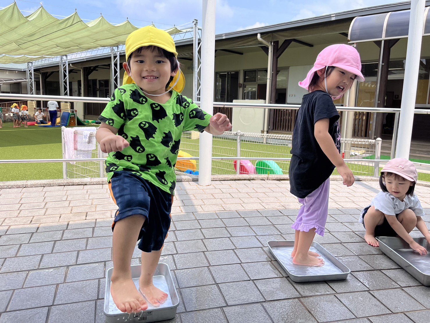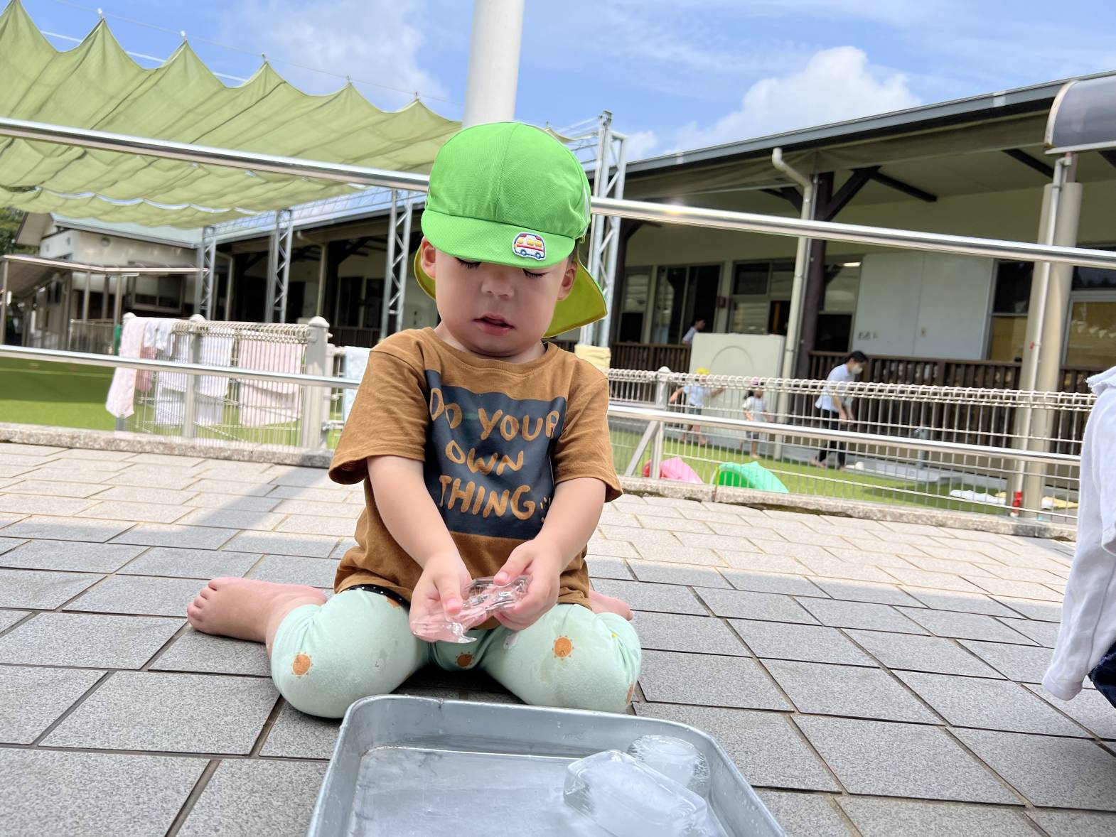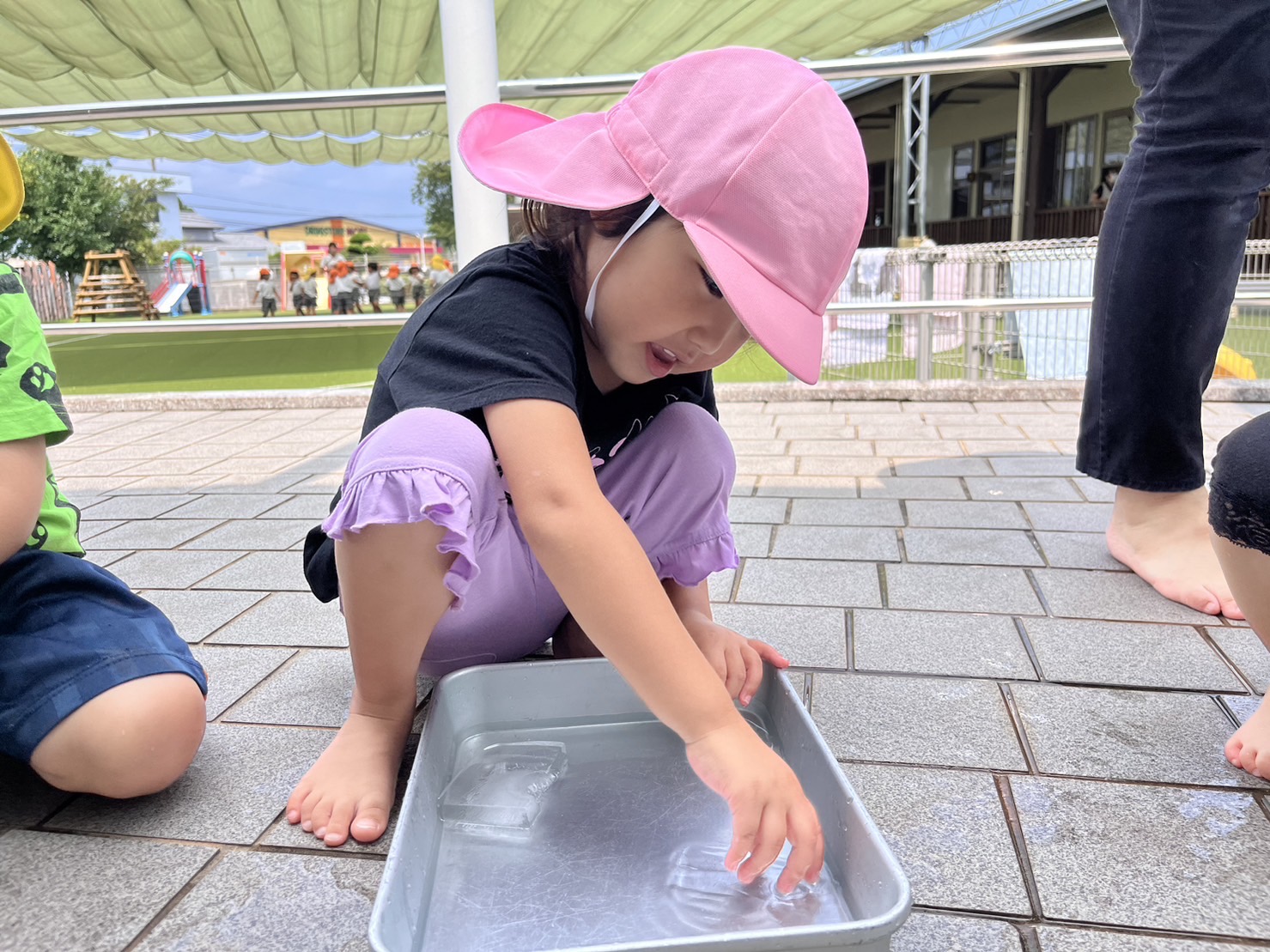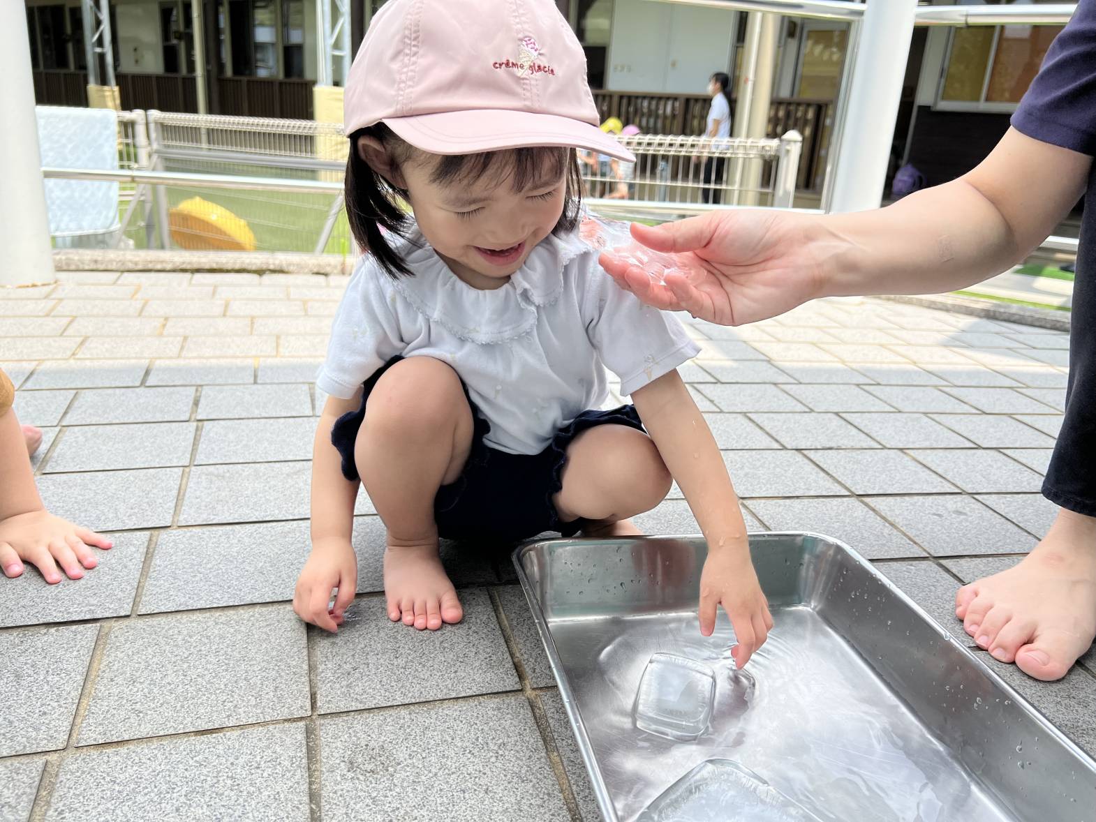 氷遊びを行いました。 氷遊びをすることを伝えると、「氷遊び?♪」、「やったー!」と活動を楽しみにしている様子の子どもたち。 いざ、氷を触ると、「きゃあっ!」、「冷たーい♪」と笑顔を浮かべる子どもたち。 溶けた氷水の中に入ったり、足を入れて足踏みをしたりするいぬ・くまグループさん。 また、持っている氷が床に落ちて割れると、「わあ!小さくなったー!」と大きさの違いに気づく子どもも見られました! 氷に触れ、季節を味わうことができたいぬ・くまグループさんでした!