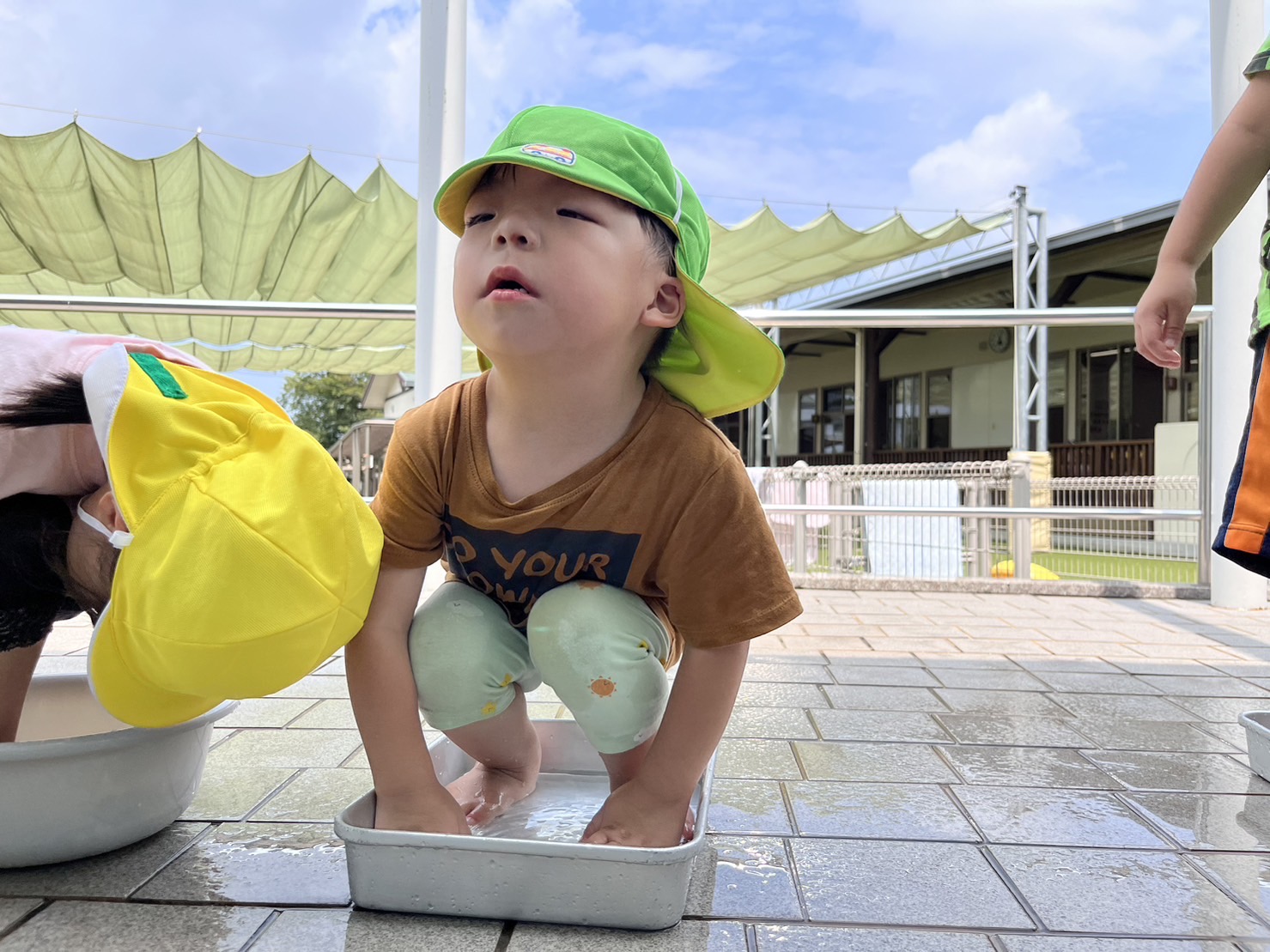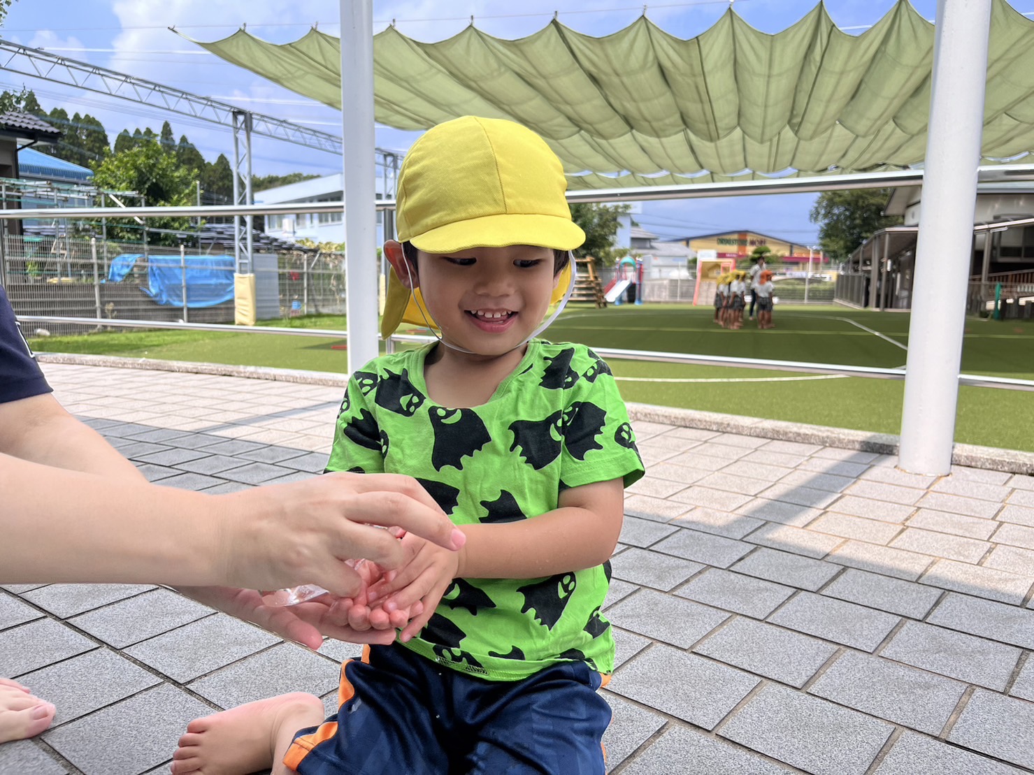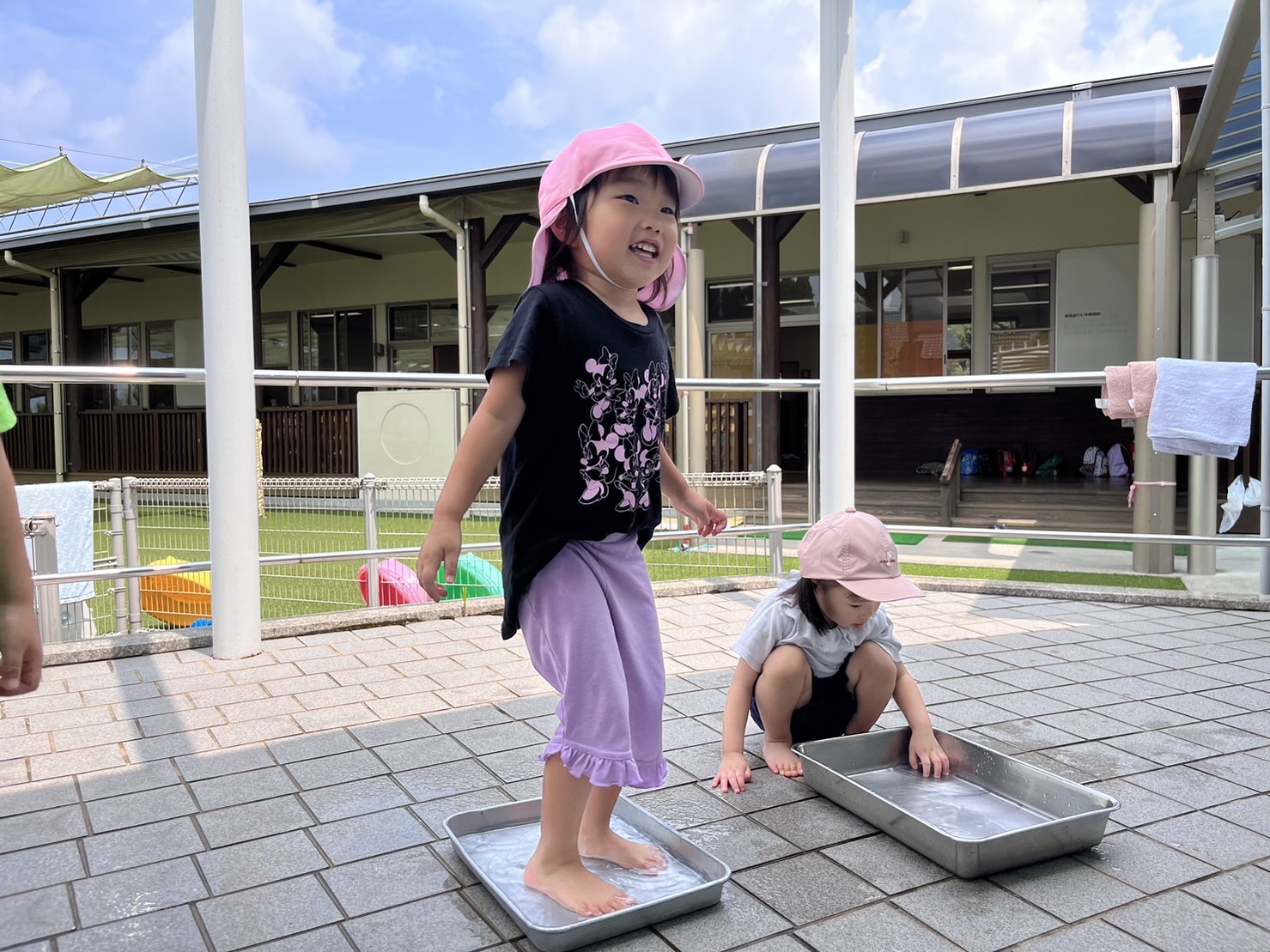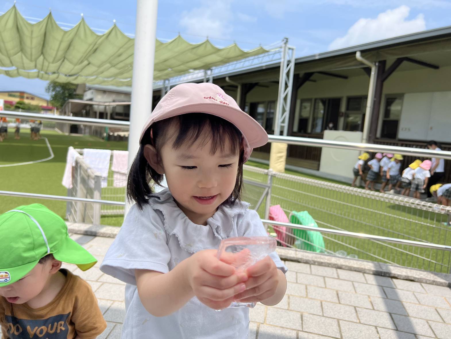 氷遊びを行いました。 氷遊びをすることを伝えると、「氷遊び?♪」、「やったー!」と活動を楽しみにしている様子の子どもたち。 いざ、氷を触ると、「きゃあっ!」、「冷たーい♪」と笑顔を浮かべる子どもたち。 溶けた氷水の中に入ったり、足を入れて足踏みをしたりするいぬ・くまグループさん。 また、持っている氷が床に落ちて割れると、「わあ!小さくなったー!」と大きさの違いに気づく子どもも見られました! 氷に触れ、季節を味わうことができたいぬ・くまグループさんでした!