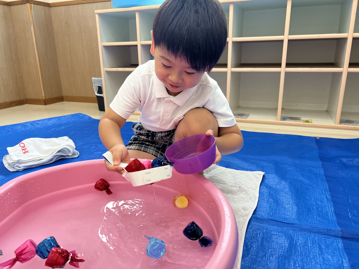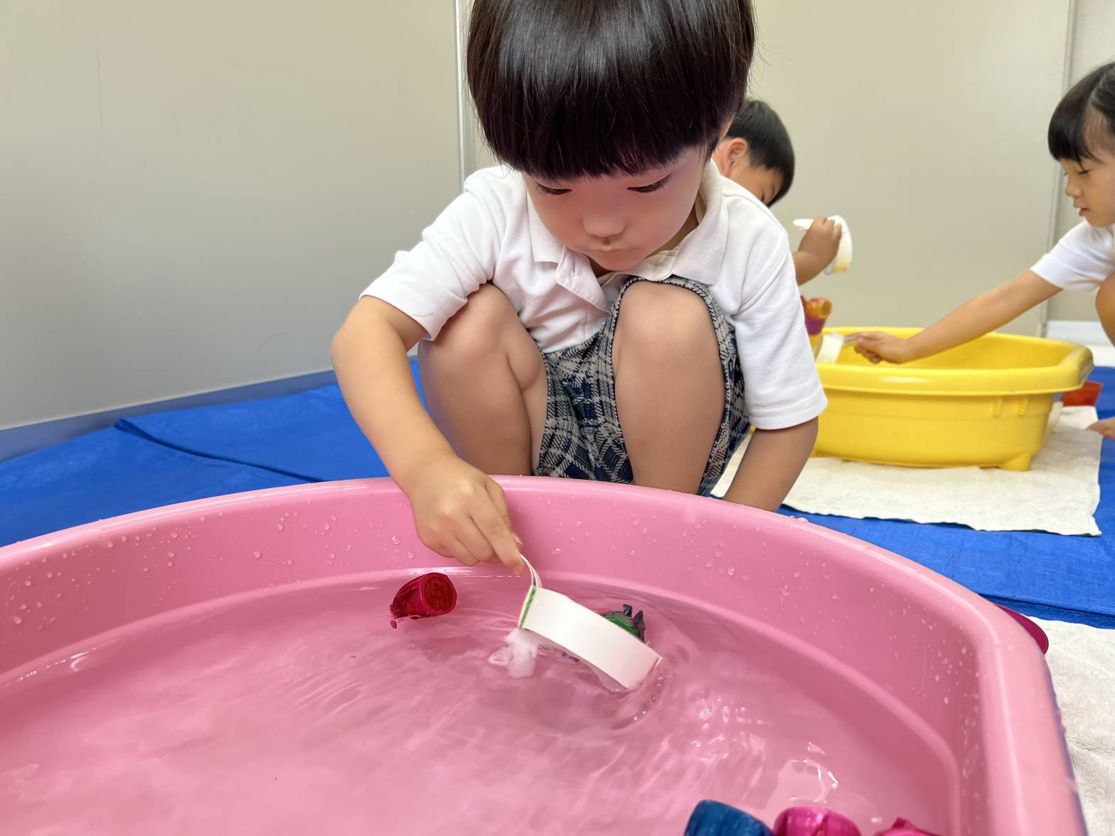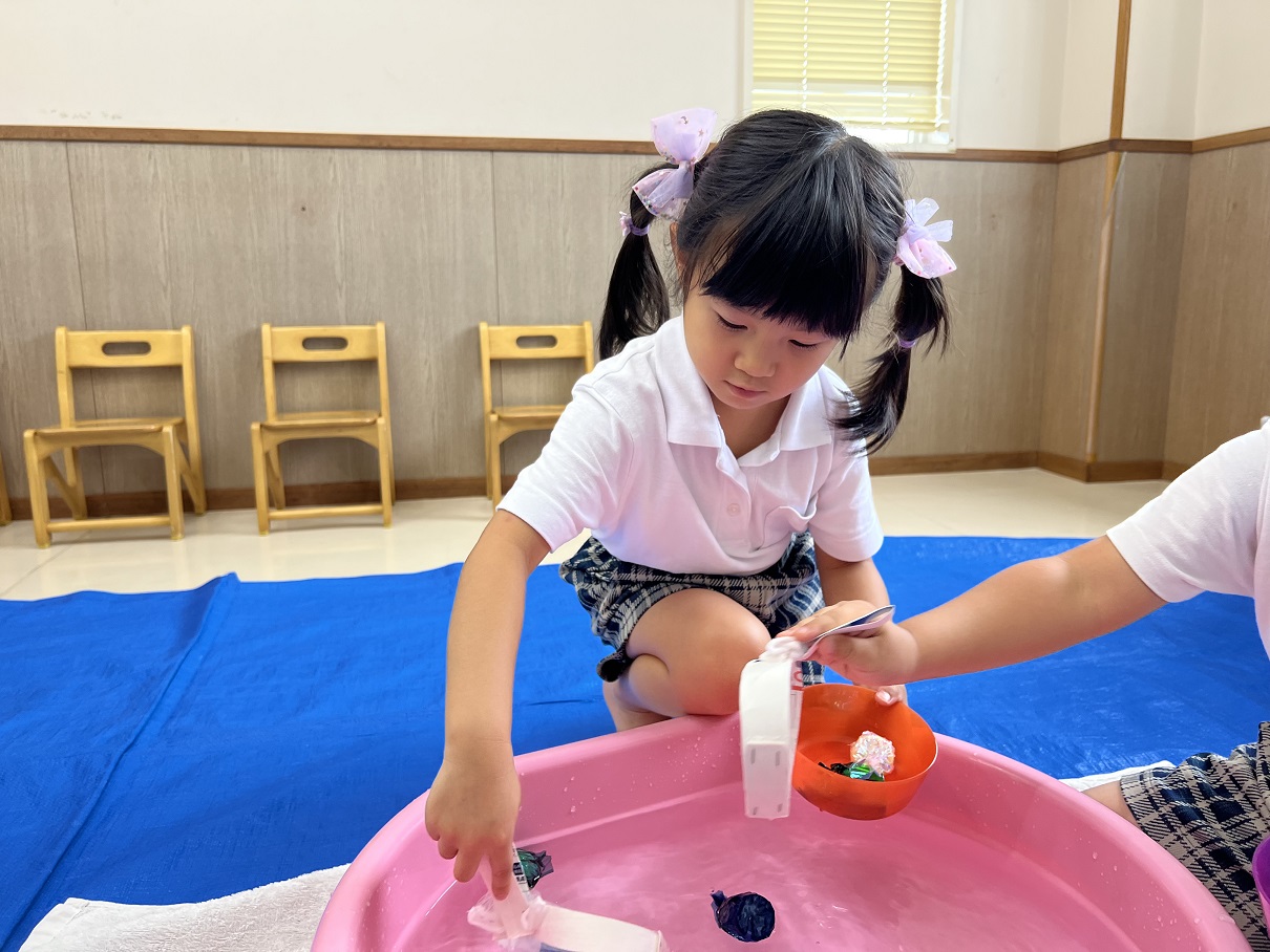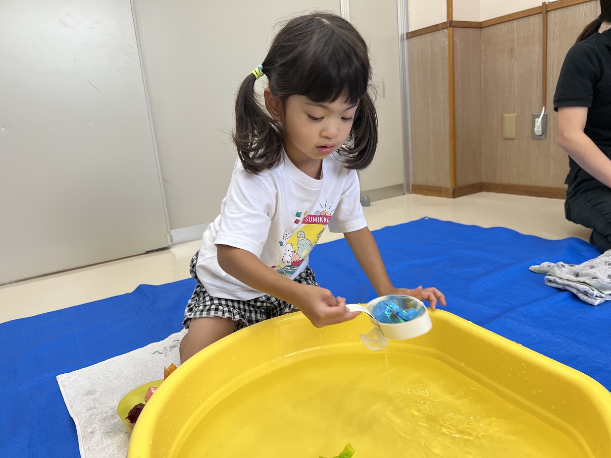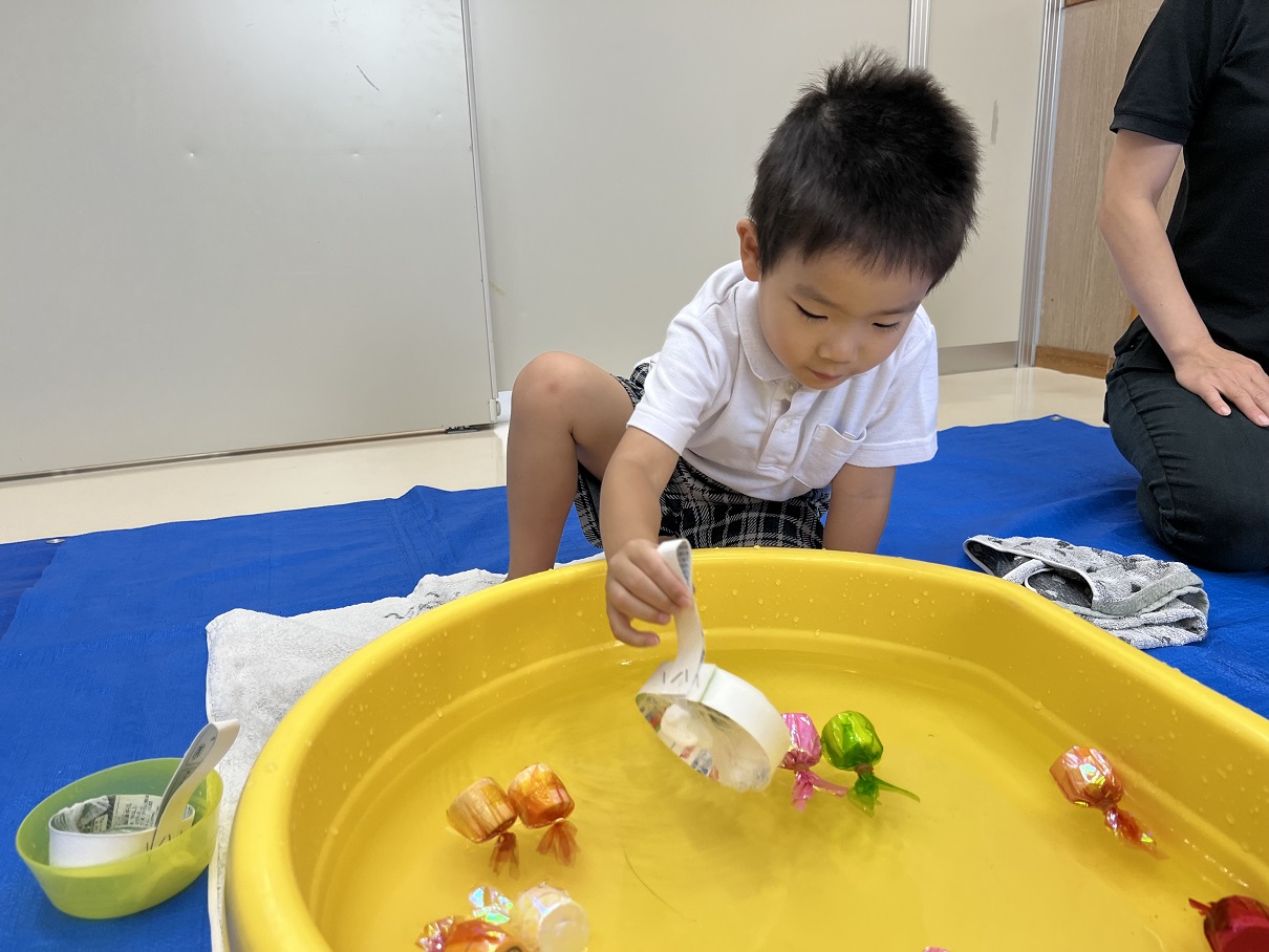 狙ってすくうことを目的として金魚すくい遊びを行いました! 好きな色を狙ったり… いっぱい金魚をすくったり… 時間内に全部の金魚をすくうことができるように集中する姿も見られました♪ 手を使わずに、網でとることができるよう、何度も取り組むうちにコツを掴んでいました。 「またしたい!」 「お祭りみたいだね♪」と夏を感じているとらグループさんでしたよ!