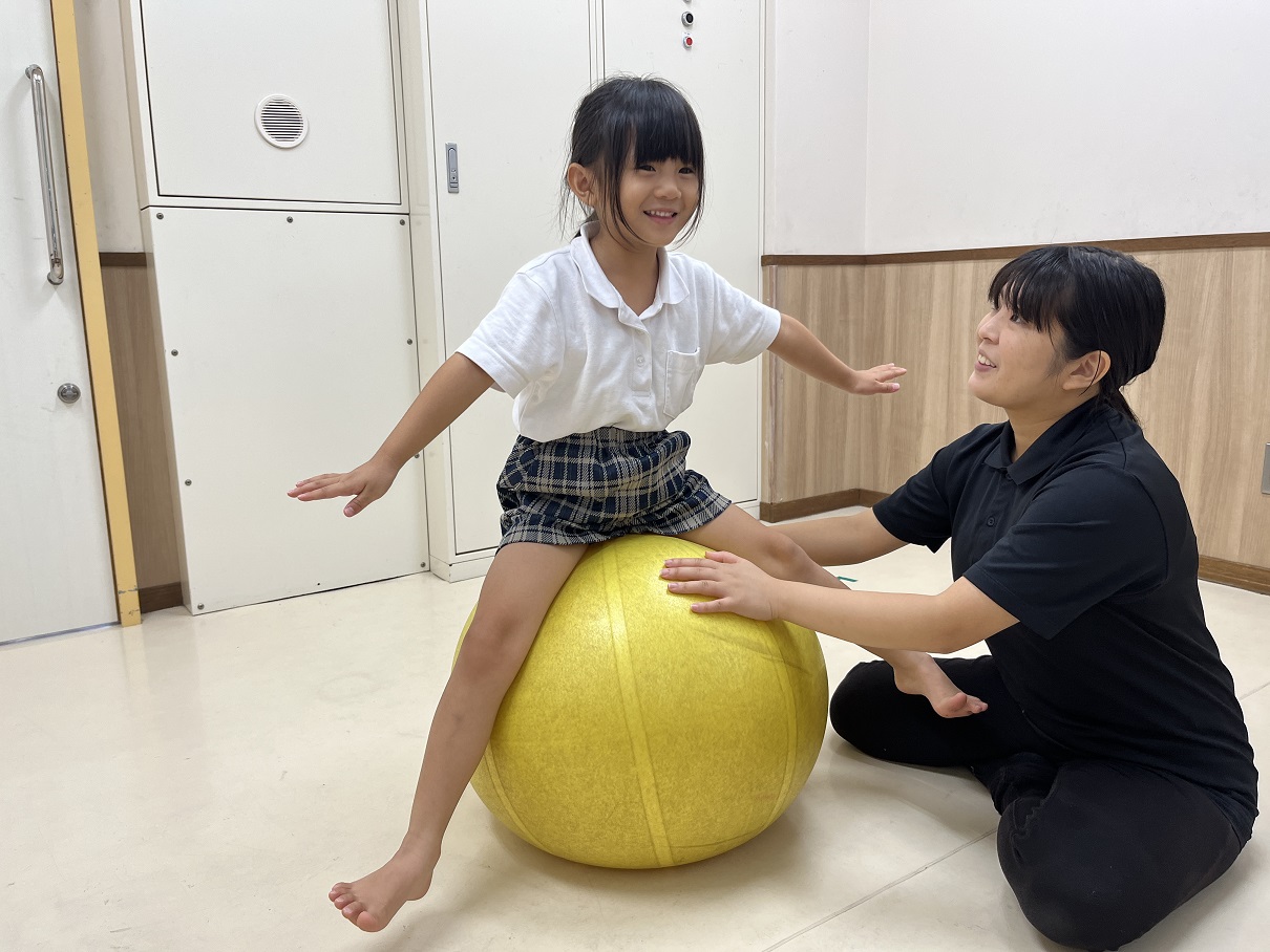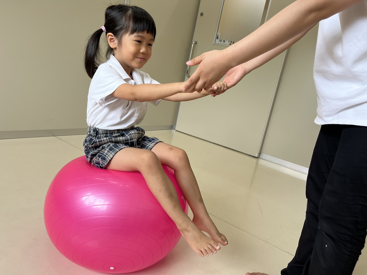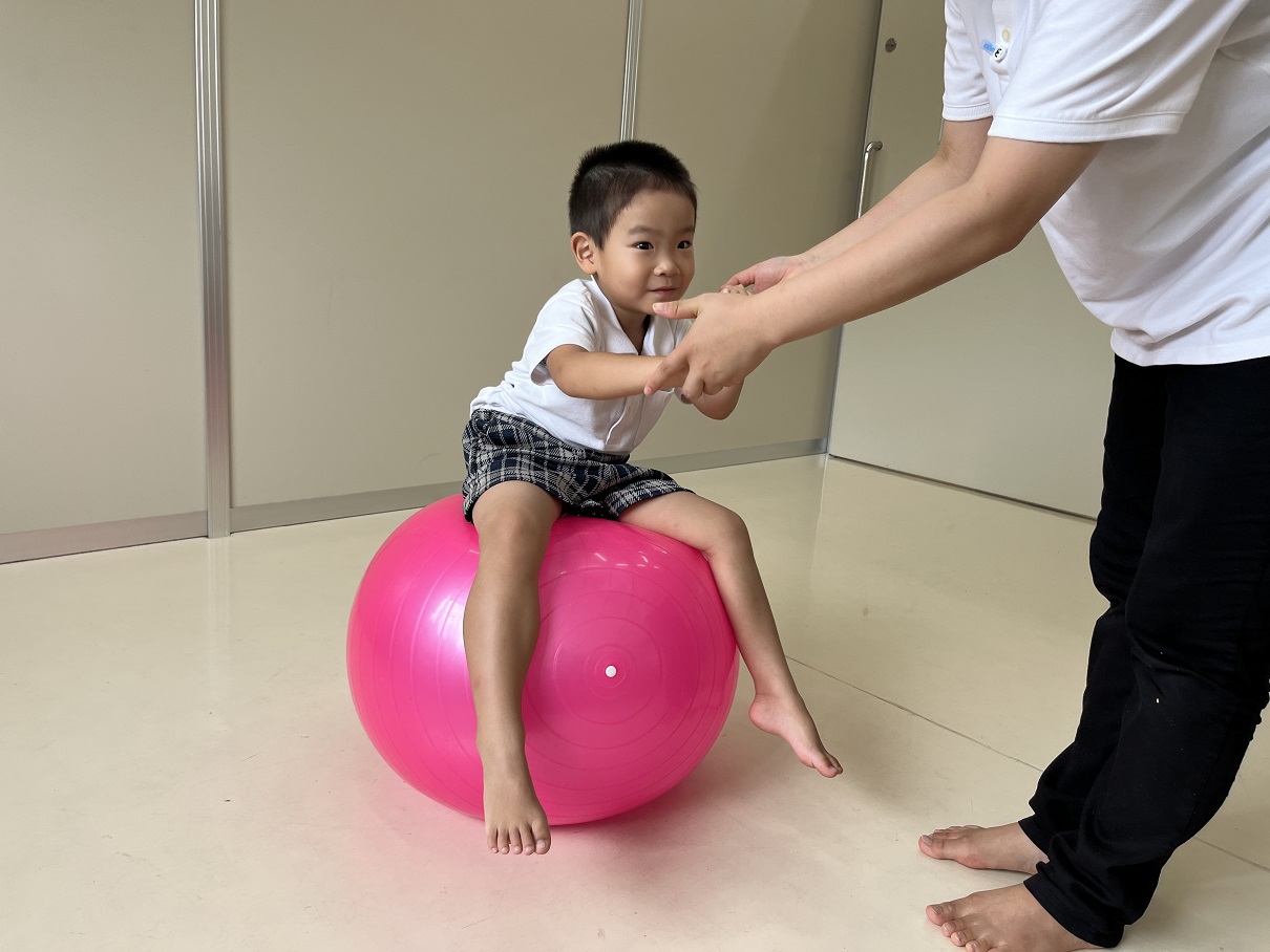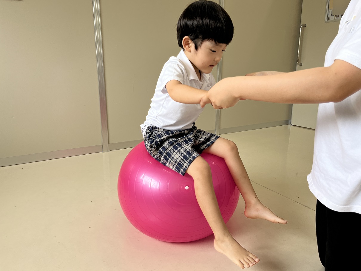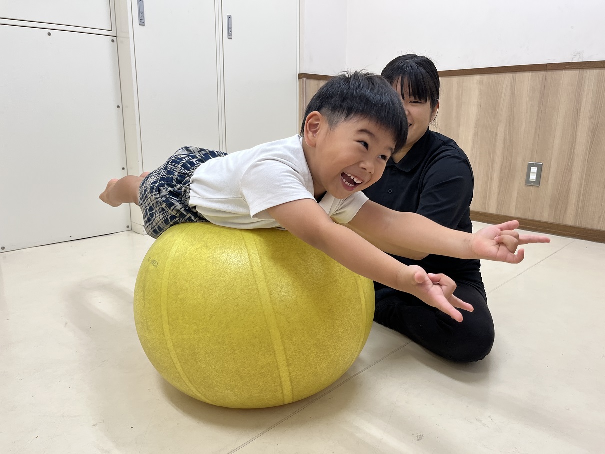 バランスボールを使って遊びました。 職員と手を繋いでバランスボールの上に座ったり、腹這いで乗りスーパーマンのポーズを取ったりすることに挑戦! 最初は、緊張し身体に力が入ったり、「落ちるかも~!」と表情が硬くなったりする子どももいましたが、すぐに慣れ、笑顔いっぱいのとら①グループさんでした!