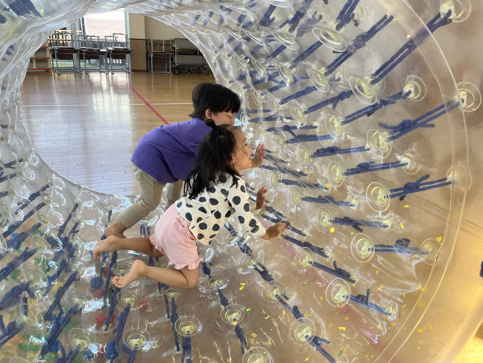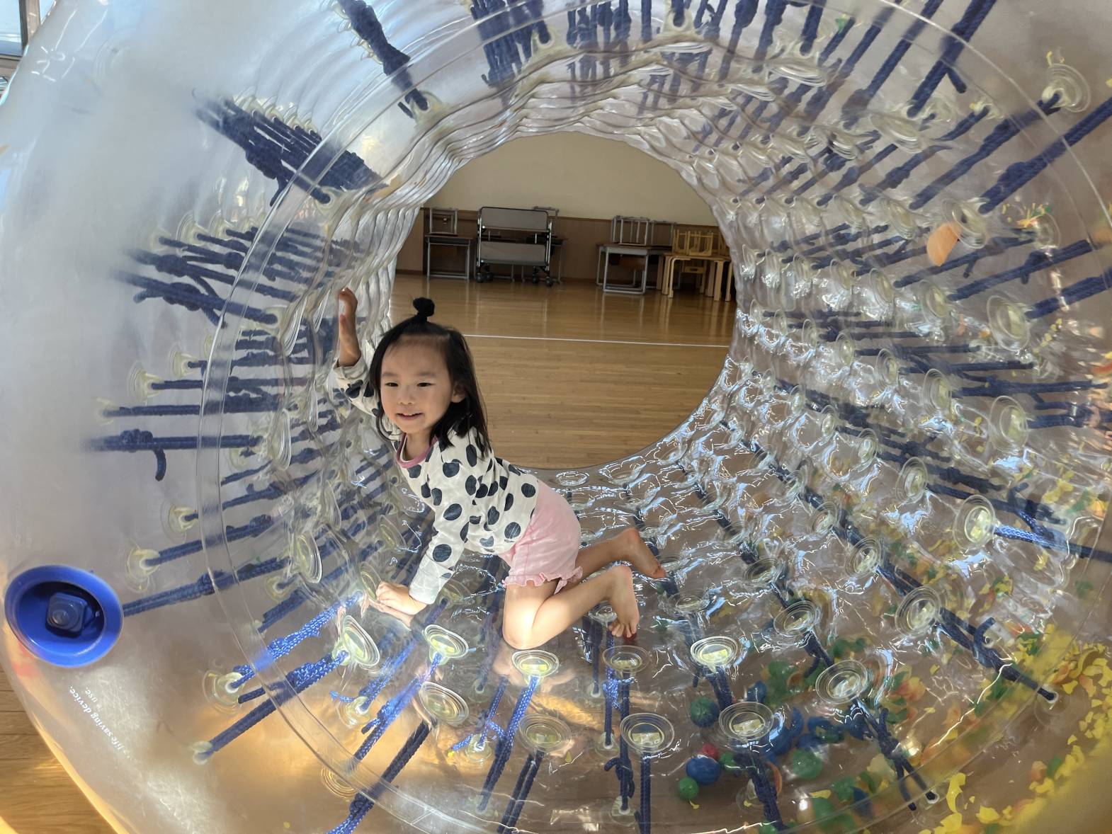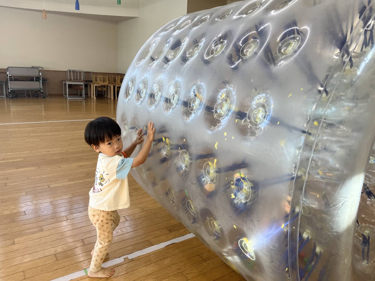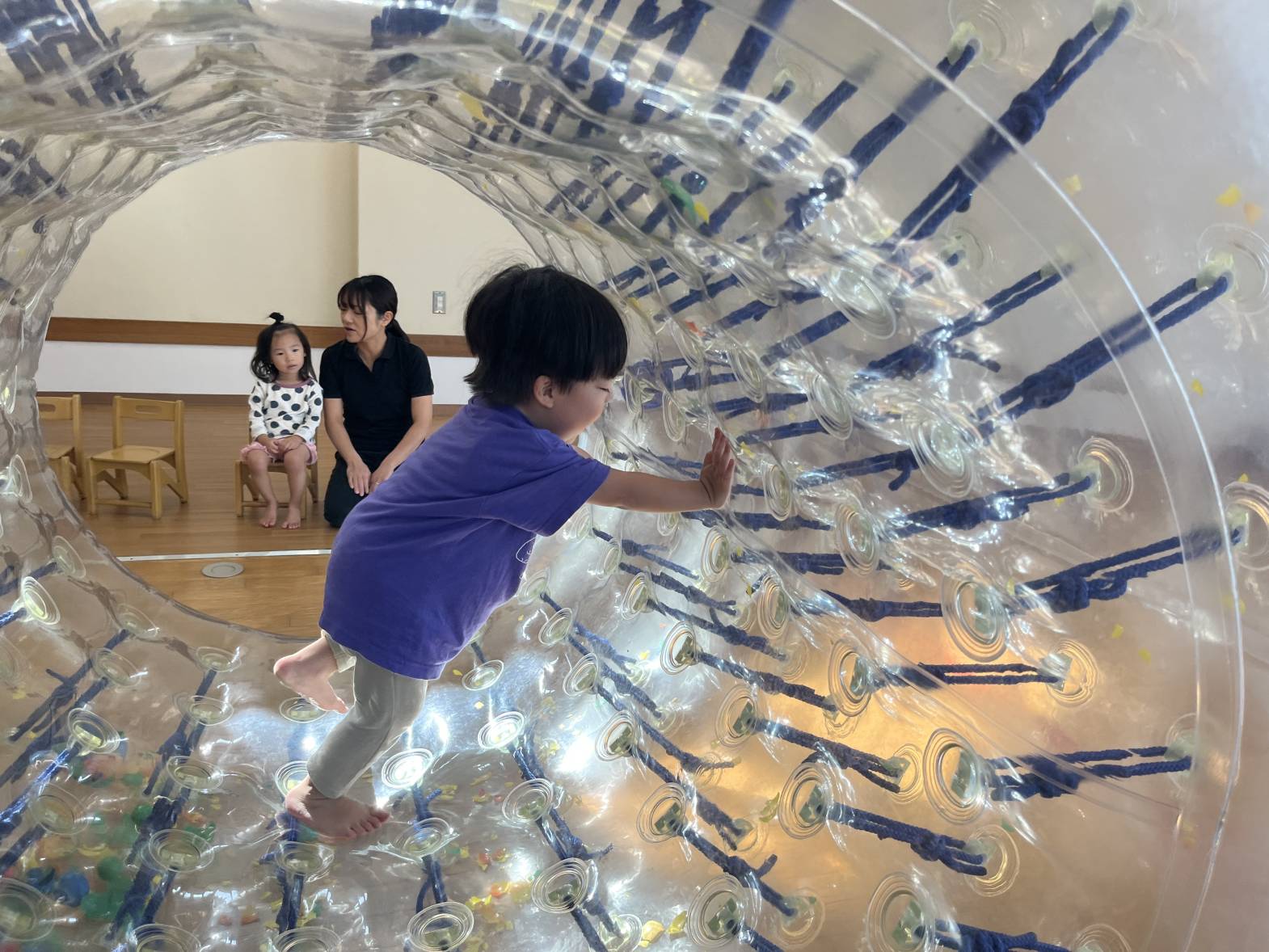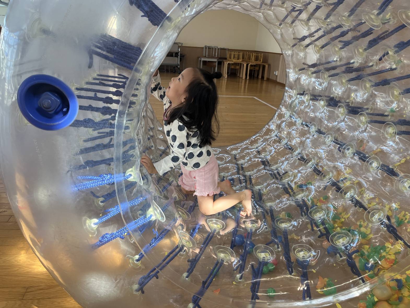 サイバーホイールに挑戦しました! 以前は、乗る事が怖かった子どもたちも自らサイバーホイールの中に入ることができました! 四つ這いで進んだり、転がしたりたくさん身体を動かして遊びました! お友だちとサイバーホイールの中に入ると、リラックスし笑顔いっぱいのいぬグループさんでした!