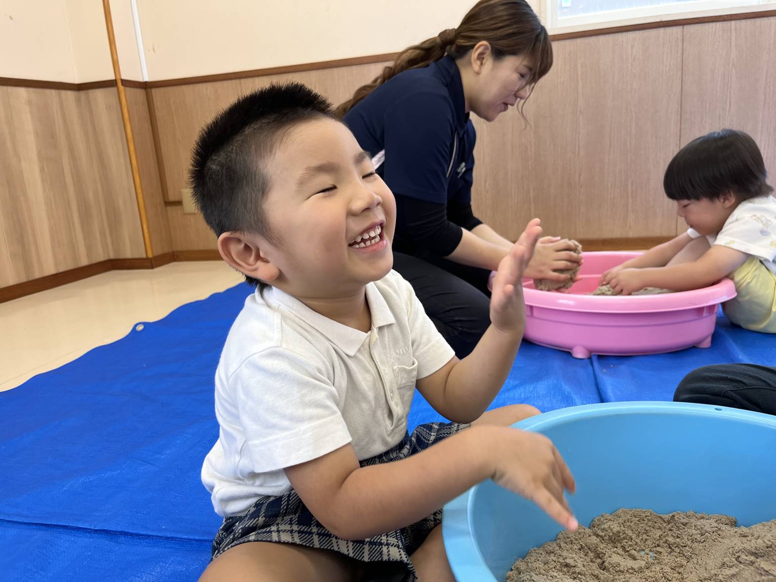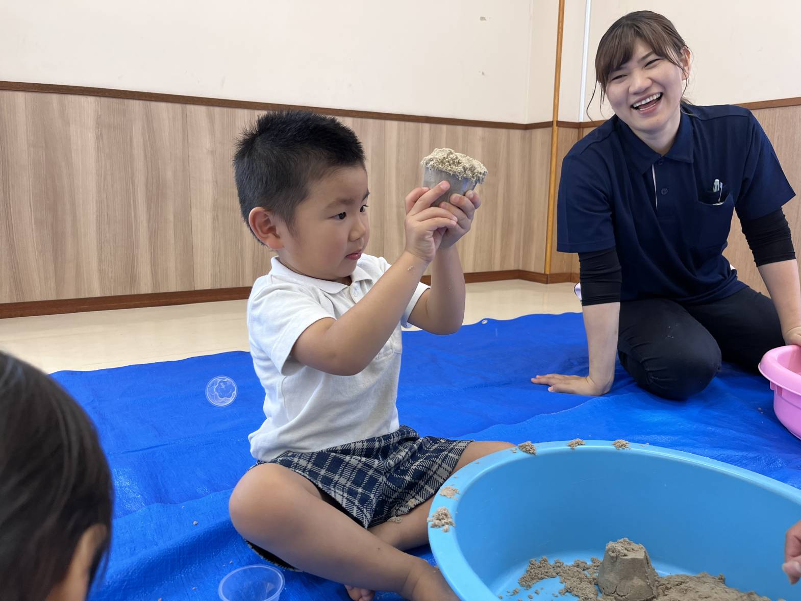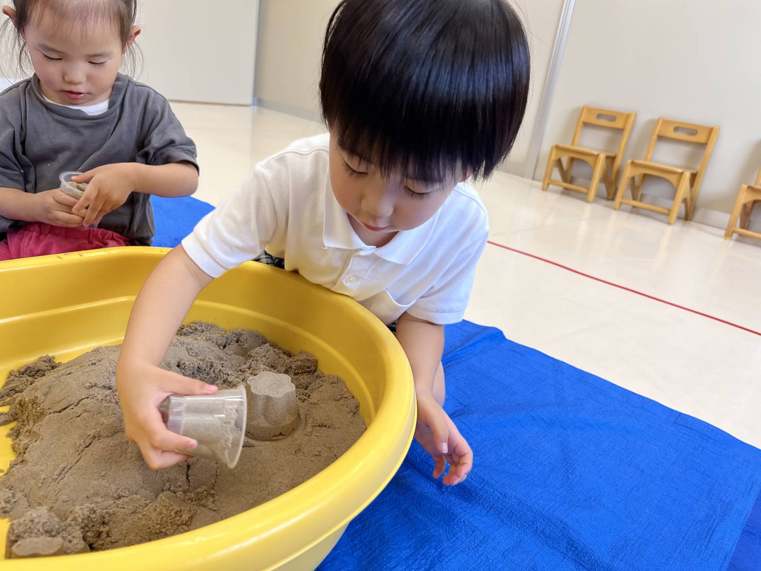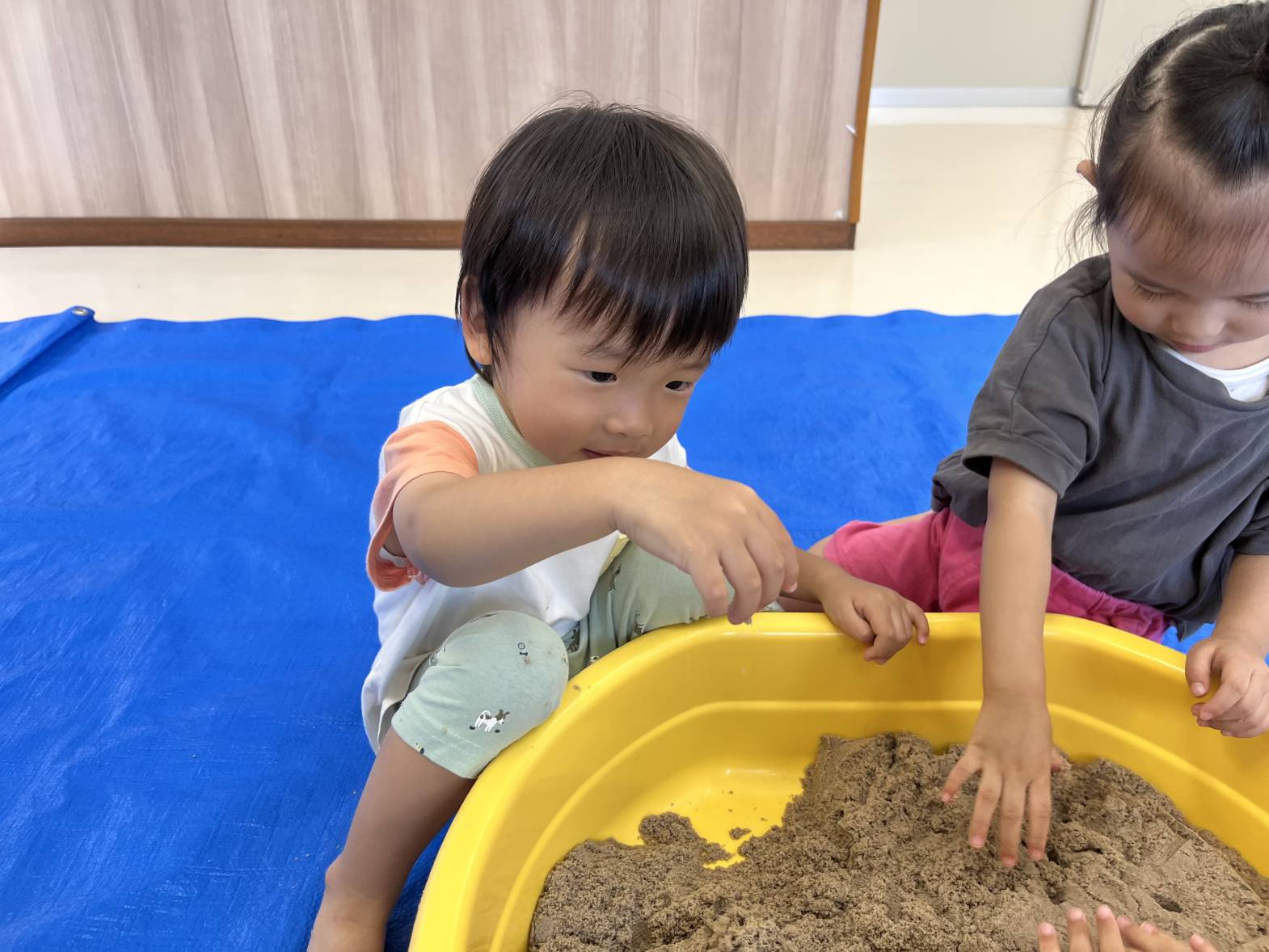 いぬ・くまグループでは、砂遊びを行いました。 砂に手のひらを押し付けて手型をつけたり、足を埋めたり、雨のように降らせたりと、感触を楽しむ姿が見られました! カップを使う際は、カップに砂を押し込み、ひっくり返して型を作ることができていました! 最後には、「明日も砂がしたい。」と言う声も聞かれ、次の砂遊びを楽しみにする子どもたちでした♪