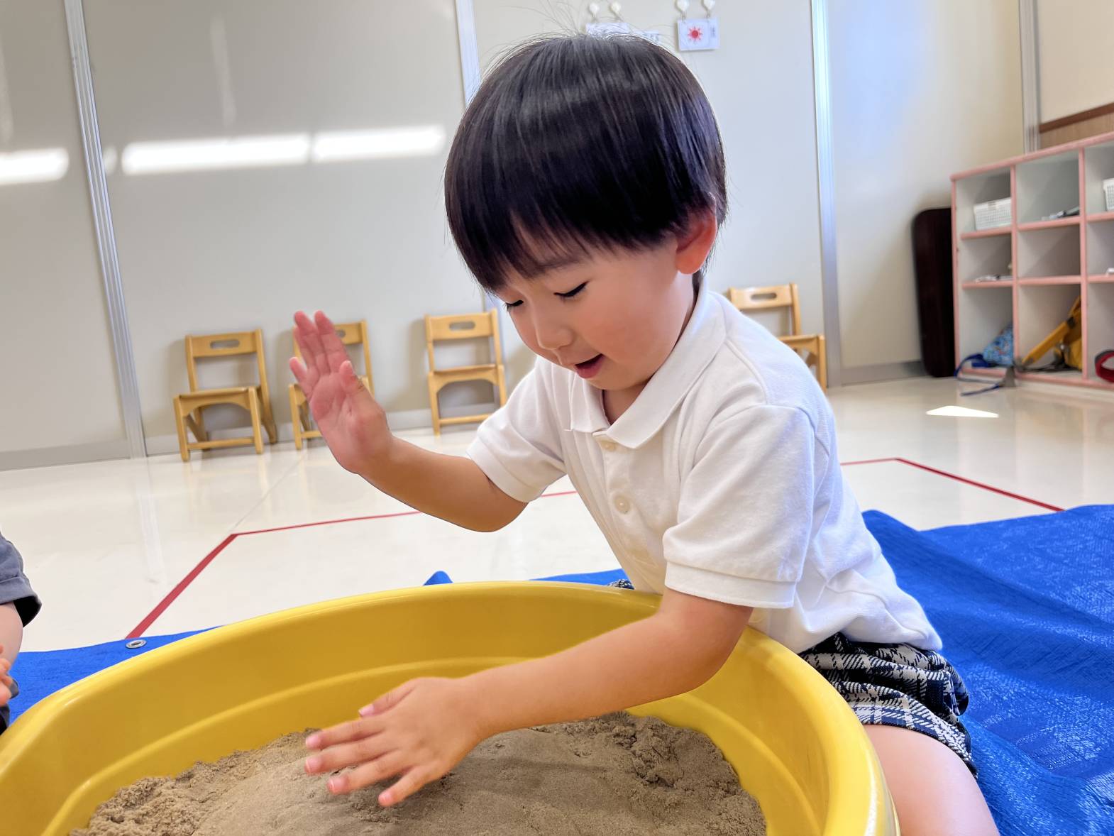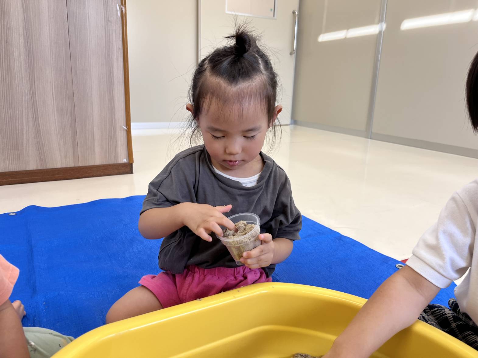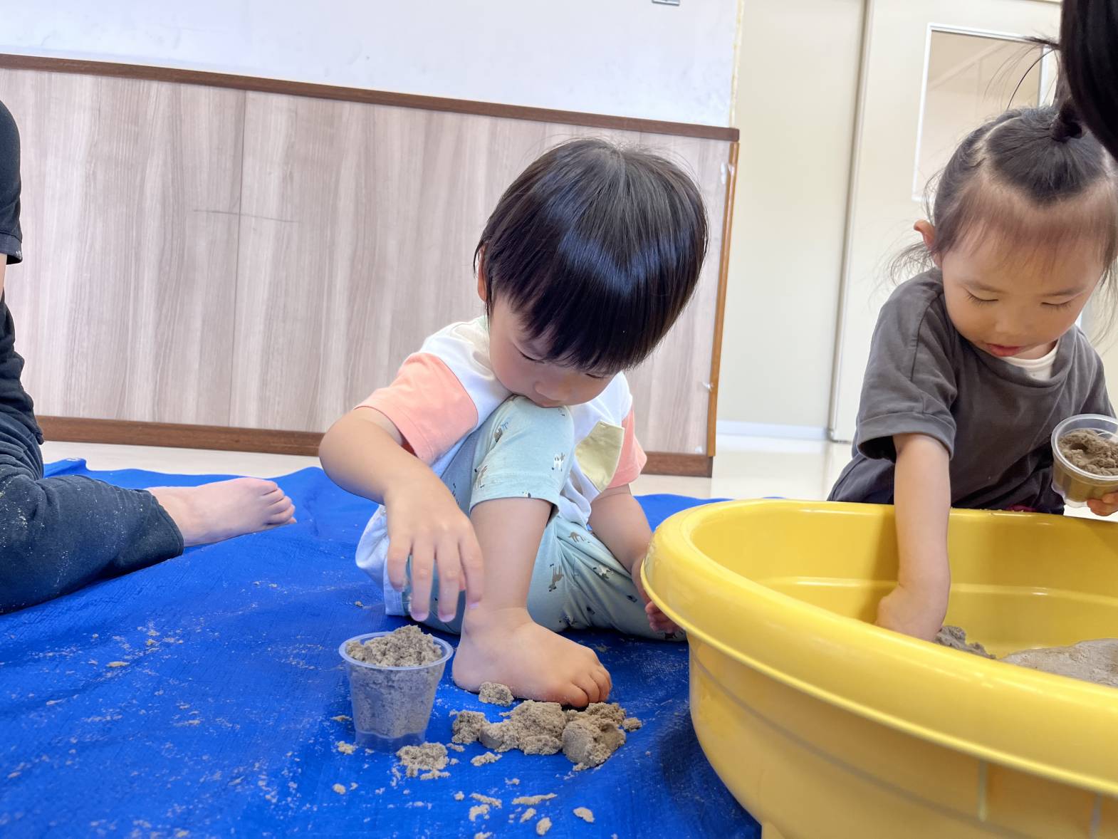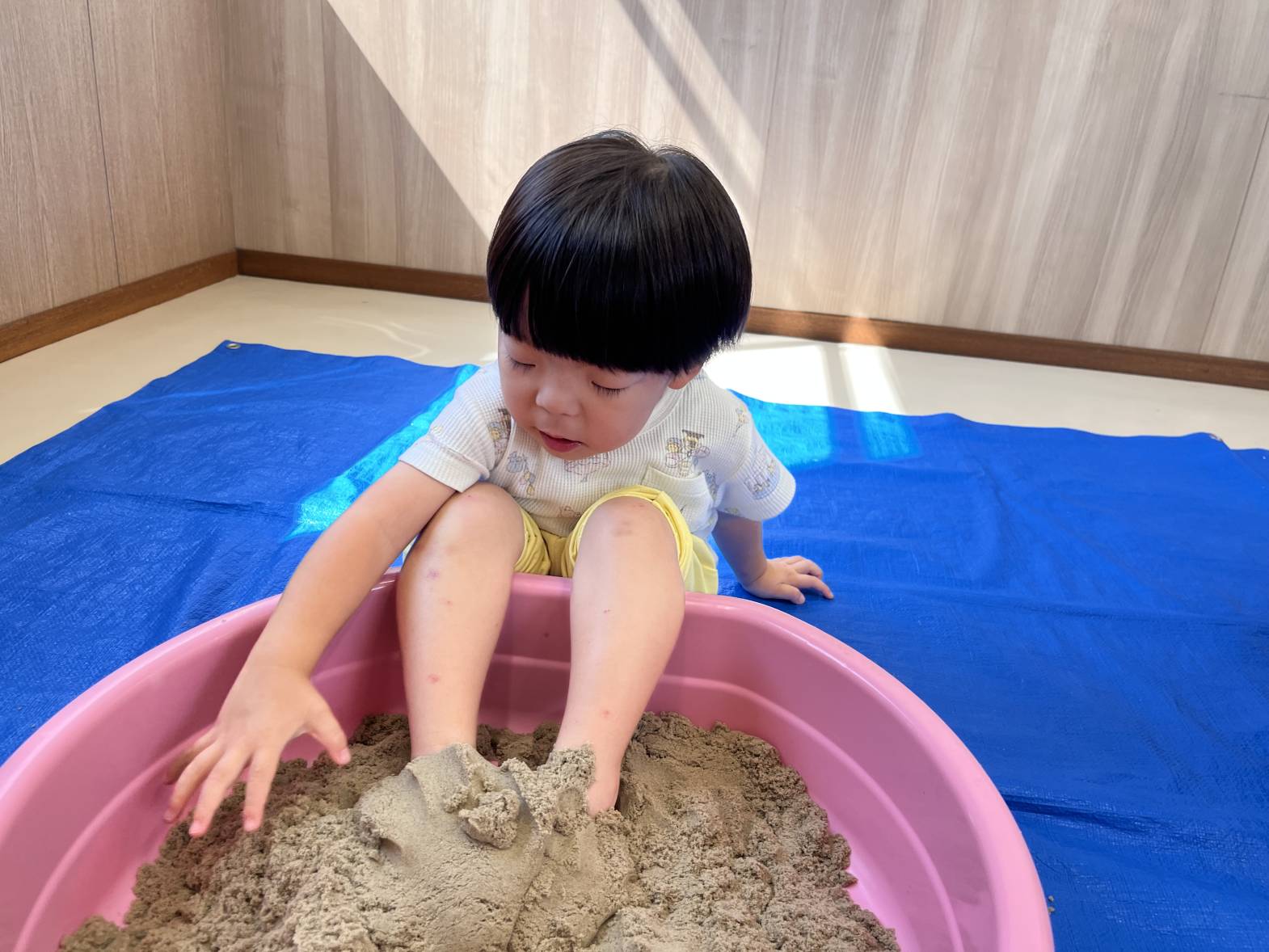いぬ・くまグループでは、砂遊びを行いました。 砂に手のひらを押し付けて手型をつけたり、足を埋めたり、雨のように降らせたりと、感触を楽しむ姿が見られました! カップを使う際は、カップに砂を押し込み、ひっくり返して型を作ることができていました! 最後には、「明日も砂がしたい。」と言う声も聞かれ、次の砂遊びを楽しみにする子どもたちでした♪