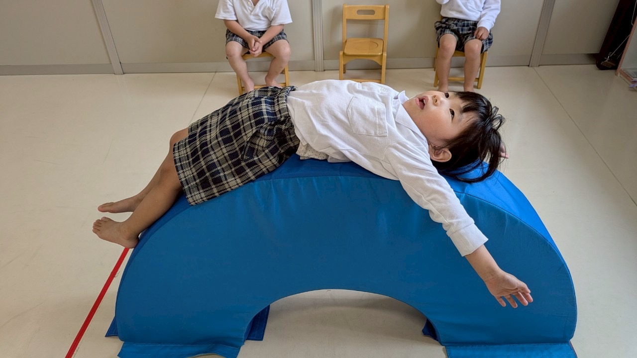 まずは、半円の形をしたマットに腰をつけて寝そべり、腰の反らし方を確認しています。