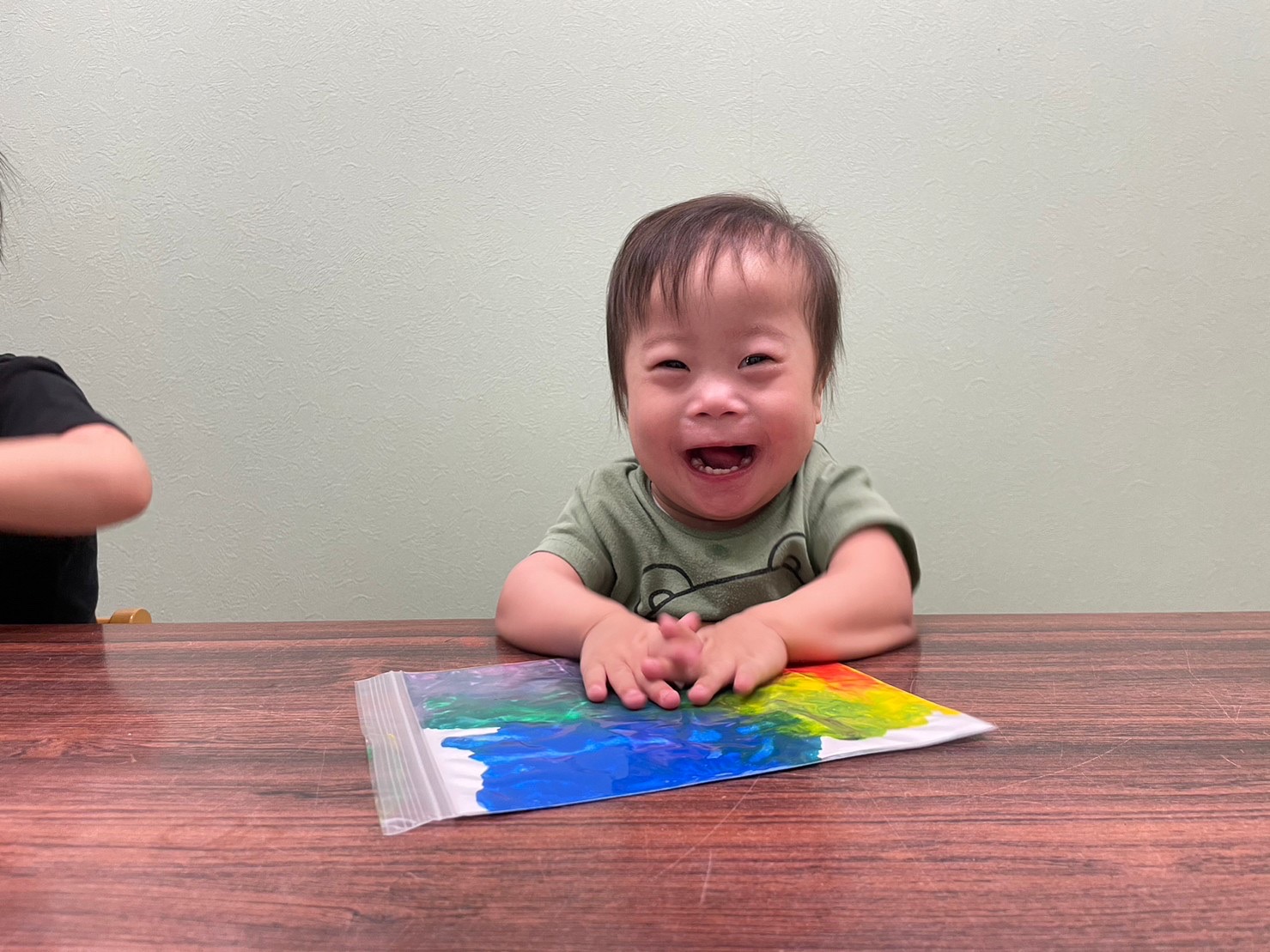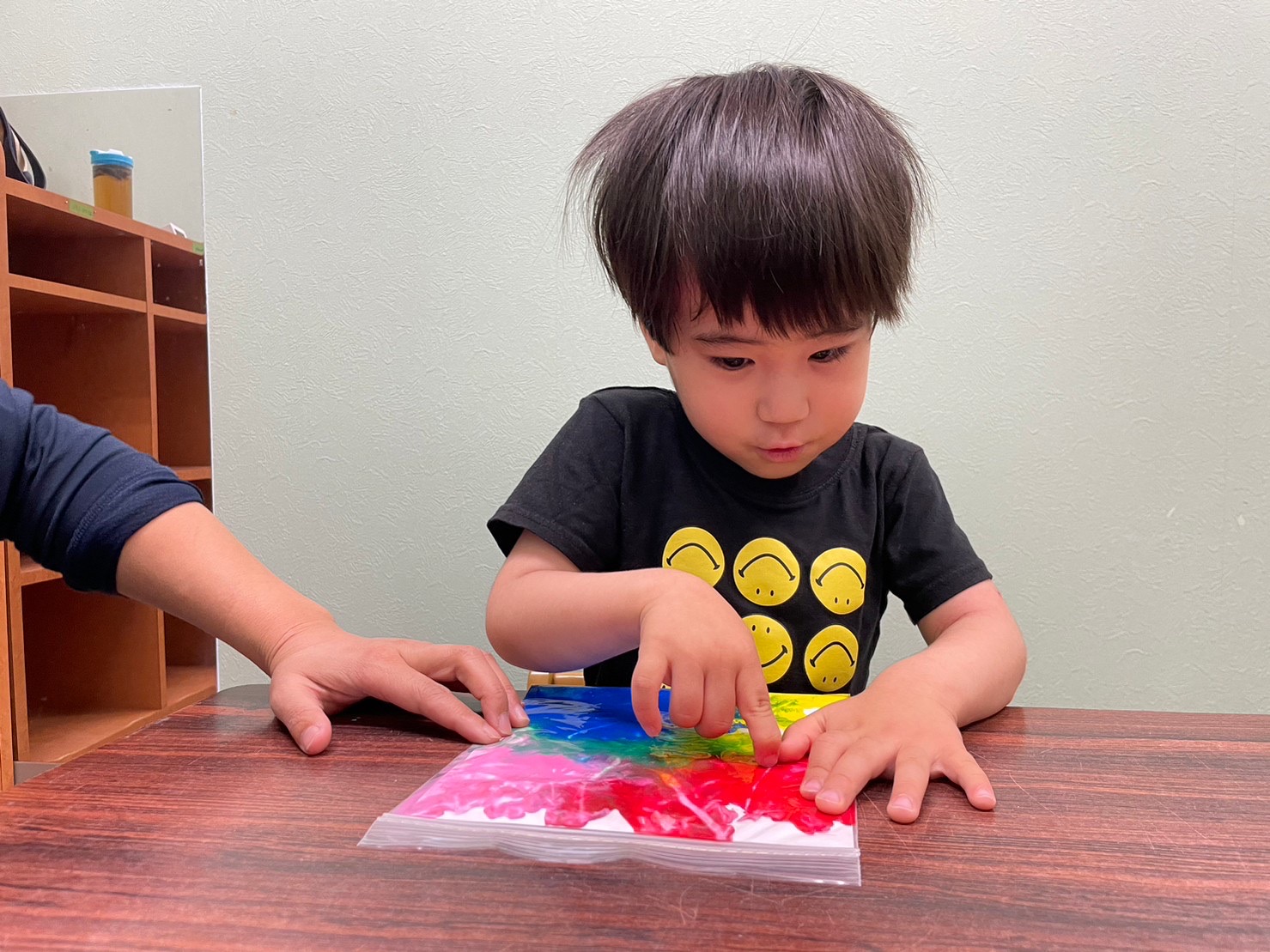 ジップロックに絵の具と水糊を入れて、フィンガーペイントを行いました。 絵の具を触ると、絵の具が動く感触に、「動くよ!」と驚く子どもたち♪ 色が混ざり、色が変化する様子が面白いようです☆ 指で線を描いたり、色を自分で混ぜたりして、感触を十分に味わうことができました!!