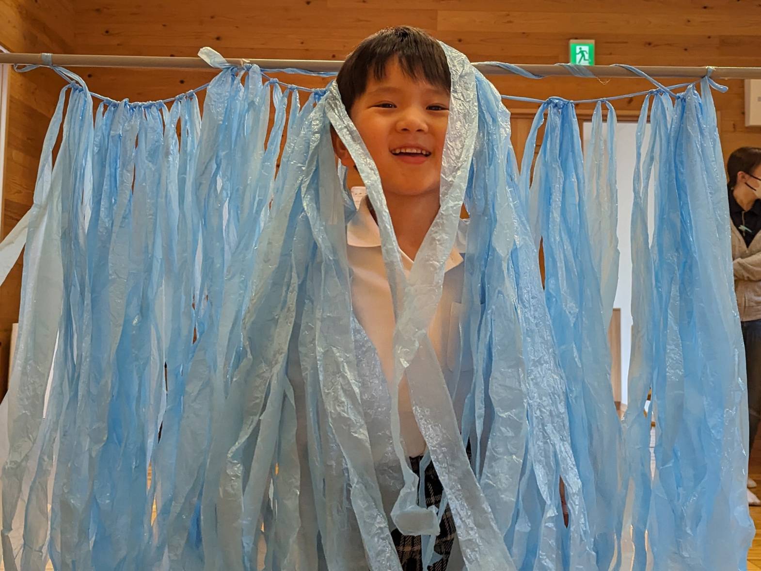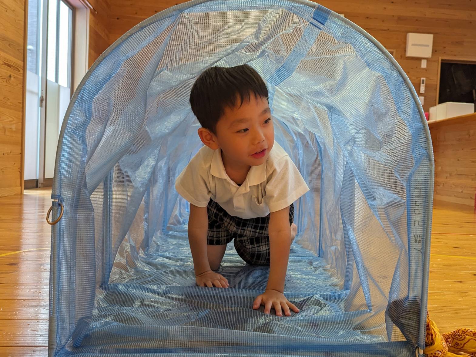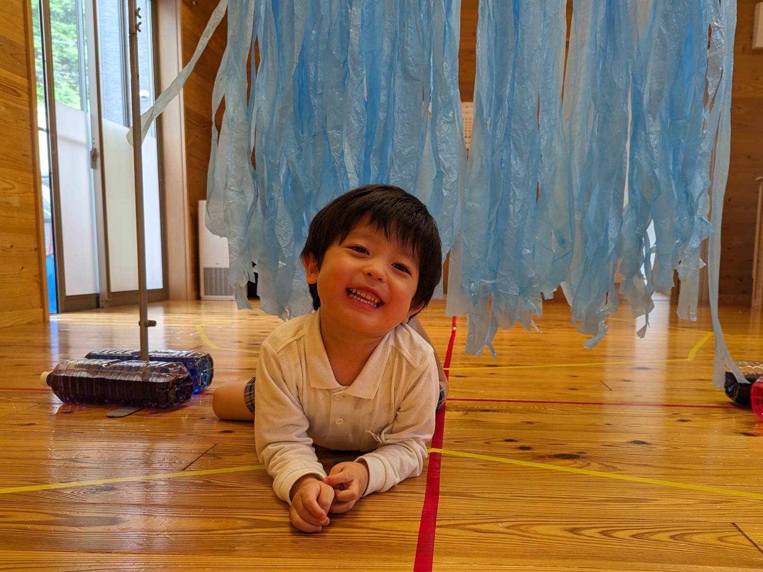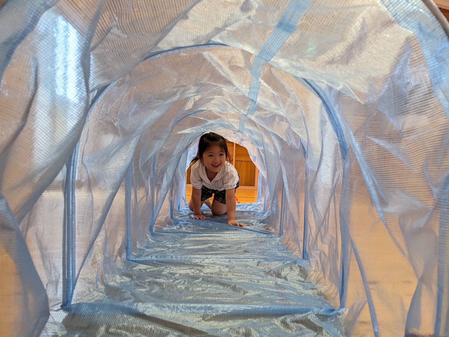 運動遊びで『くぐる』活動をしました! 屈んだり、床にお腹をつけて腕や手の力を使ったりしながら、スズランテープのカーテンの中や下をくぐる子どもたち♪ 長いトンネルをくぐる際は、「みんなどこー?」と出口を目指して、四つ這いでくぐりました! ゴールできると、職員とハイタッチをして喜ぶとらグループさんでしたよ☆