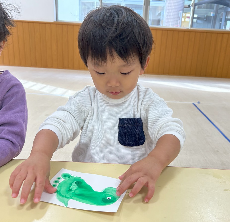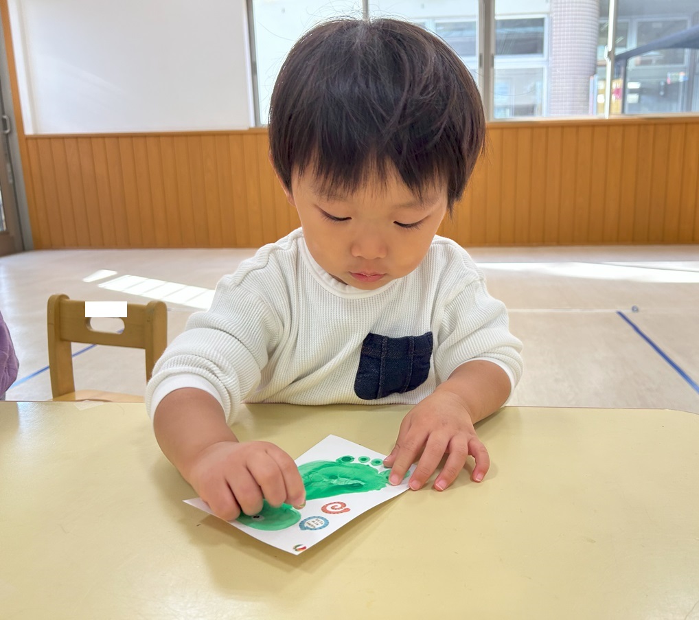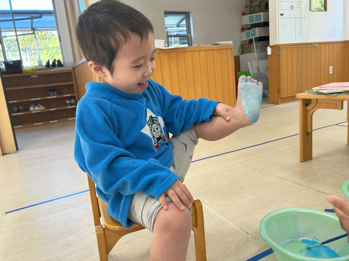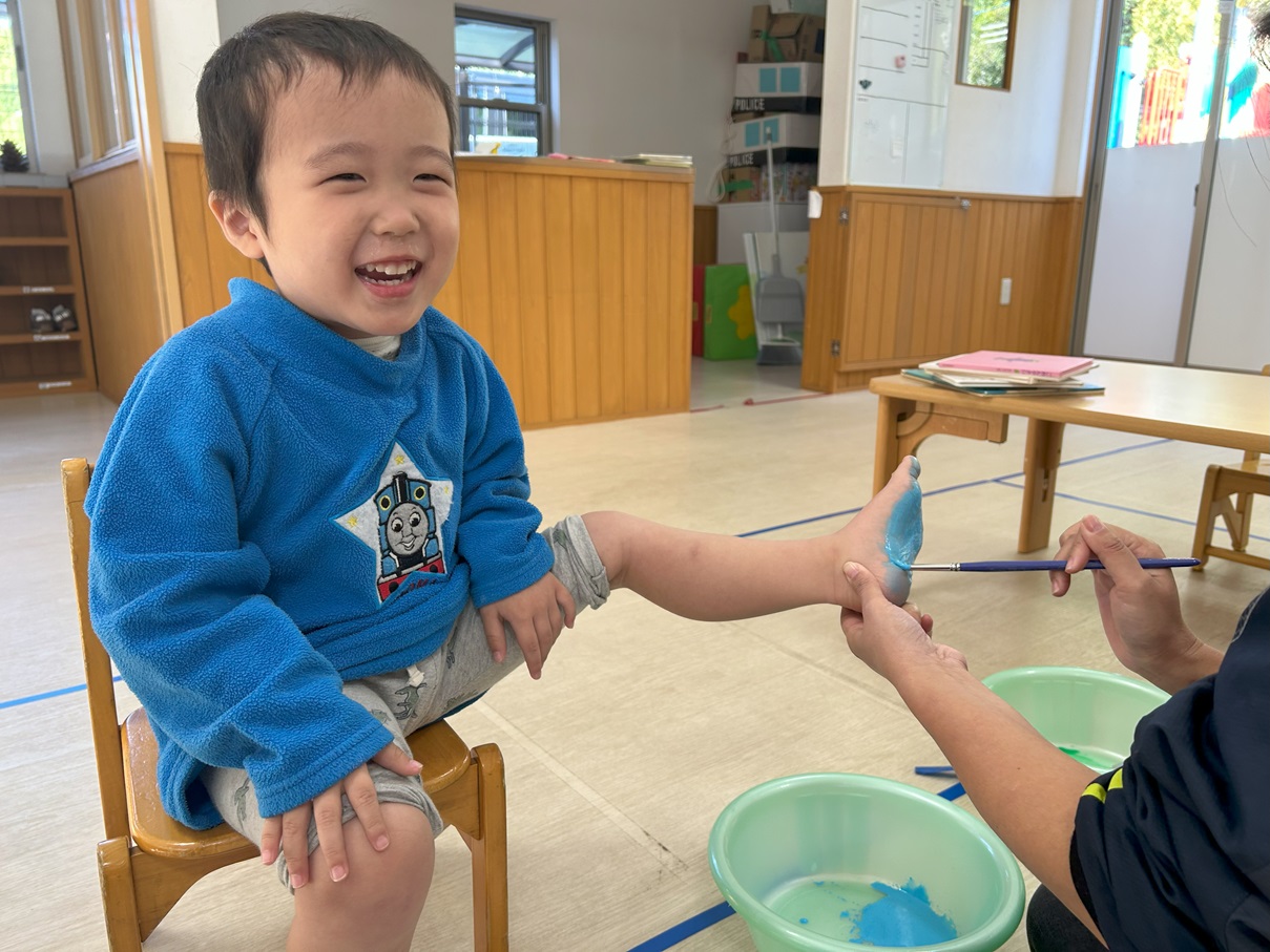 絵の具を塗った後はハガキにぺったん!立派な足形を取ることができました!