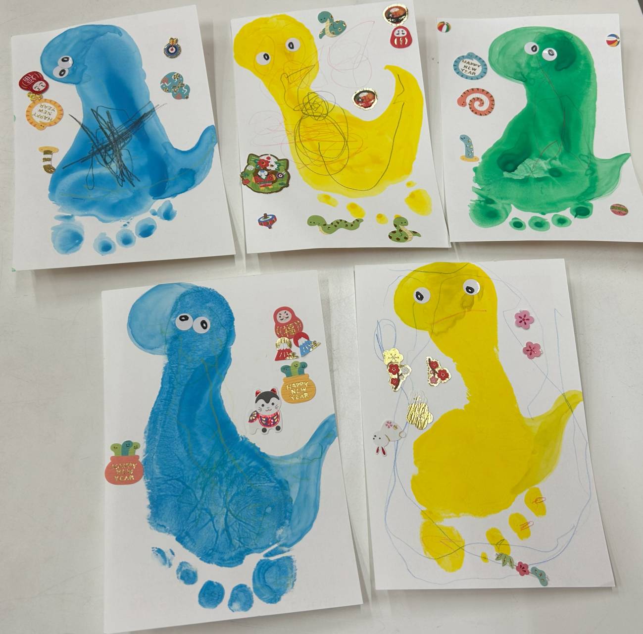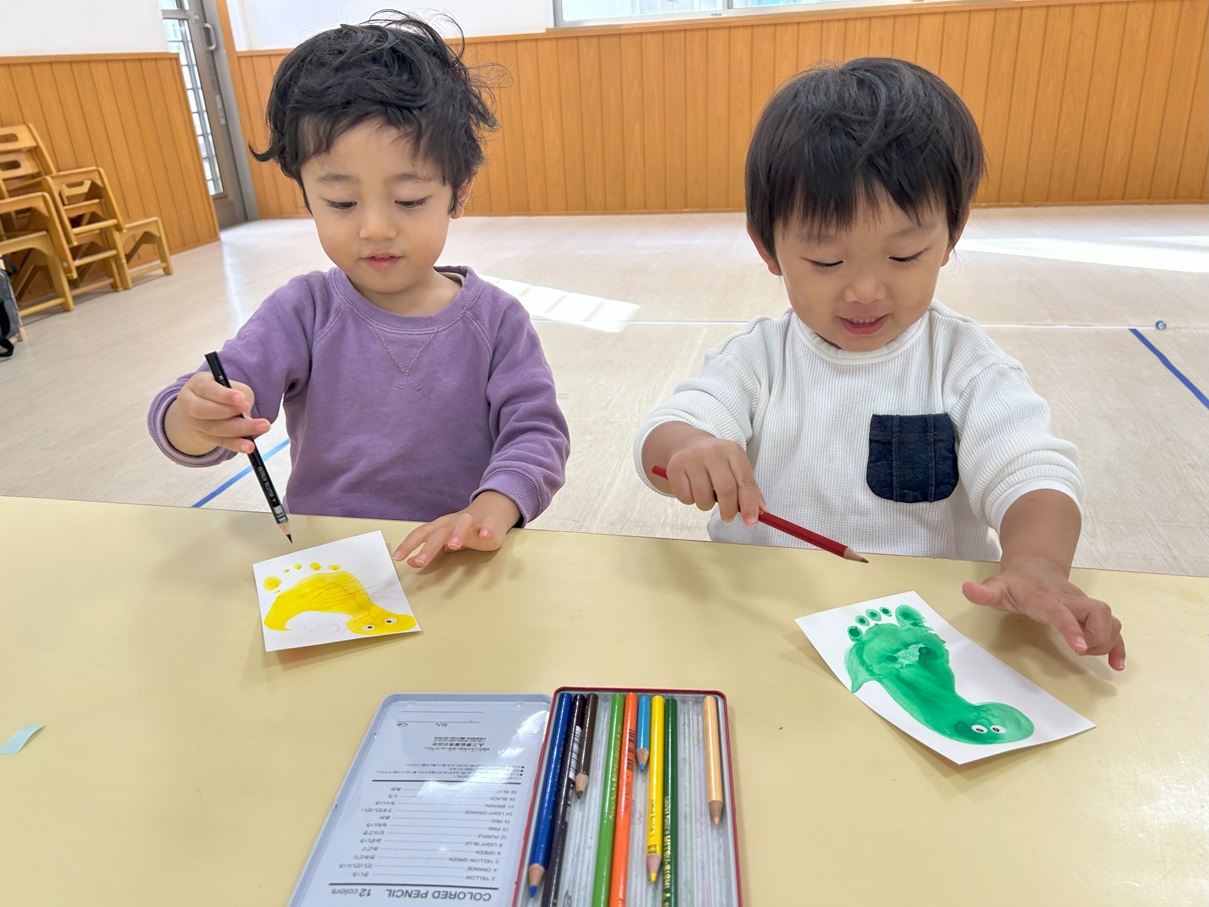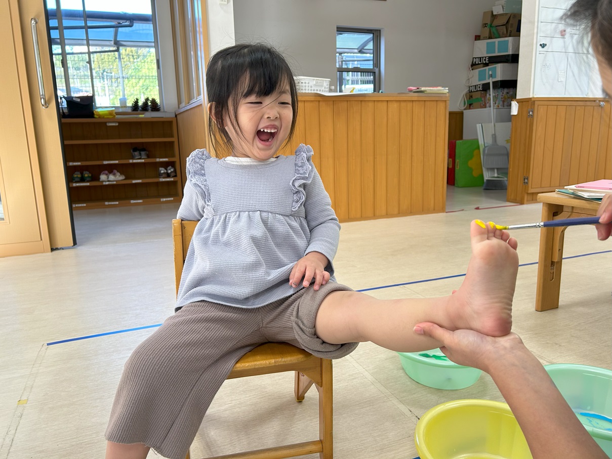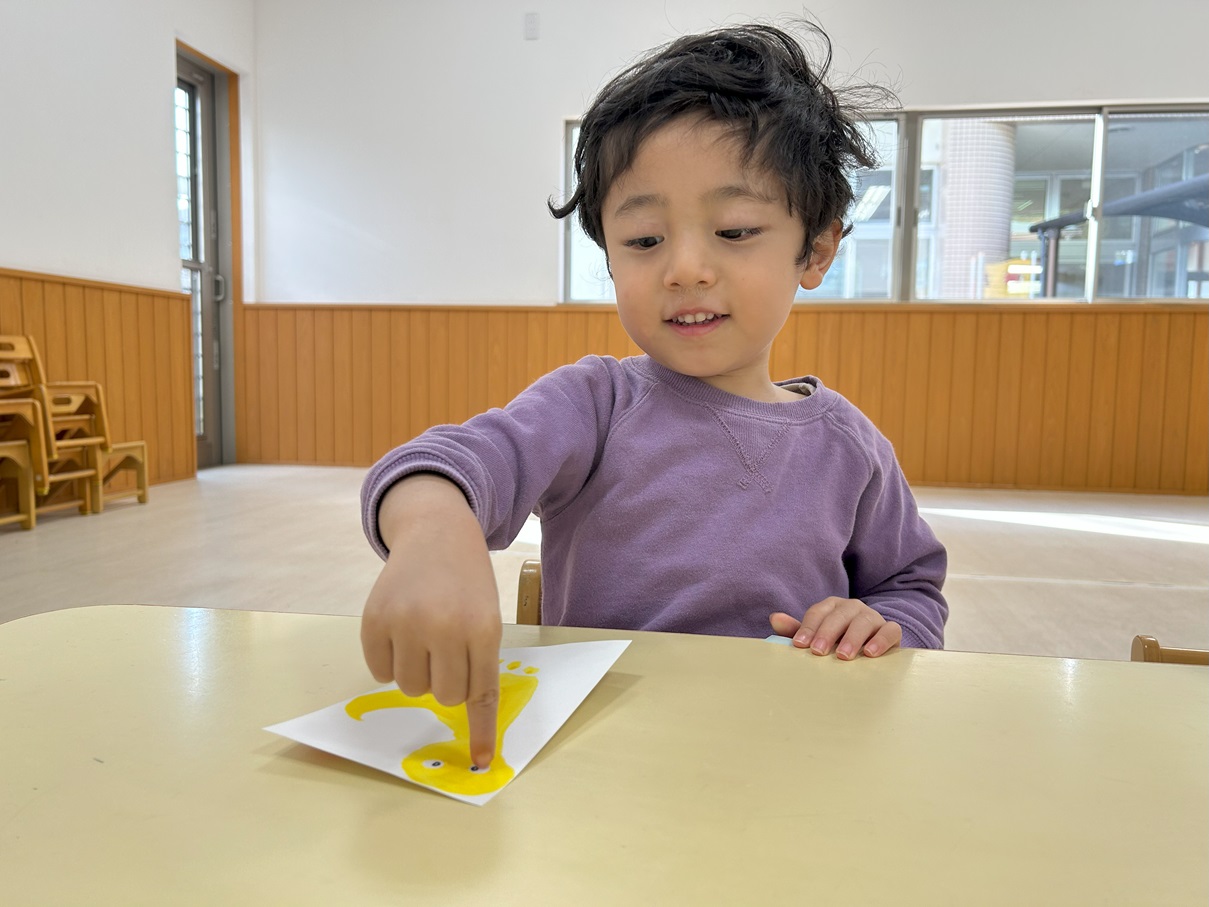 絵の具を塗った後はハガキにぺったん!立派な足形を取ることができました!