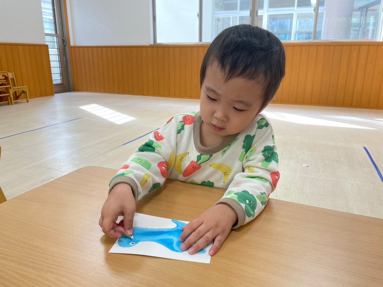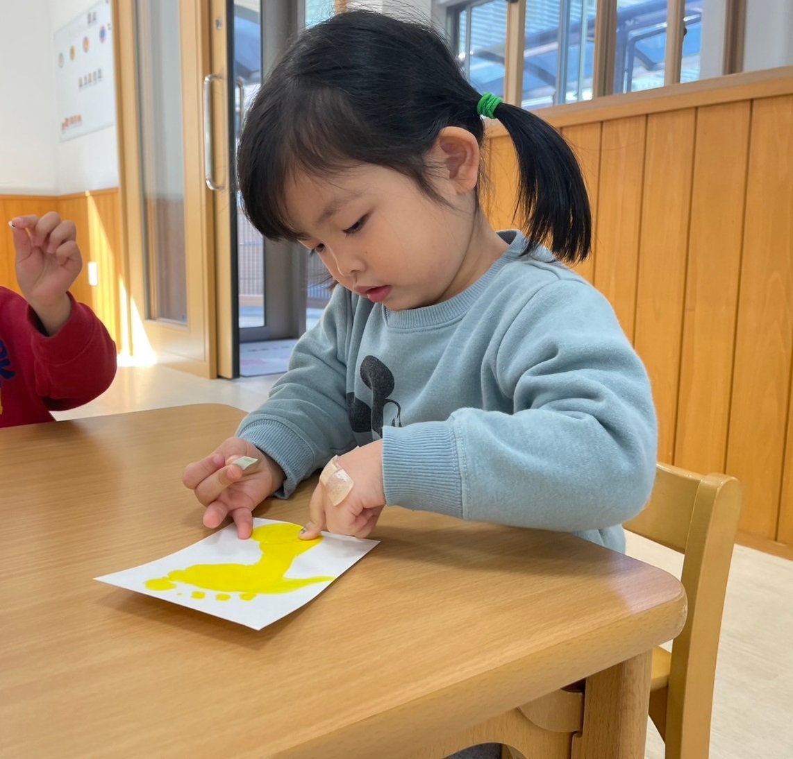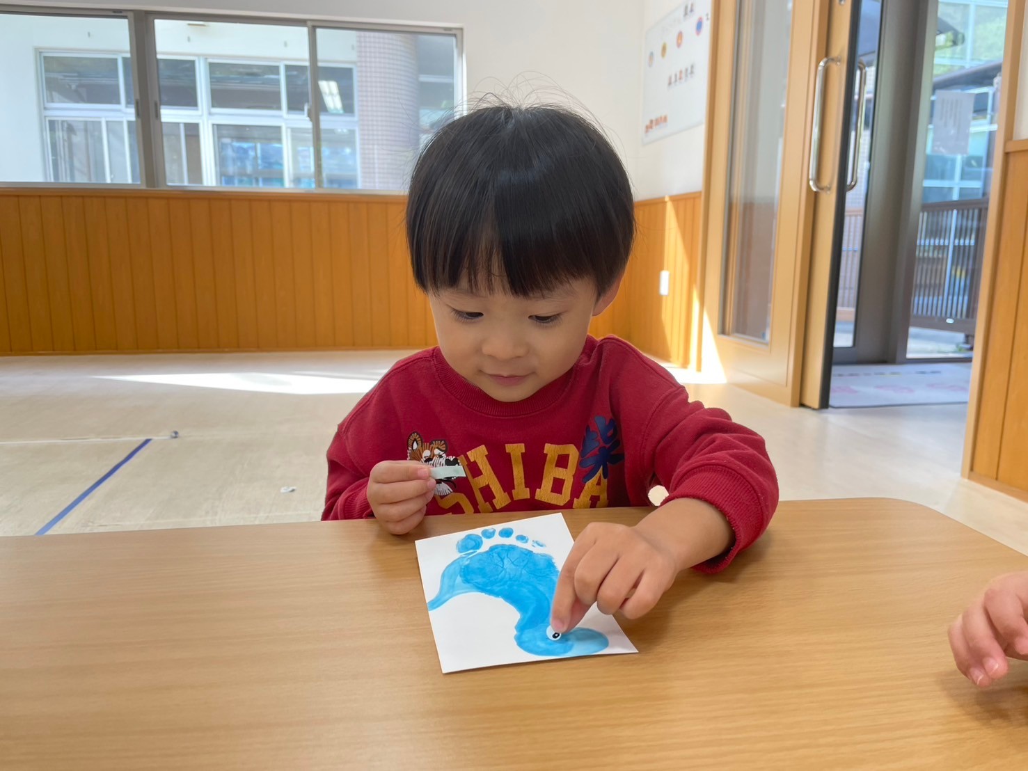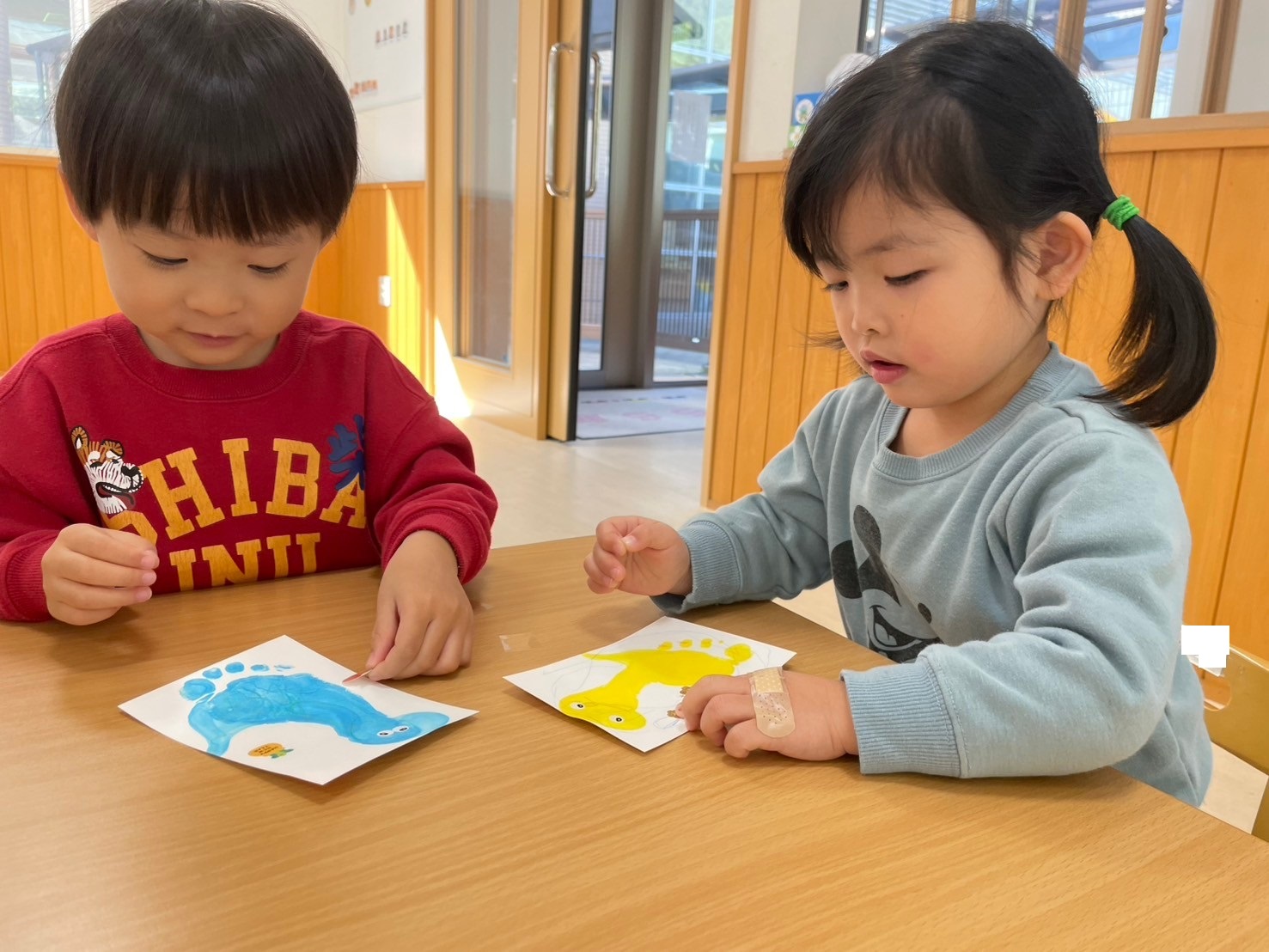 絵の具を塗った後はハガキにぺったん!立派な足形を取ることができました!
