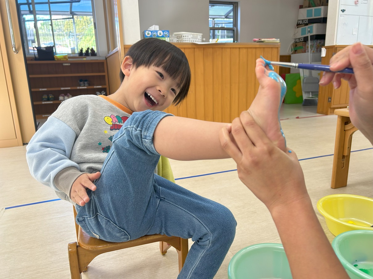水色、緑色、黄色の3色の中から好きな色の絵の具を選んで、足の裏にぬーりぬり!