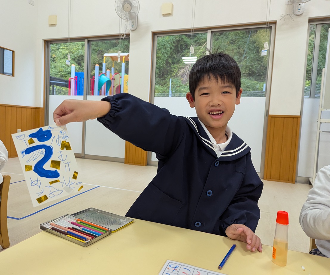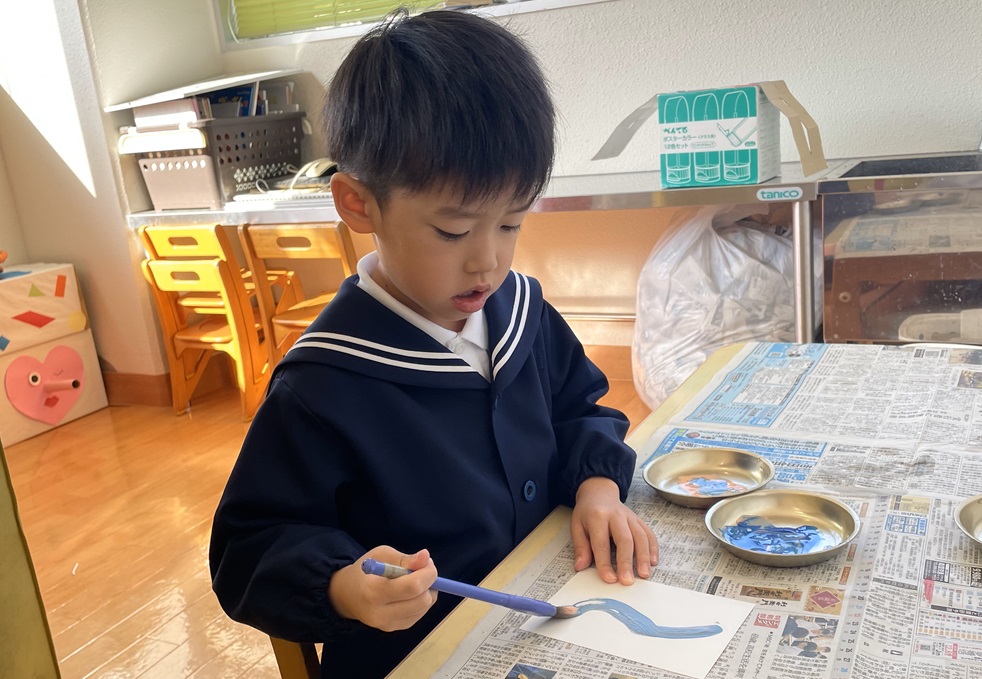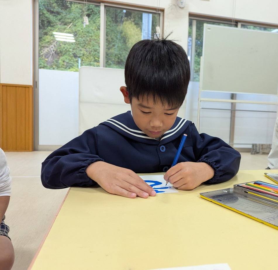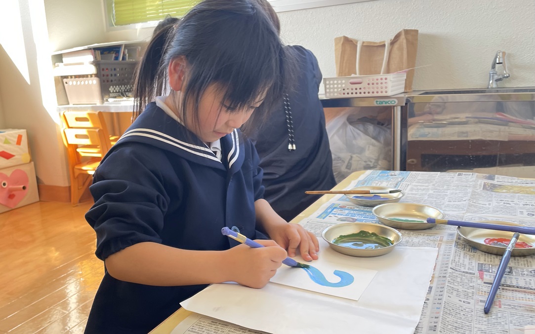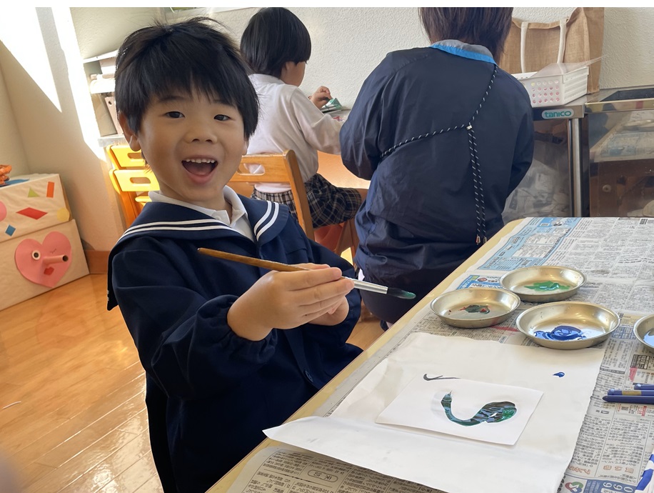 年賀状製作を行いました。 まずは筆でヘビになる線を描いていきます。 慣れない筆にドキドキしながらヘビを描く子どもたち! ヘビの線が乾いたら自分たちで切った折り紙を貼ったり、顔を描いたり、『あけましておめでとうございます』の文字を書いたりして飾りつけをして完成です! 完成した年賀状を見て嬉しそうにする子どもたちでした! 完成した年賀状がご自宅に届くのを楽しみにお待ちくださいね♪