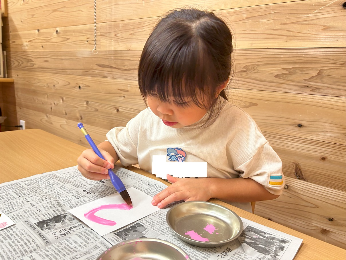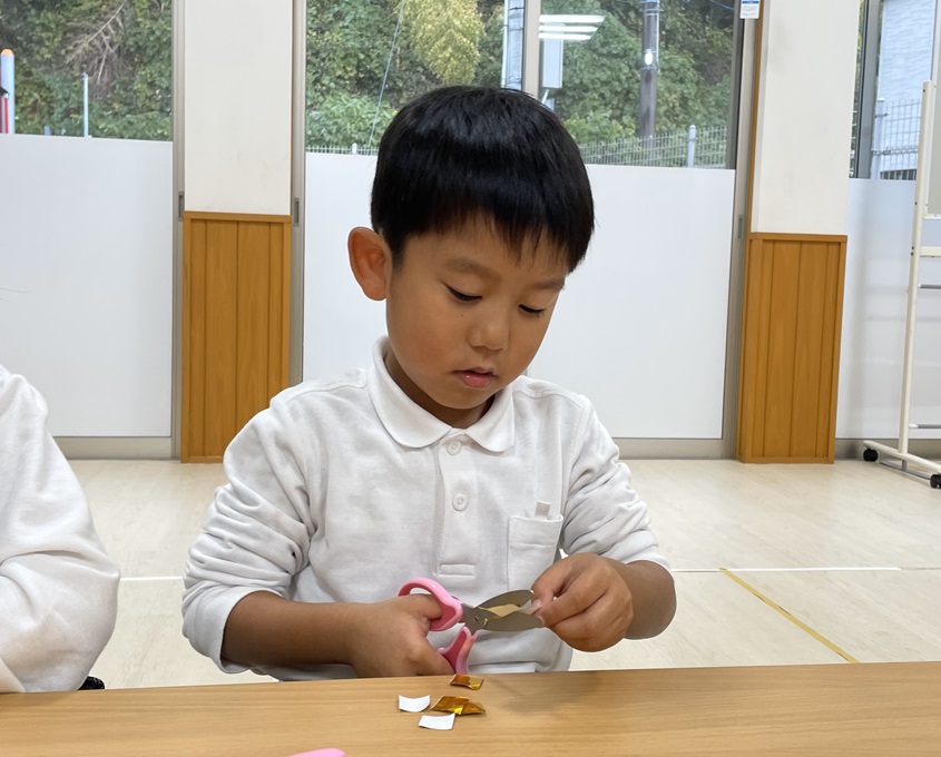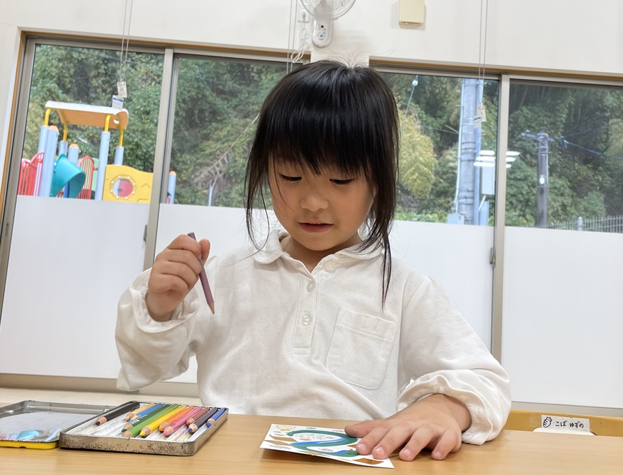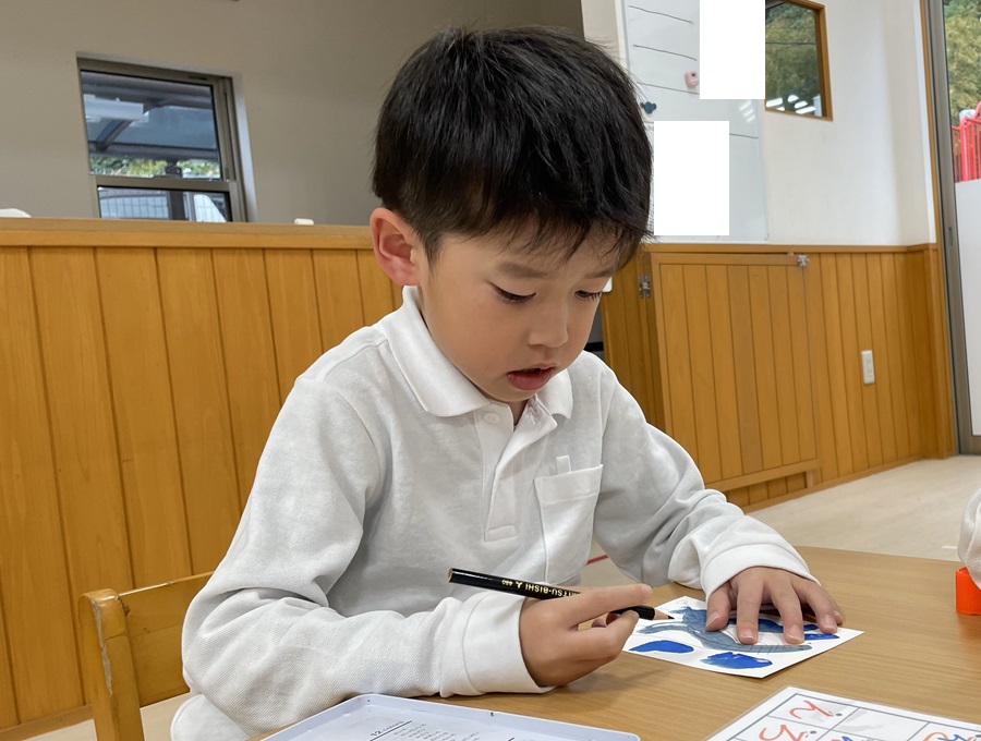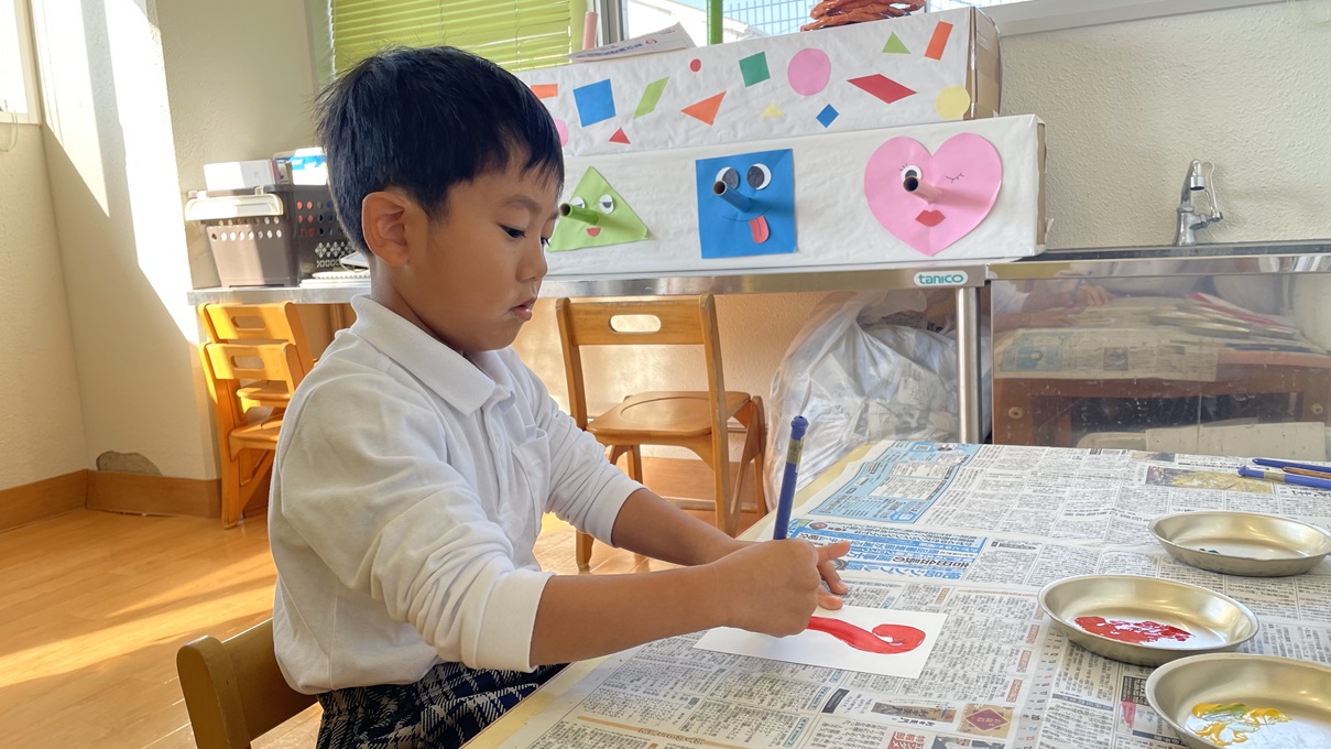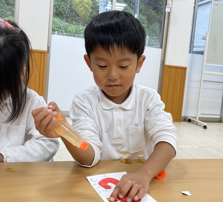 年賀状製作を行いました。 まずは筆でヘビになる線を描いていきます。 慣れない筆にドキドキしながらヘビを描く子どもたち! ヘビの線が乾いたら自分たちで切った折り紙を貼ったり、顔を描いたり、『あけましておめでとうございます』の文字を書いたりして飾りつけをして完成です! 完成した年賀状を見て嬉しそうにする子どもたちでした! 完成した年賀状がご自宅に届くのを楽しみにお待ちくださいね♪