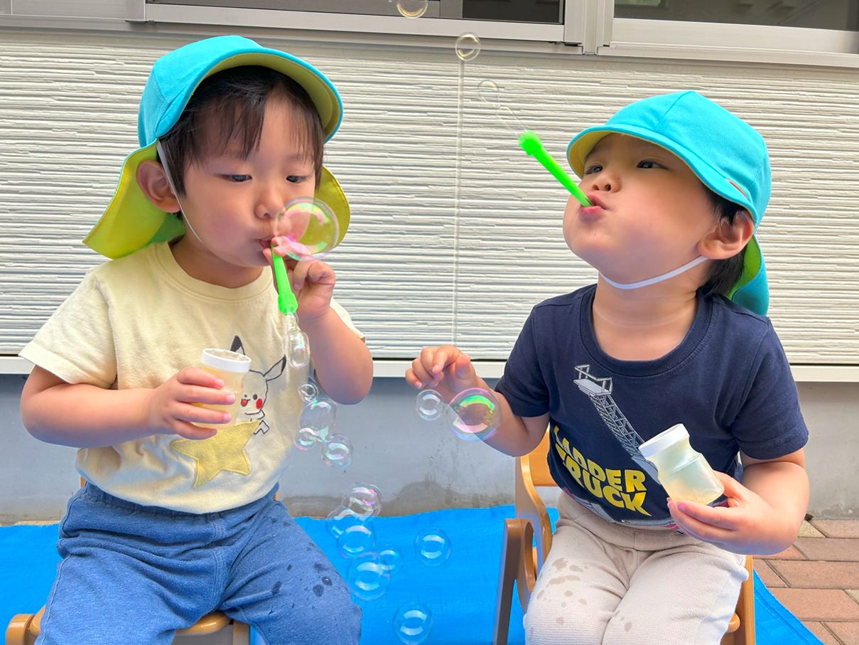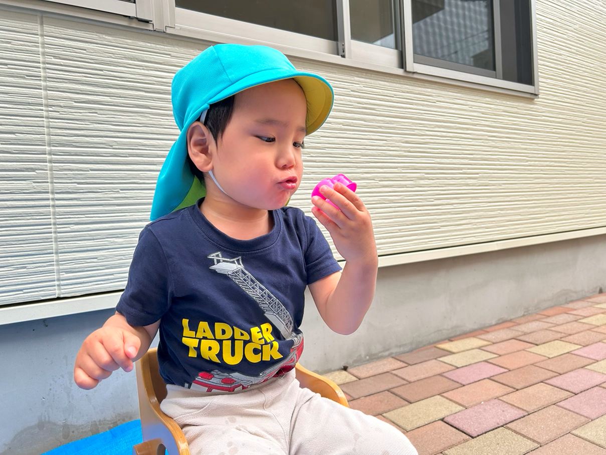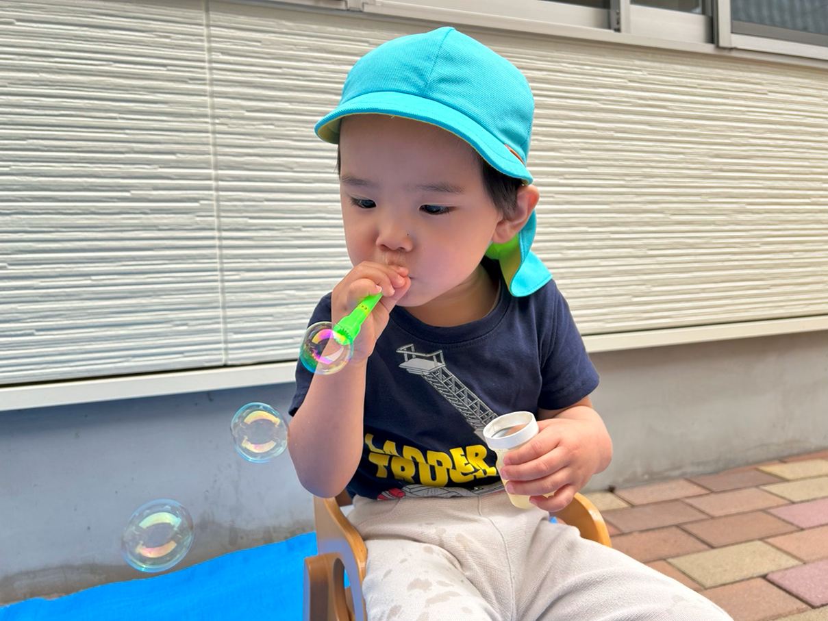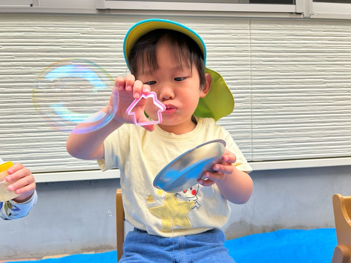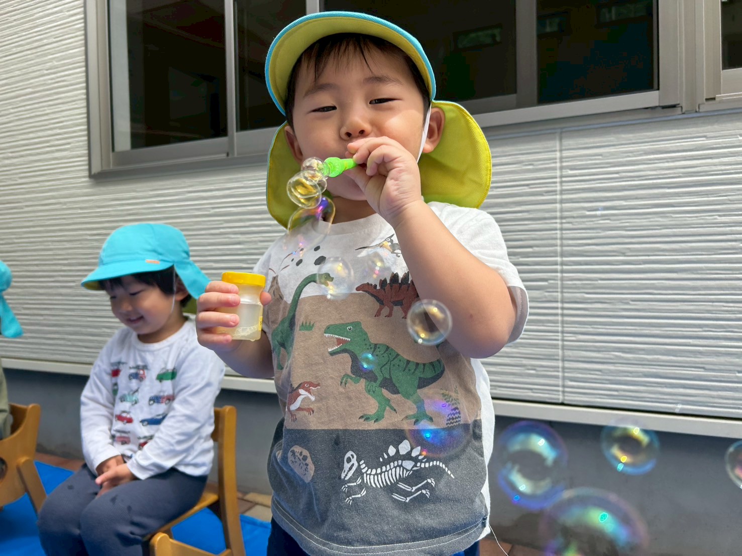 シャボン玉遊びをしました。 シャボン玉遊びをすることを伝えると目を輝かせる子どもたち。 吹き棒を口に咥えると息の量を調整してシャボン玉を作っていきます。 吹き棒以外の道具でもシャボン玉に挑戦したり、お友だちと一緒に吹いたりする姿も見られましたよ! 「きれーい!」、「おっきーい!!」と満面の笑みでシャボン玉を楽しみ、大満足な様子の子どもたちでした!