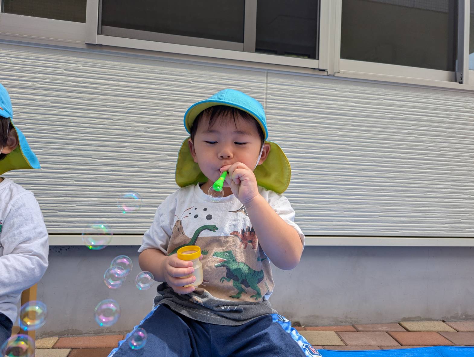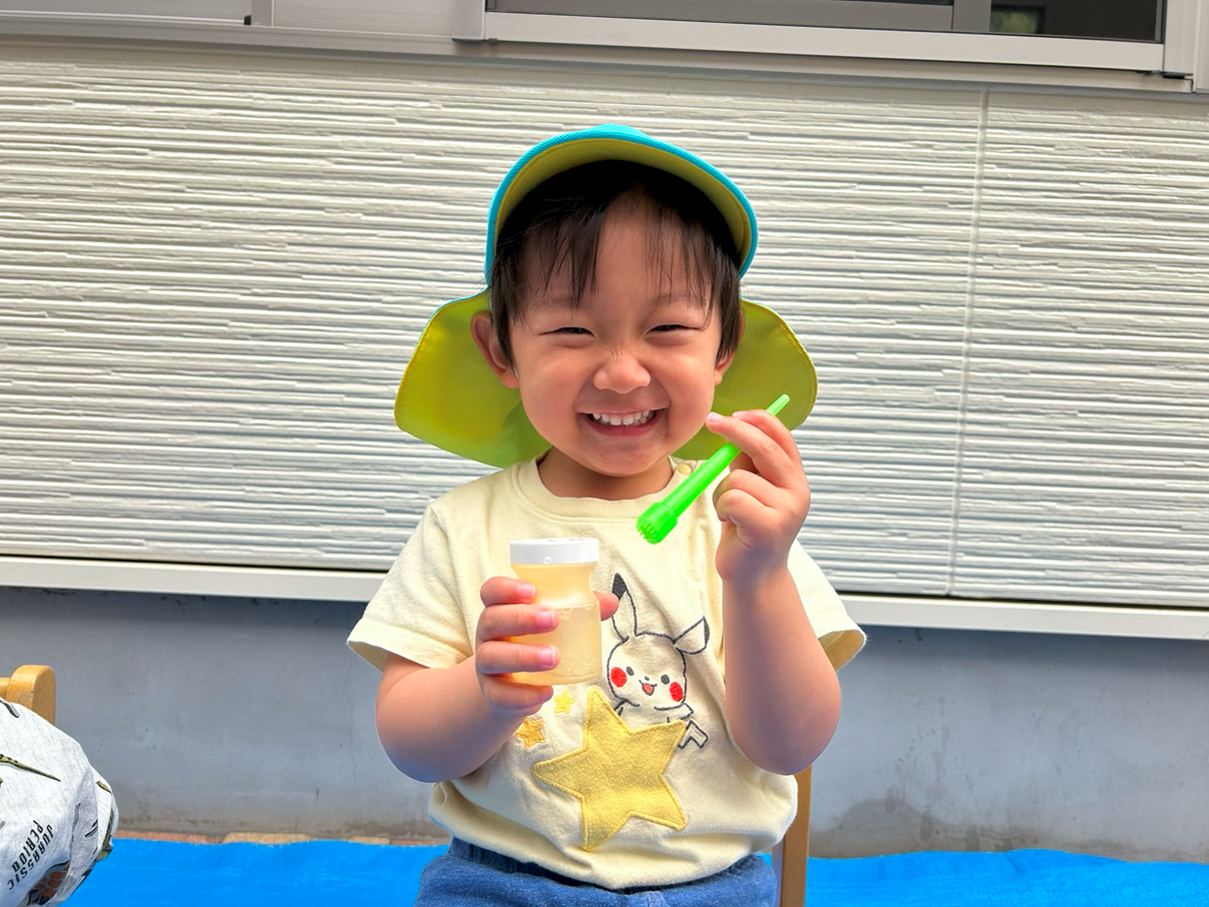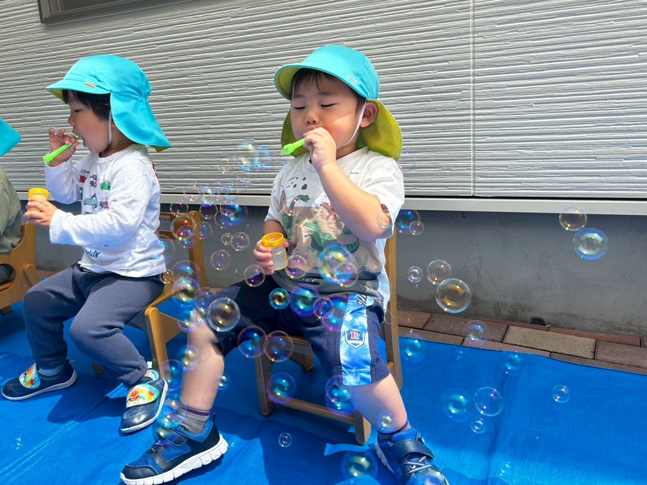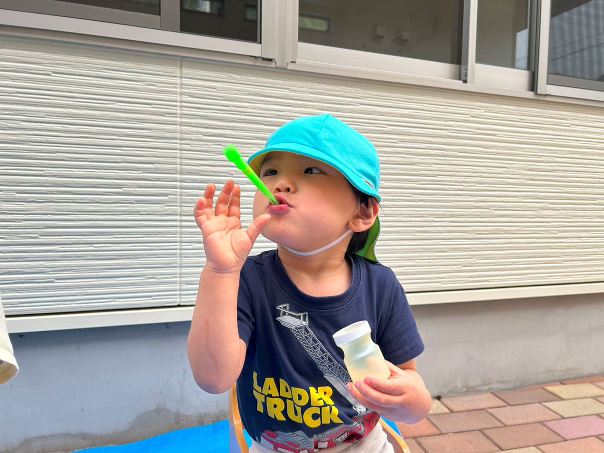 シャボン玉遊びをしました。 シャボン玉遊びをすることを伝えると目を輝かせる子どもたち。 吹き棒を口に咥えると息の量を調整してシャボン玉を作っていきます。 吹き棒以外の道具でもシャボン玉に挑戦したり、お友だちと一緒に吹いたりする姿も見られましたよ! 「きれーい!」、「おっきーい!!」と満面の笑みでシャボン玉を楽しみ、大満足な様子の子どもたちでした!