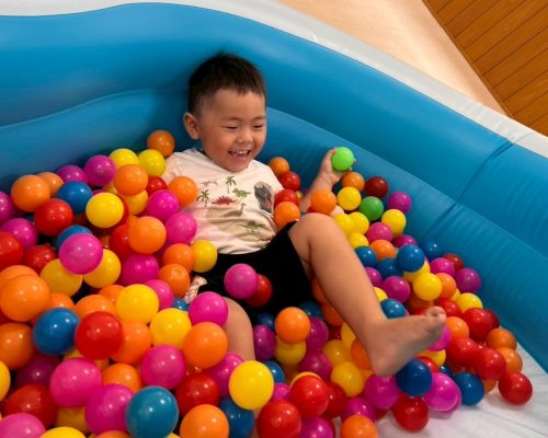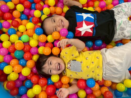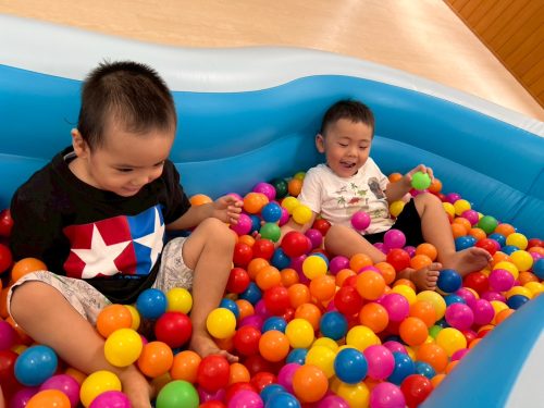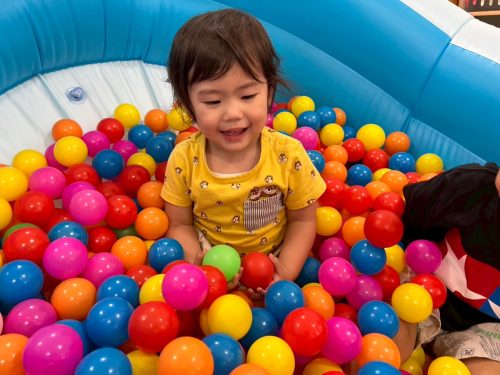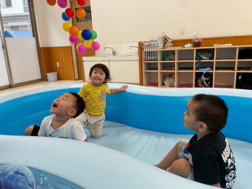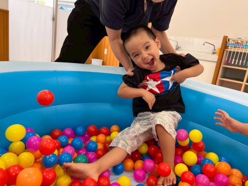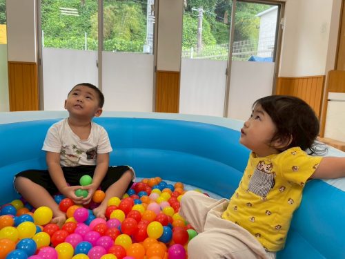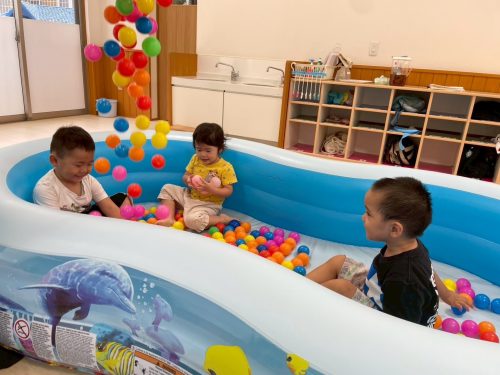 ボールプールをしました。 今までのボールプールをした時の経験からビニールプールの中に入るとすぐに座り、カラーボールが降ってくることを楽しみに上を見上げて待つ子どもたち! たくさんのカラーボールが降ってくると、「キャー!」、「いっぱーい!」と楽しそうな声が聞こえてきます♪ 寝転がったり、揺れを感じたり、ボールをかき分けたりしながら全身で感触を味わい、楽しむ様子が見られました! 活動時間いっぱい笑顔で楽しみ、大満足な様子の子どもたちでした!