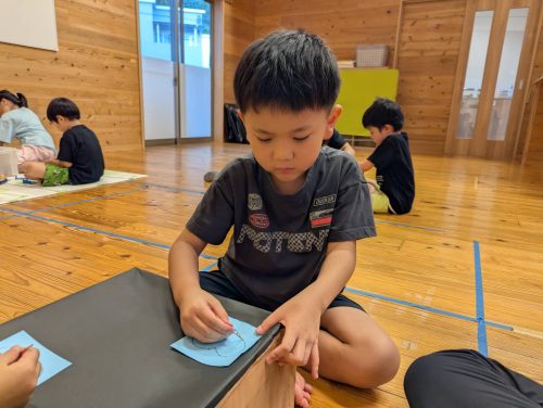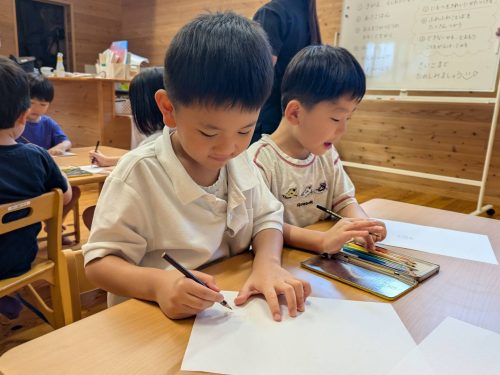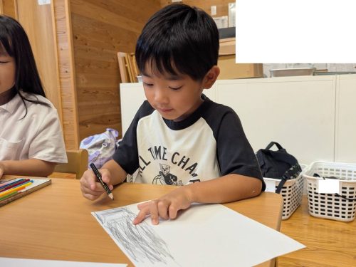 翌日は、お泊まり活動の思い出を絵に描いて発表し、振り返りをしています。