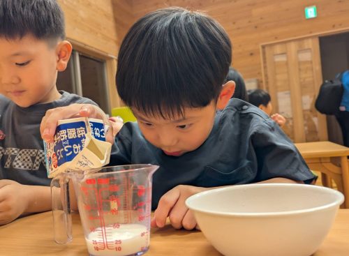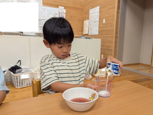 計量カップに牛乳を入れて、フルーチェの素と混ぜ合わせて自分でデザートを作ることに挑戦しましたよ!
