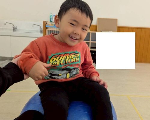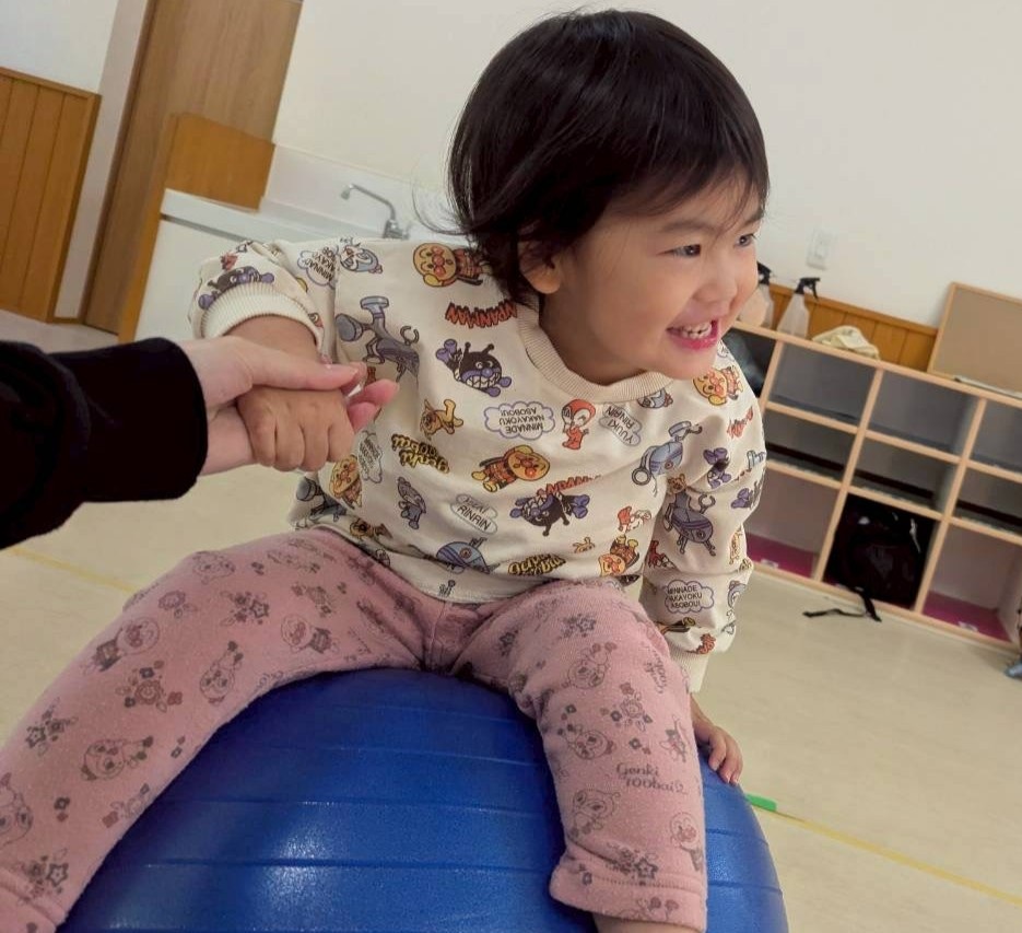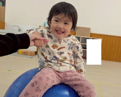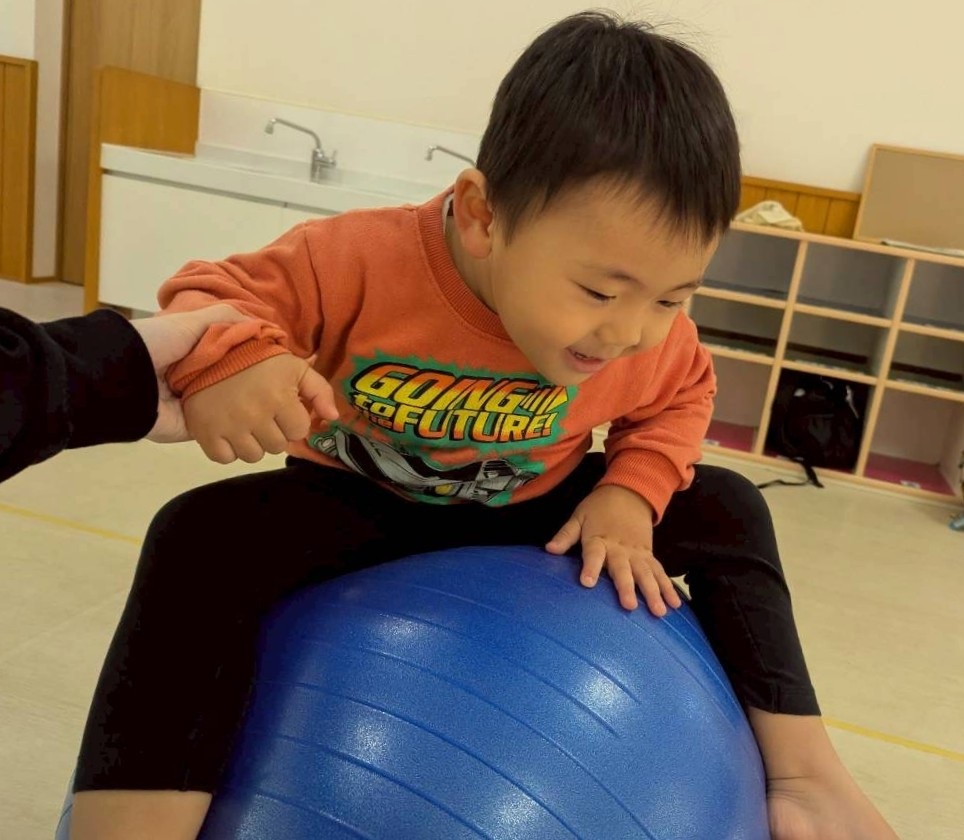 バランスボールの活動を行いました。 大きなバランスボールを見て、「うわあ!」、「おっきいい!!」と目を輝かせる子どもたち。 バランスボールの上に座ってバランスを取る姿が見られました! バランスを崩しそうになると、「おっとっと。」、「落ちちゃう。」と話しながら揺れを笑顔で楽しむ子どもたちでした!