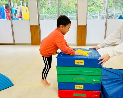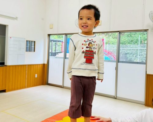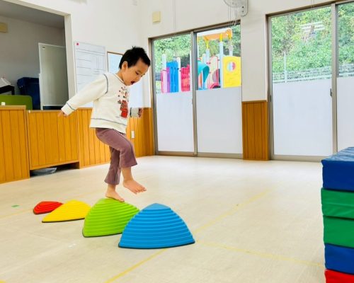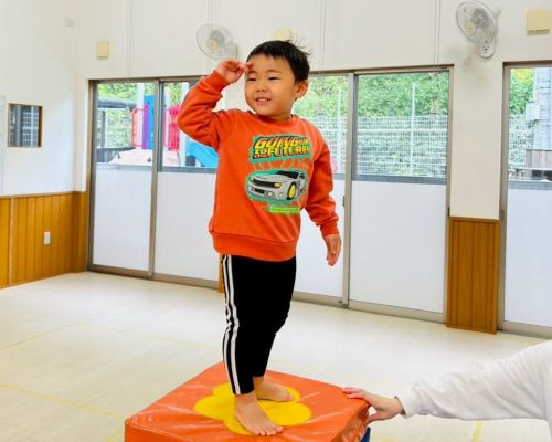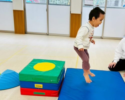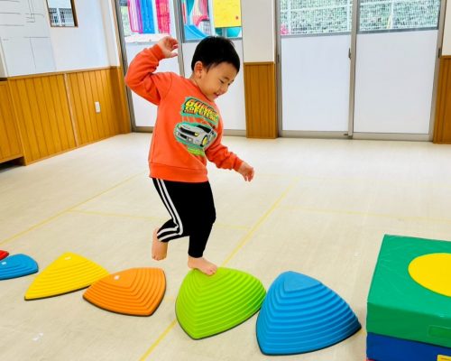 運動遊びで登る活動を行いました! 最初は低い順に並べられたバランスストーンの上を床に足がつかないようにバランスを取りながら進みます。 落ちないように慎重に渡っていく姿が見られましたよ! 渡り終えると積み重ねられたジャンピングマットの上に登ってマットに向かってジャンプ! 最高8段の高さまで挑戦し、普段よりも高い目線からの景色を眺めては満面の笑みを浮かべる子どもたちでした!