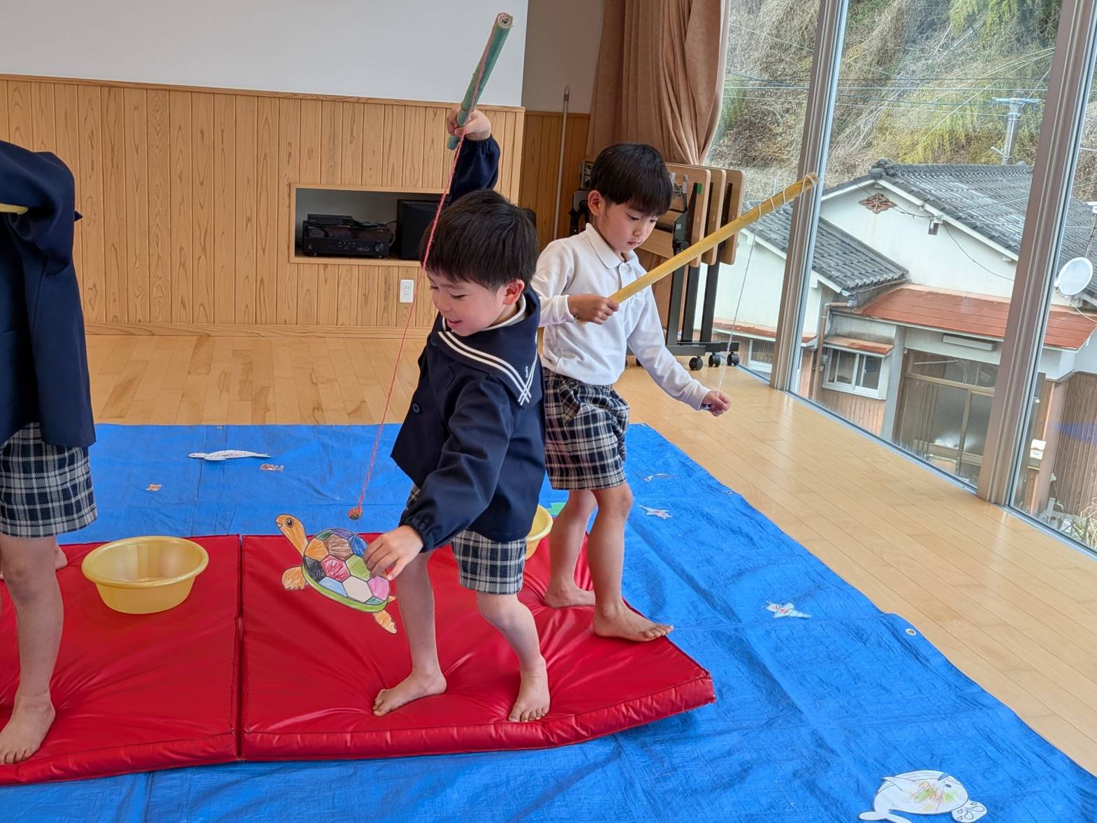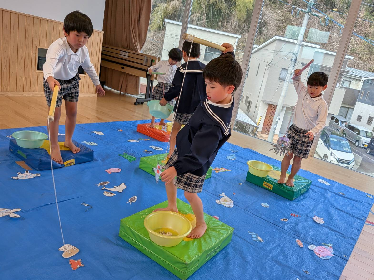 魚釣りゲームでは、ブルーシートを『海』、カラーマットを『船』に見立てて、船の上から磁石の付いた釣り竿で魚釣りをしました。