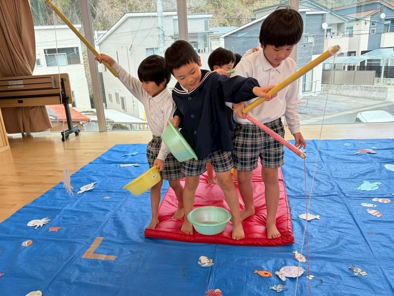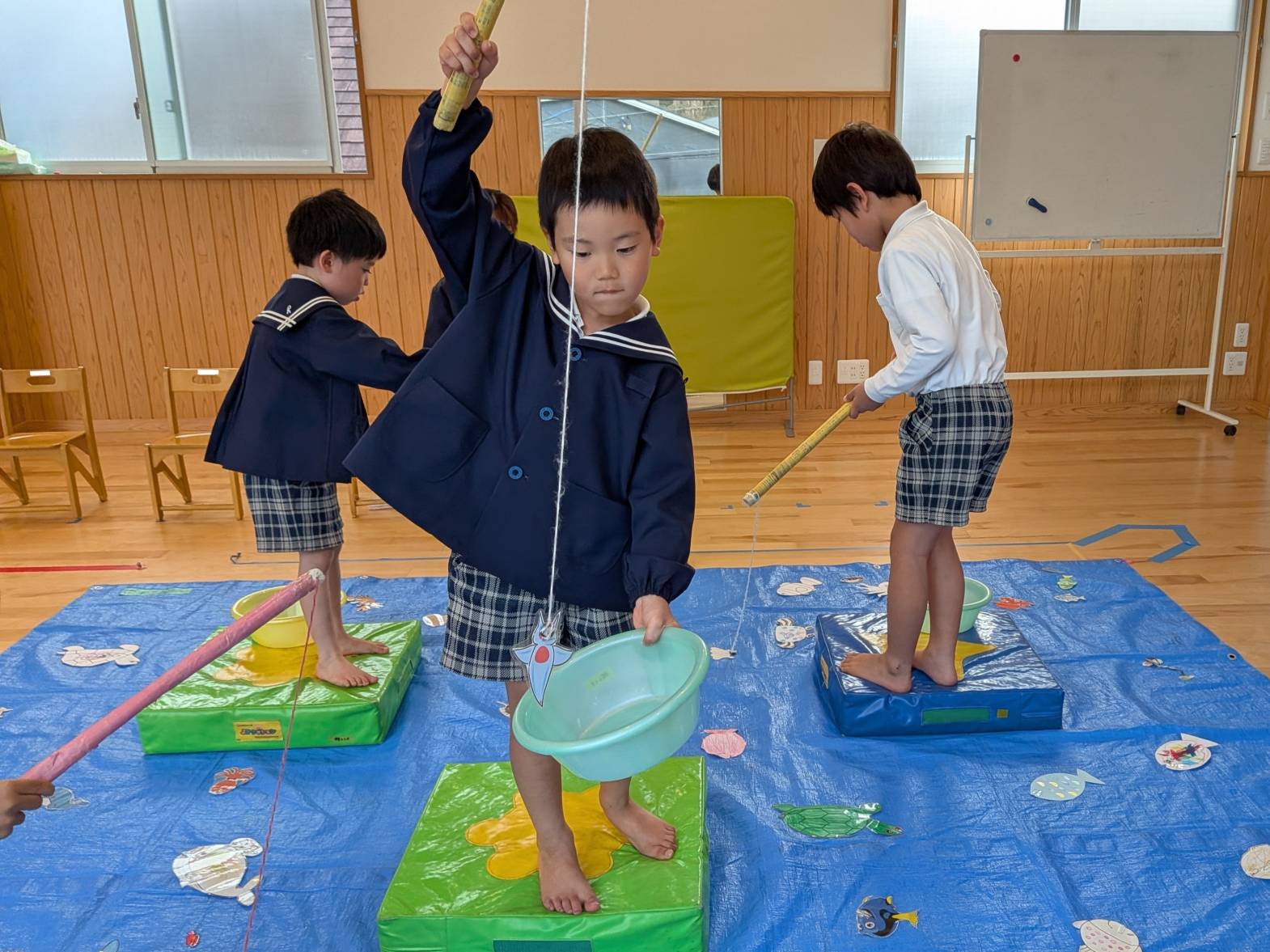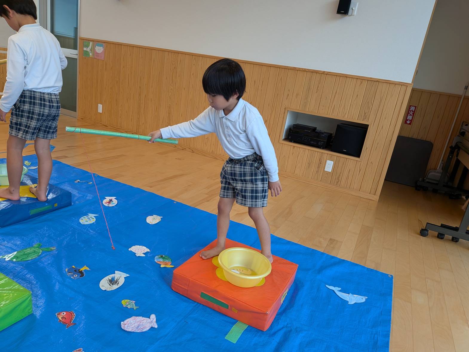 魚釣りゲームでは、ブルーシートを『海』、カラーマットを『船』に見立てて、船の上から磁石の付いた釣り竿で魚釣りをしました。