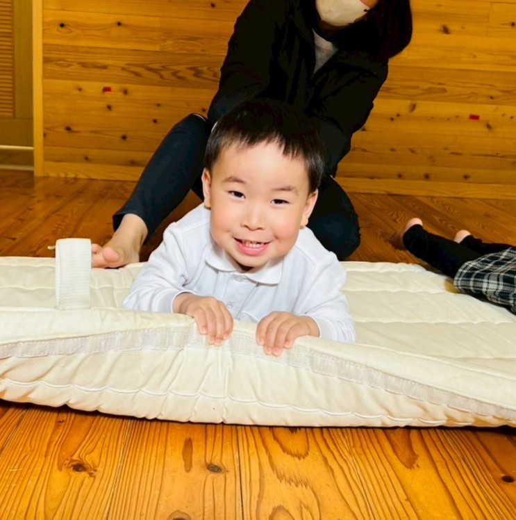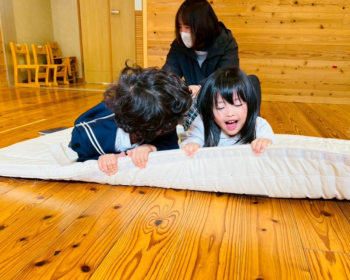 マットから手が離れないようにマットの端をしっかり握る子どもたち。