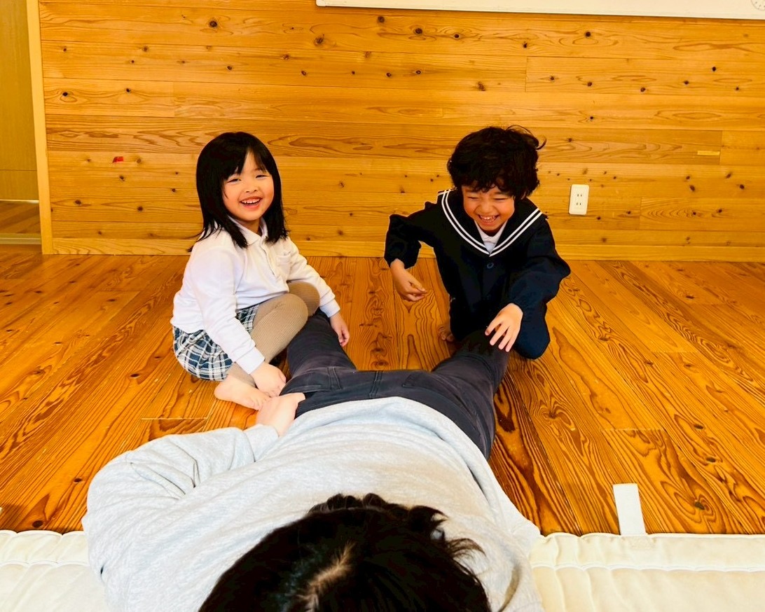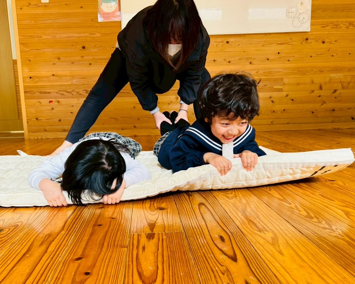 マットの上にうつ伏せになって足を引っ張られる大根役と大根を抜く役に分かれてゲームを行います!