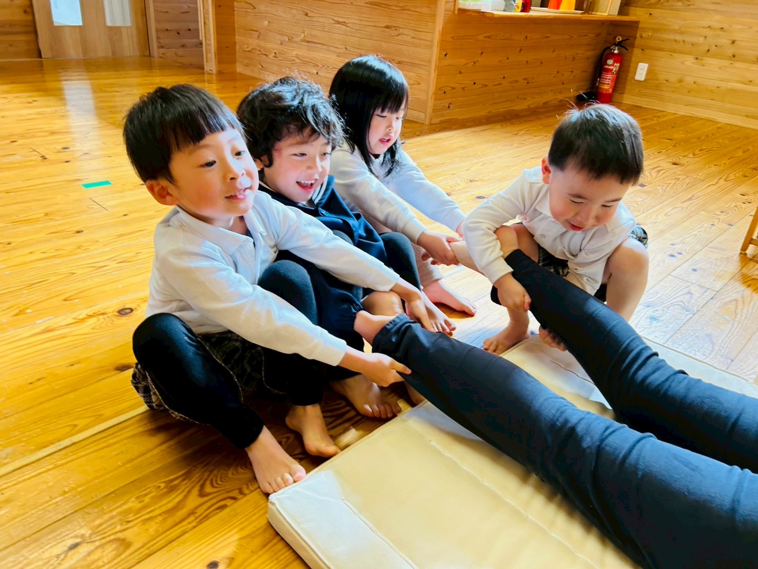 お友だちと協力しながら腕や足に力を入れて引くことができましたよ!