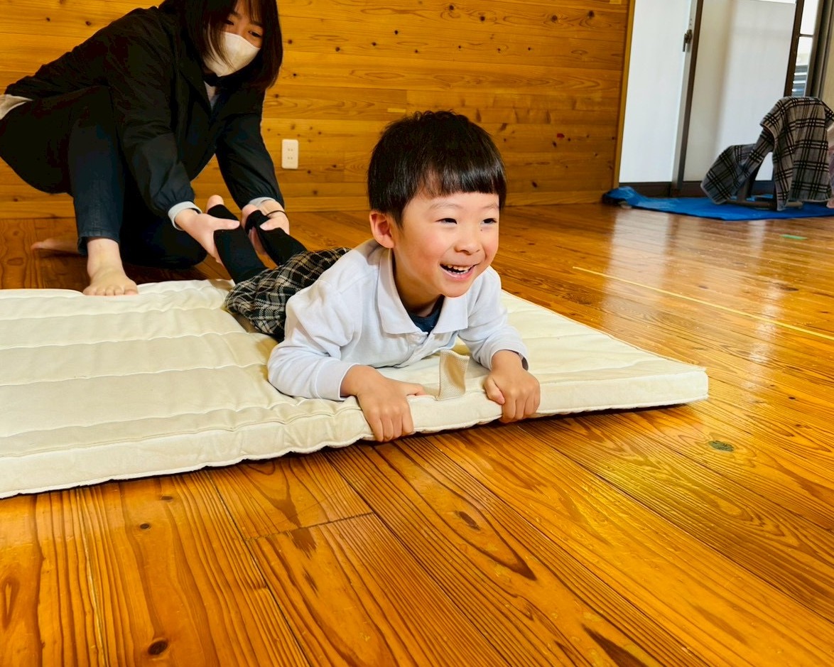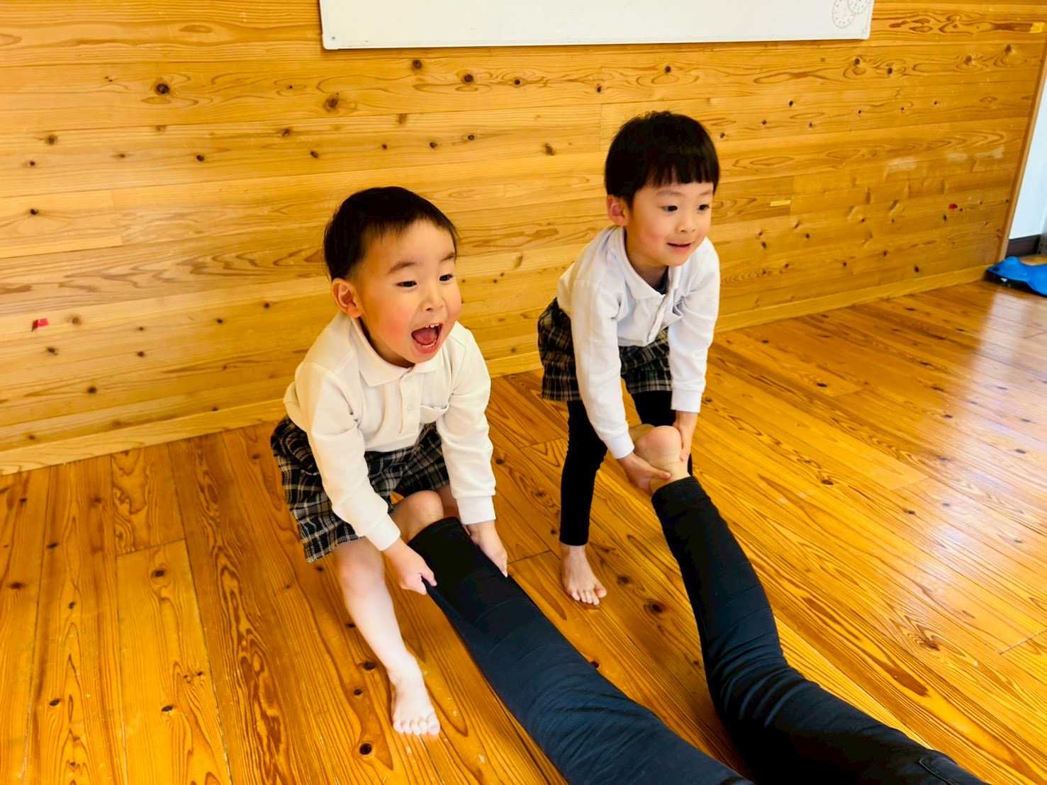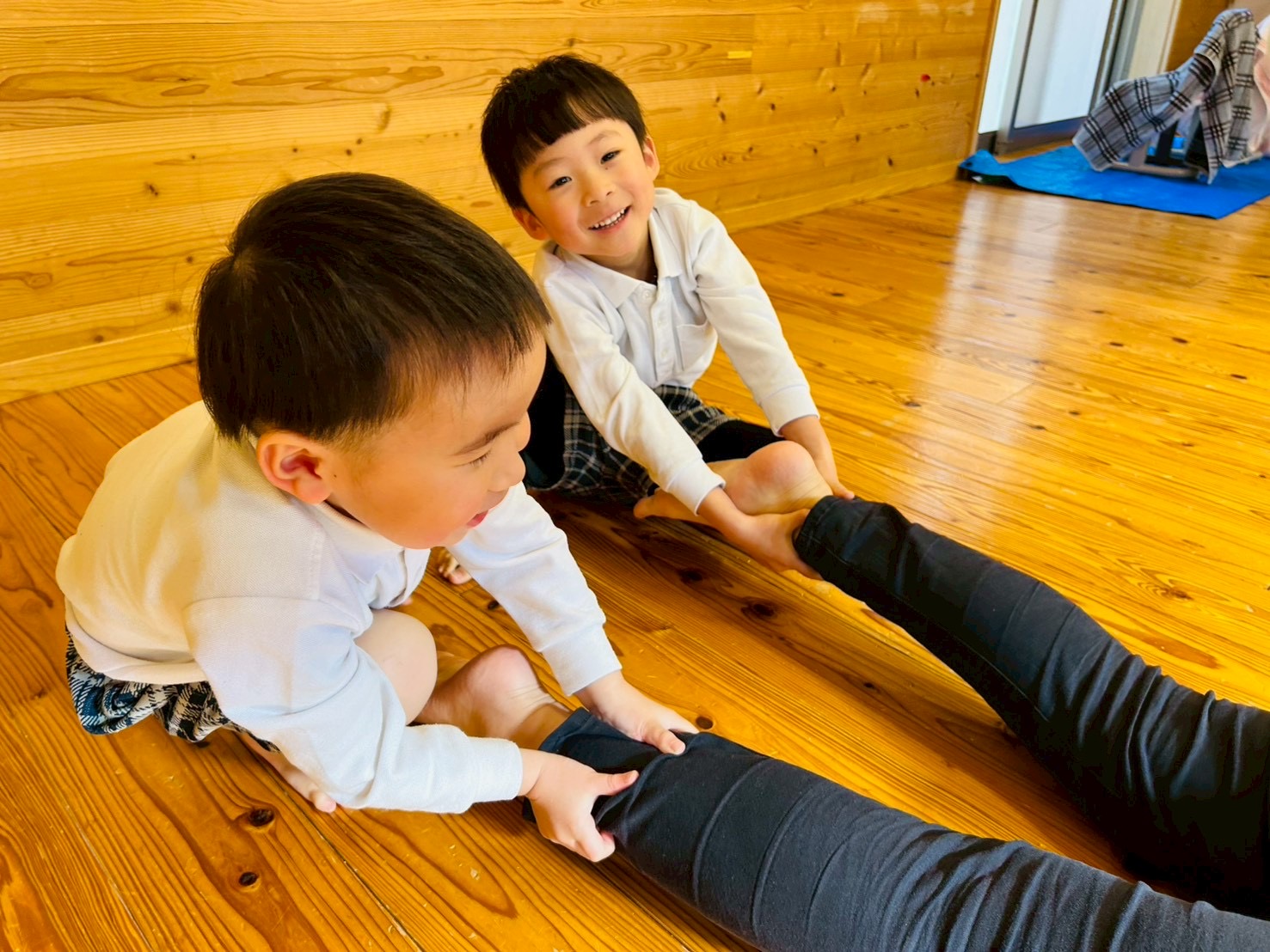 職員やお友だちの足を持って力強く引っ張ります。