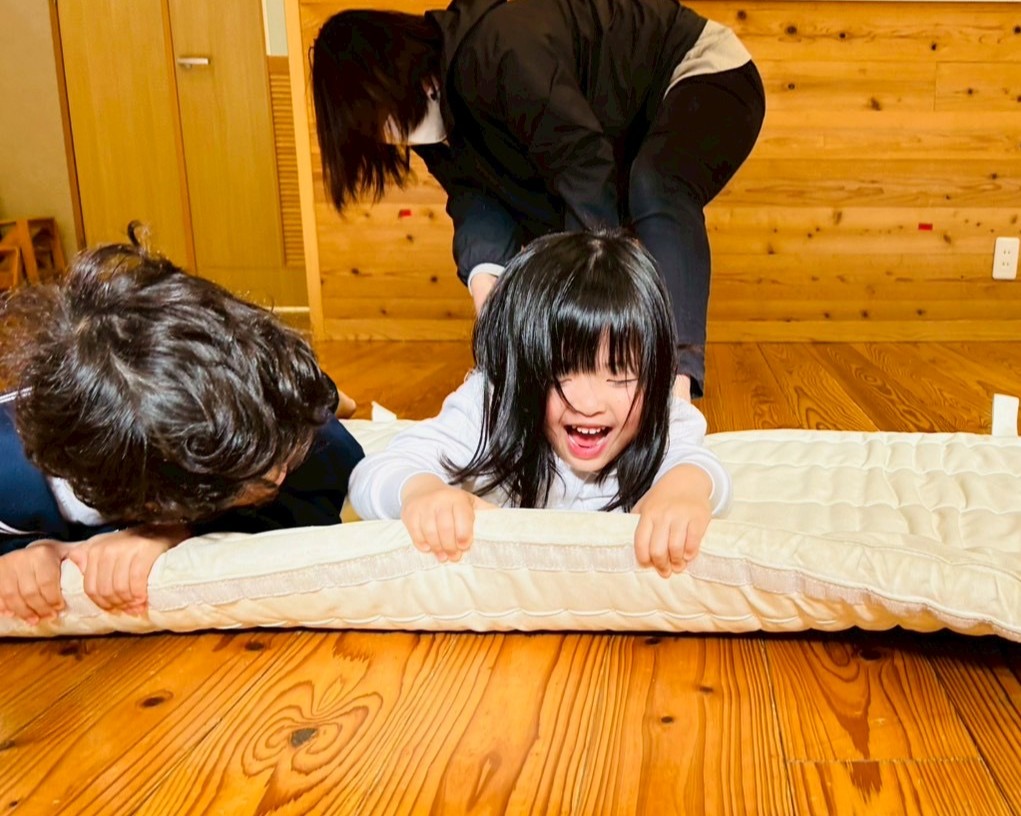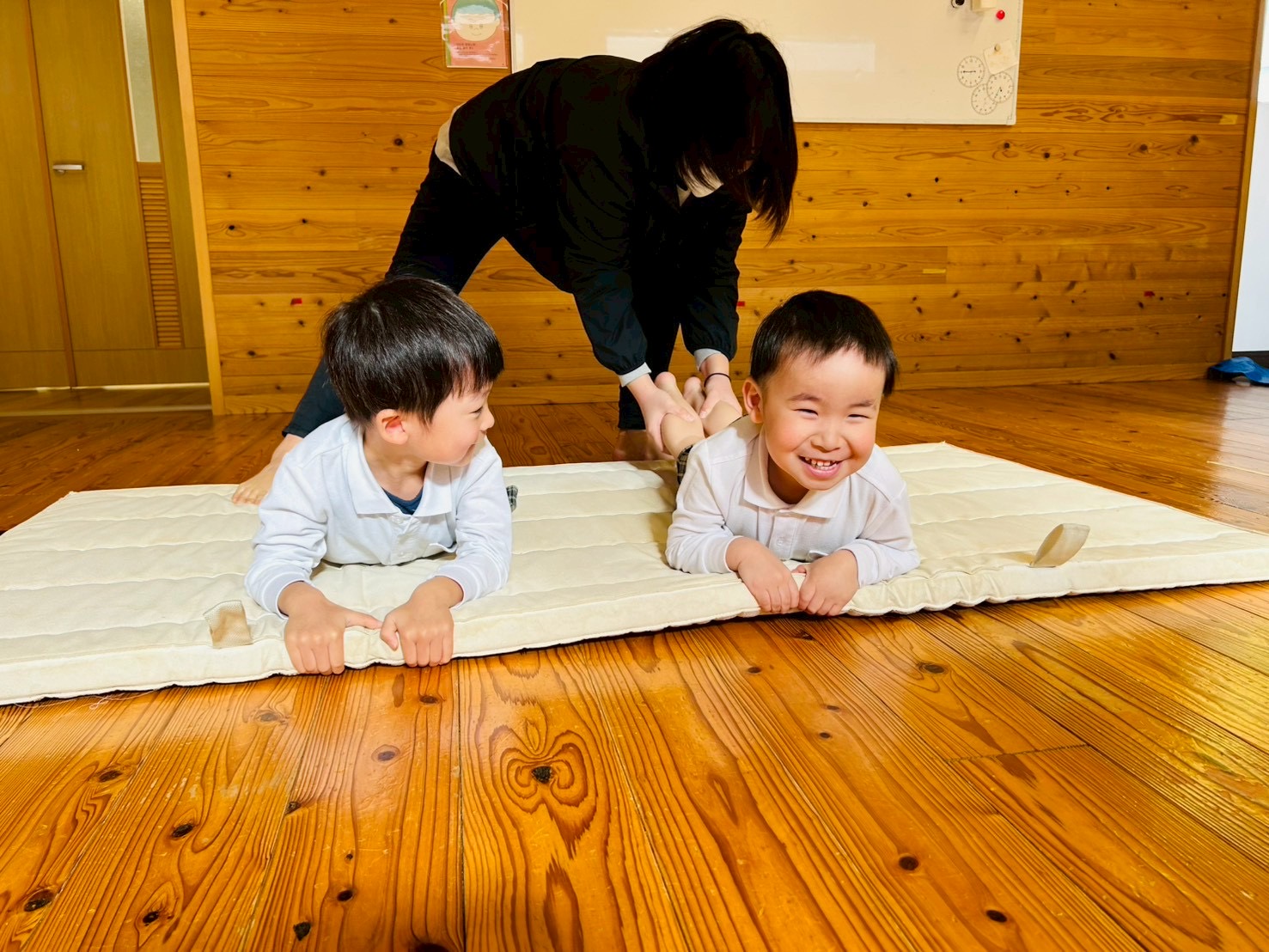 マットの上にうつ伏せになって足を引っ張られる大根役と大根を抜く役に分かれてゲームを行います!