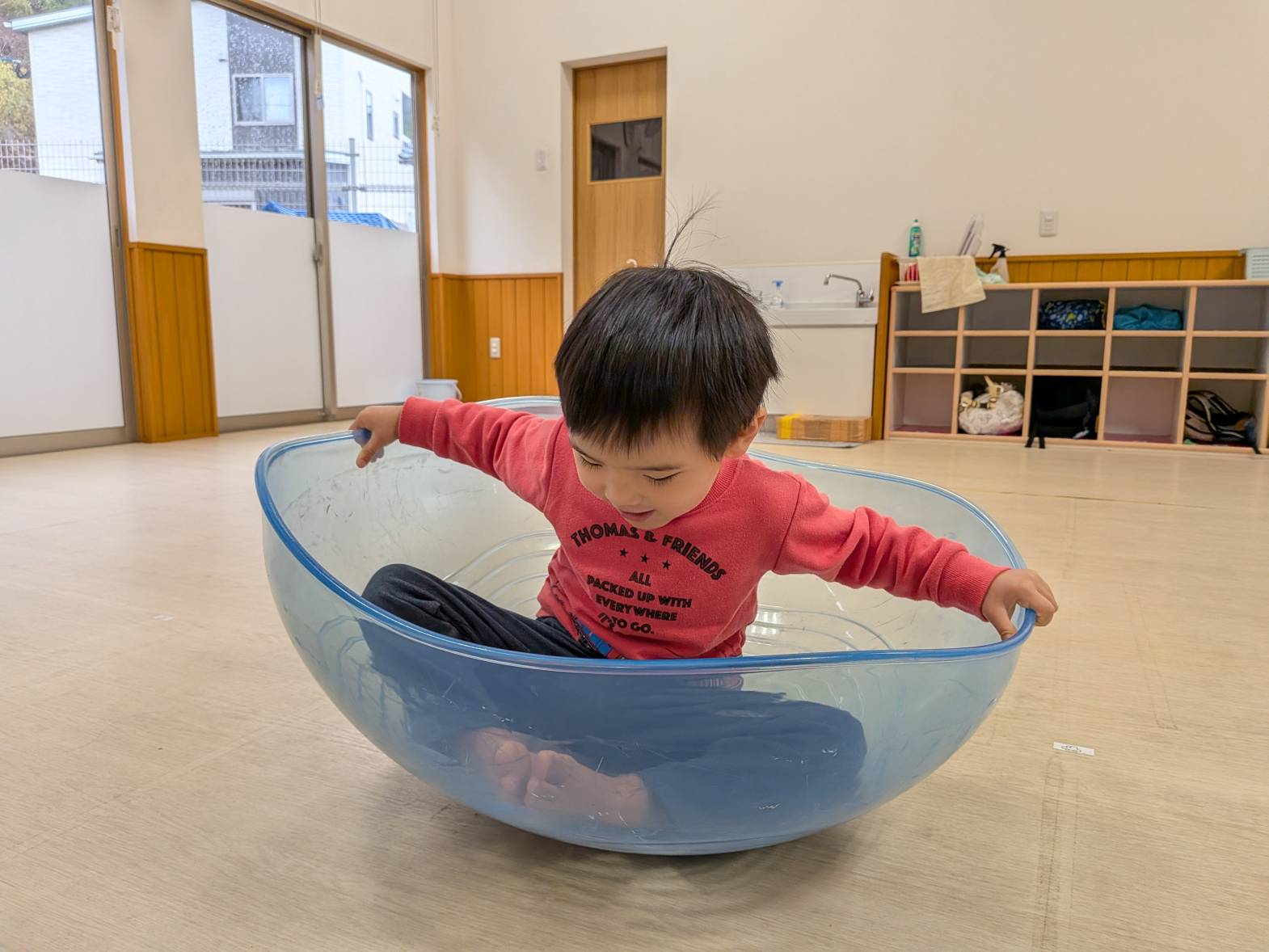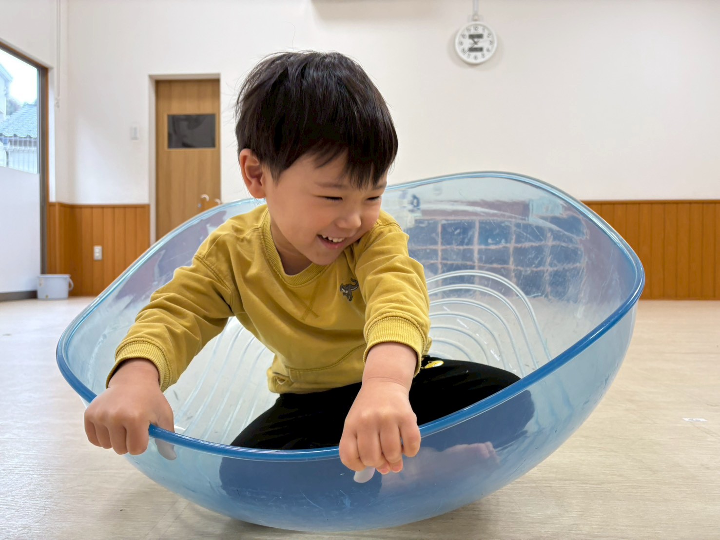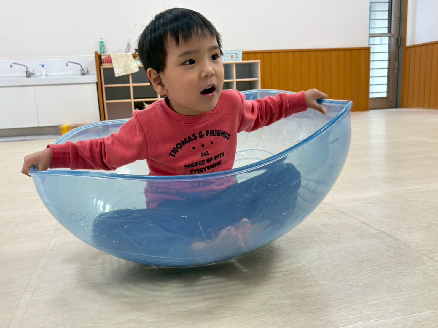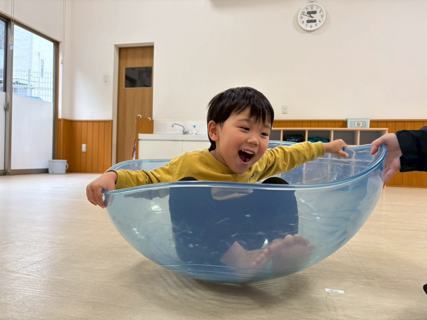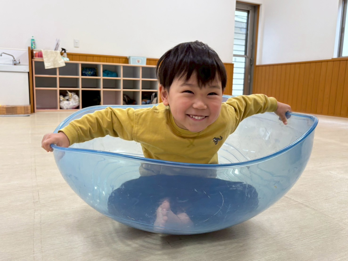 半球体の中に座って乗り、前後左右に重心を移動させて揺れを楽しむ子どもたち♪
