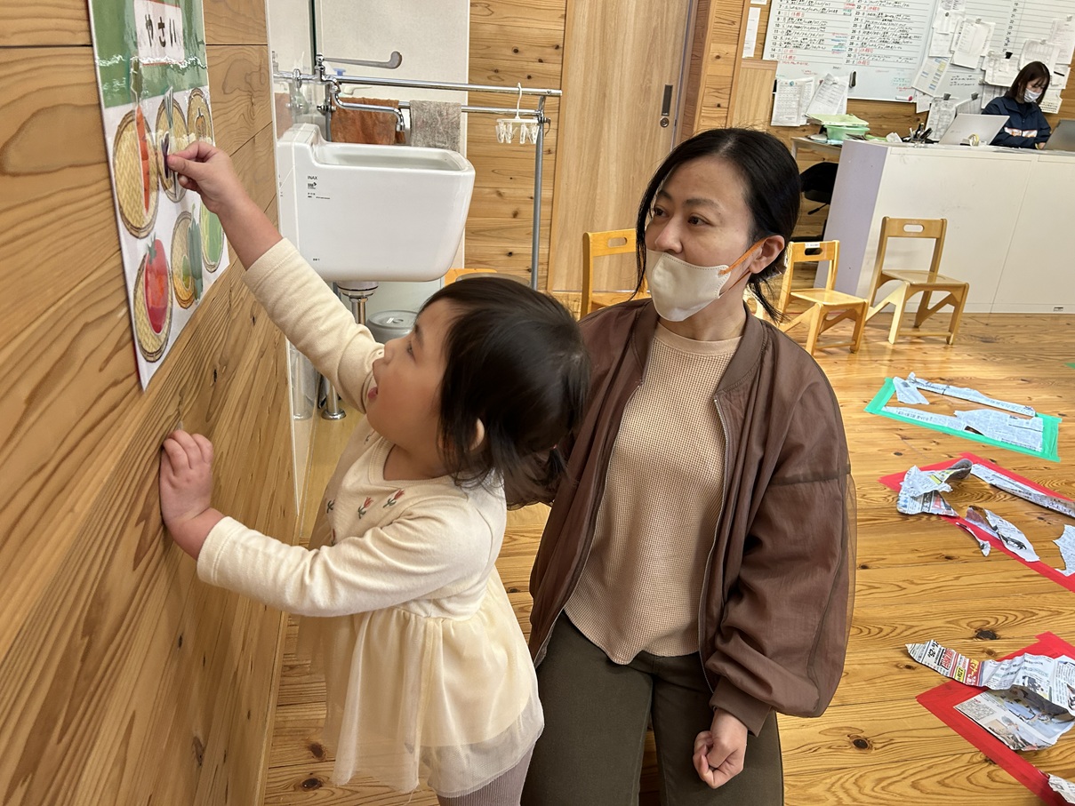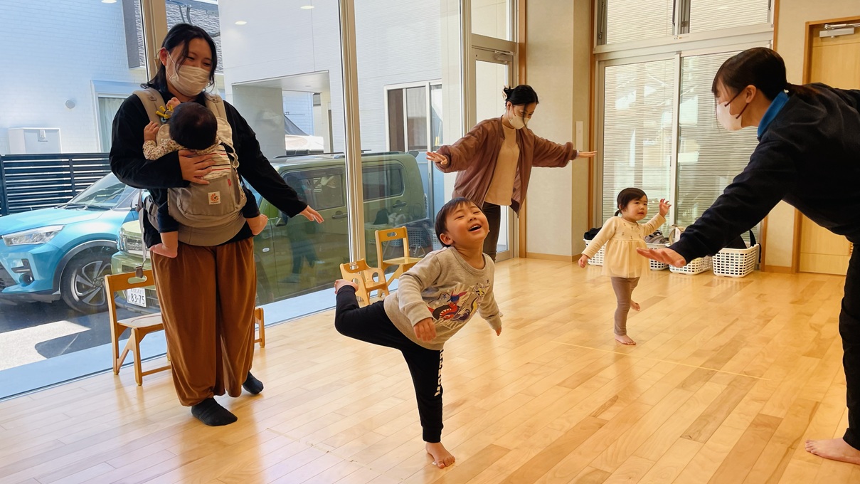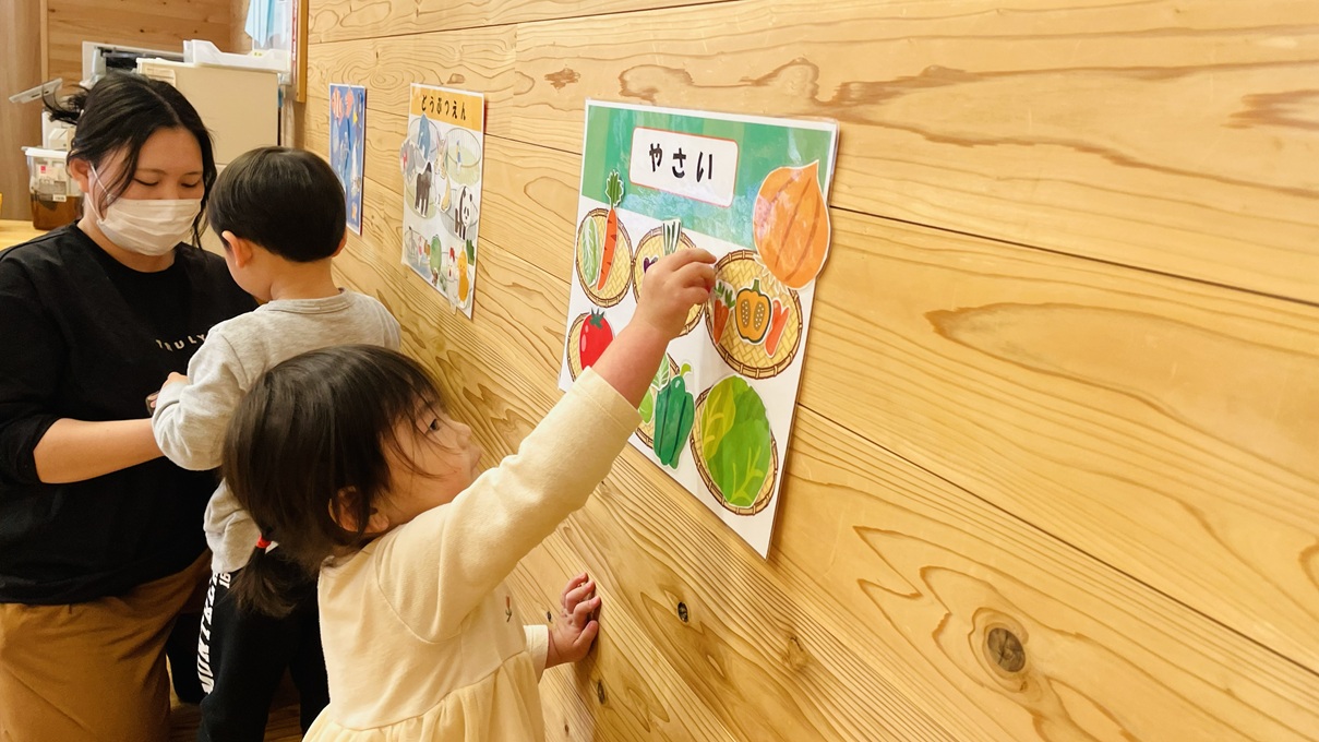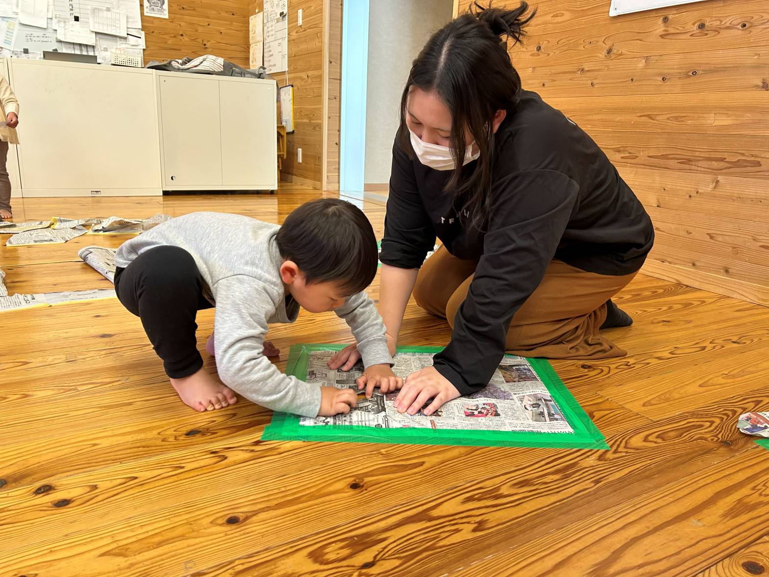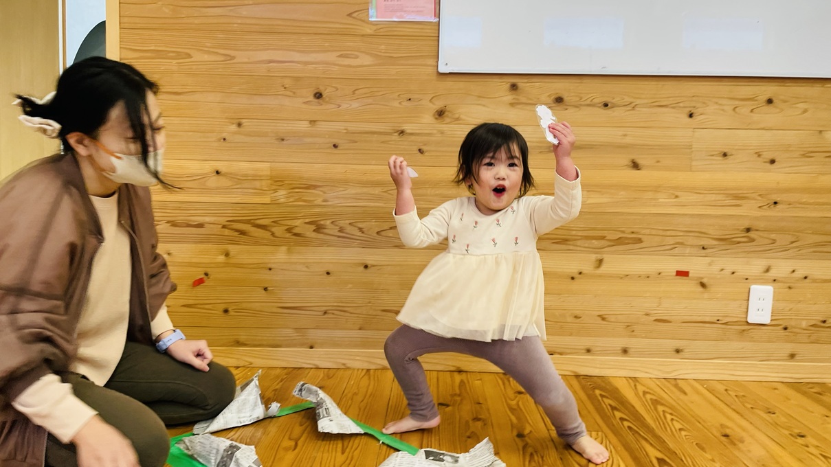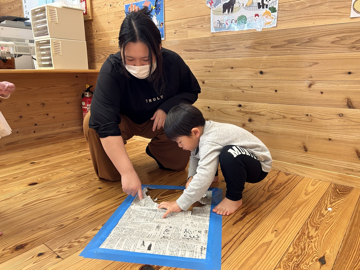 親子活動で新聞紙活動を行いました。 体操を行ったり、床に貼ってある新聞紙の下に隠れている動物や野菜、魚たちを探して仲間分けをしたりする活動に取り組んでいます! 見つけるごとに、「やったー!」、「いたー!」と大喜びする子どもたちでした!