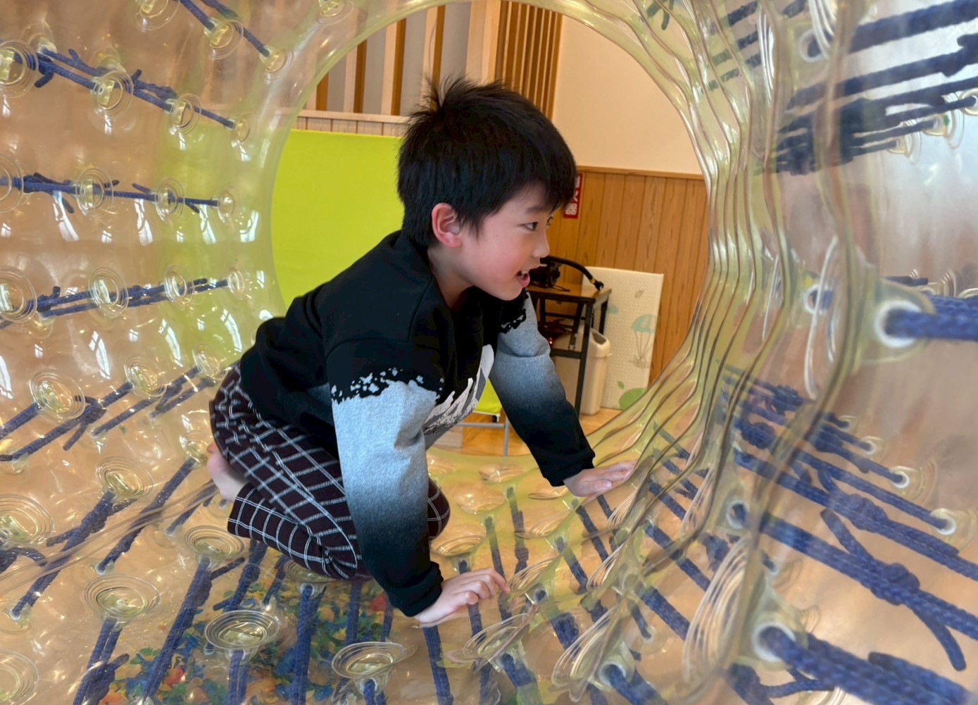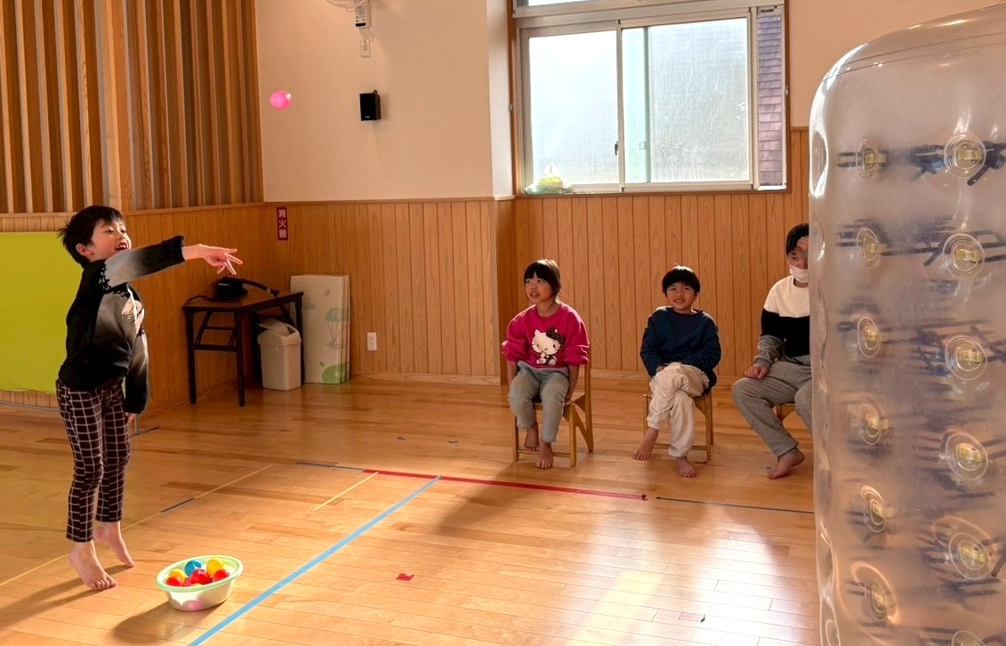 玉入れをしました! チームに分かれ、サイバーホイールの穴に玉を投げ入れていきます。 玉が多く入ったチームの勝ちというルールだったため、「絶対勝つ!」、「負けないから!」と意気込む子どもたち。 投げ入れる時は、腕を大きく振りかぶって投げたり、跳びながら投げたりする姿が見られましたよ。 負けても勝っても笑顔で取り組むことができましたよ。 最後は、サイバーホイールに乗りました。 揺れたり押したりしながら自分の好きな乗り方で楽しむ子どもたちでしたよ。
