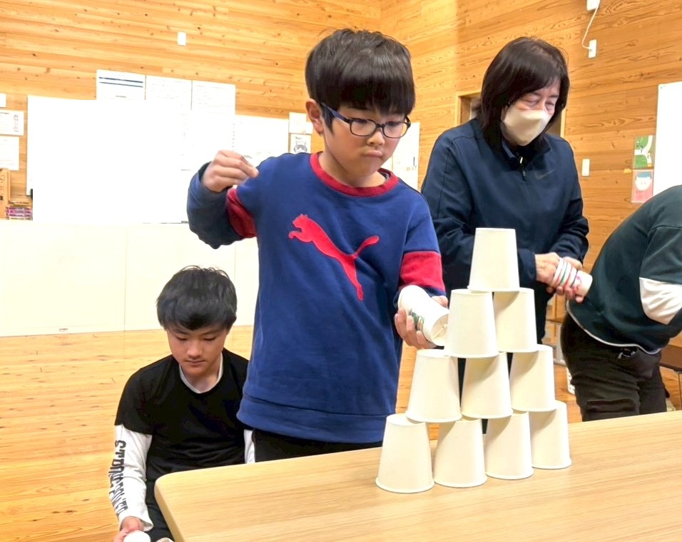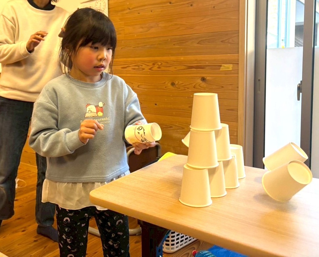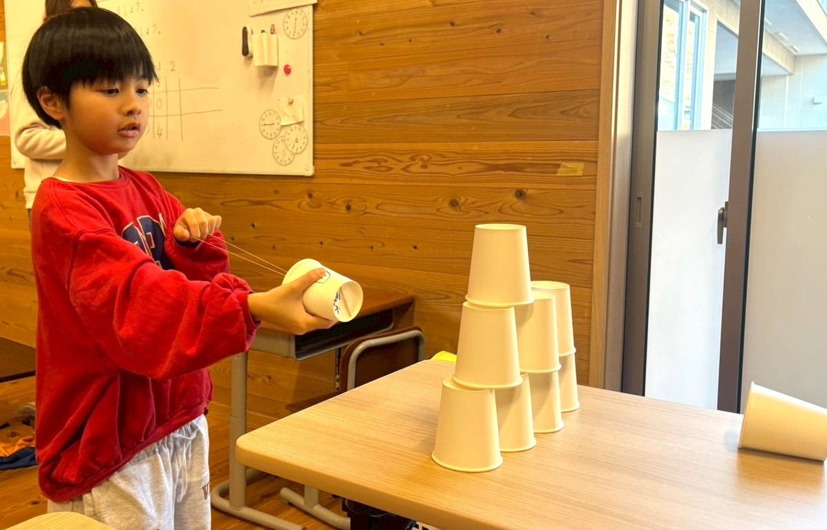 射的をしました! 紙コップで作った射的を使って、紙コップタワーを倒します。 最初は、輪ゴムを引っ張る力加減、狙う位置に苦戦する姿がありましたが、練習する中で、「全部倒れたよ!」と慣れてくる子どもたち。 お友だちとの勝負でも、「おしかったね。次頑張ろう。」、「5個倒したのすごいね!」とお互いに励まし合ったり、もっとたくさん倒そうと頑張ったりする姿が見られましたよ!